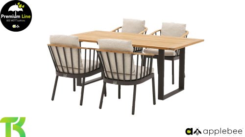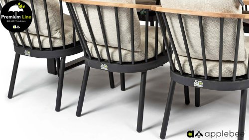 The Apple Bee Condor dining set has a sleek, robust look. This is reflected in both the chair and the table base. The set's base is made of matte black powder-coated aluminum, which is used in robust dimensions. The BEE WETT® cushions have a coarse weave, yet offer a soft touch for optimal comfort. Combined with the beautiful curves in the chair's back and the use of natural teak in the tabletop and armrests, the Apple Bee Condor still has a pleasant touch of natural warmth.