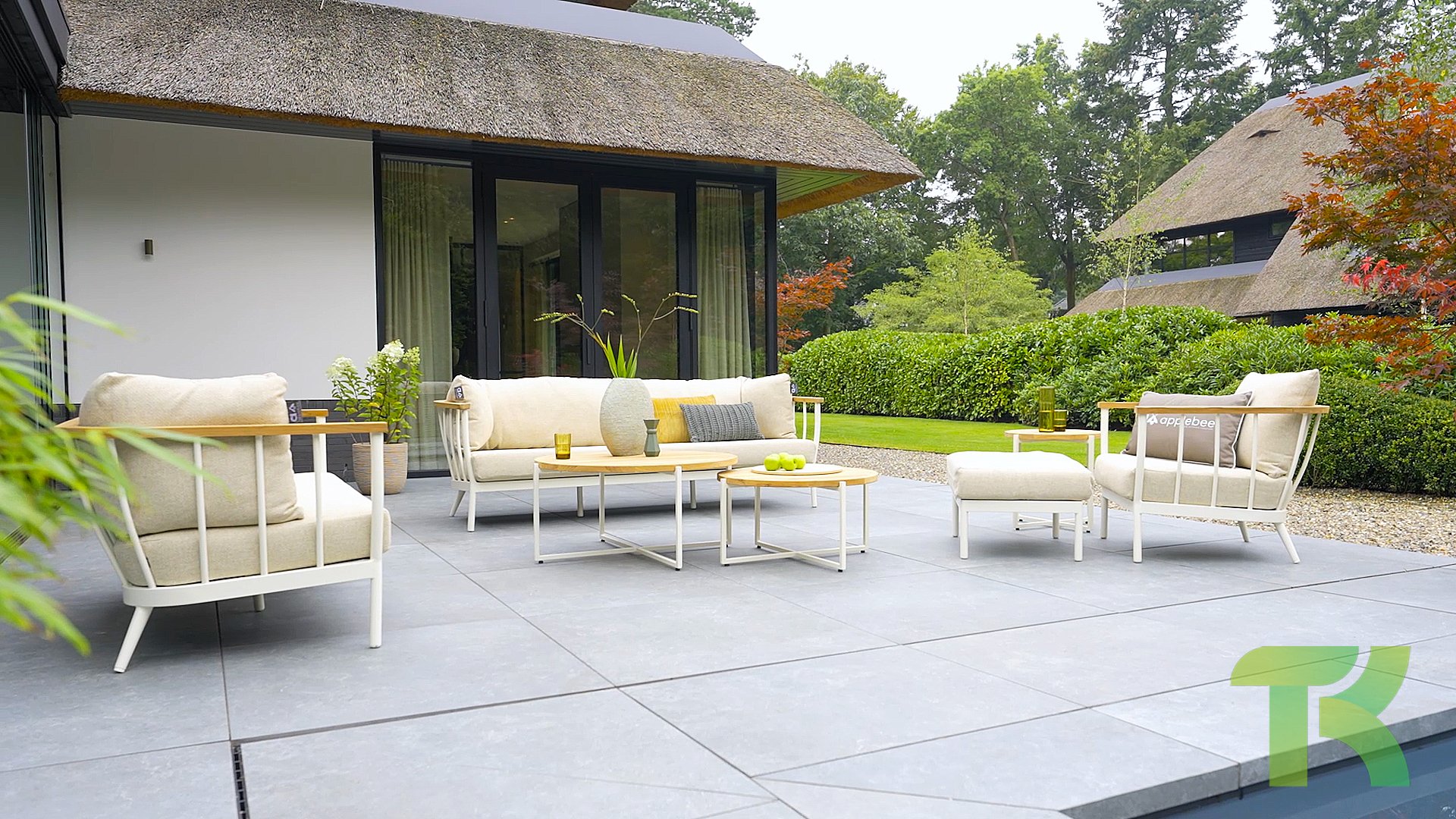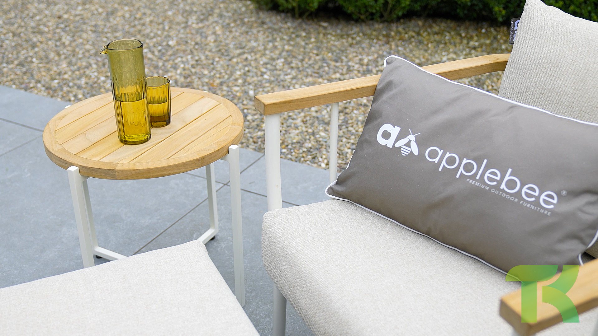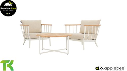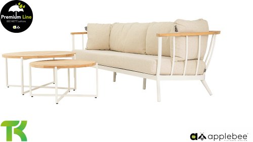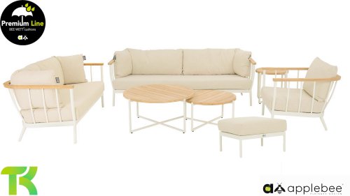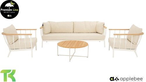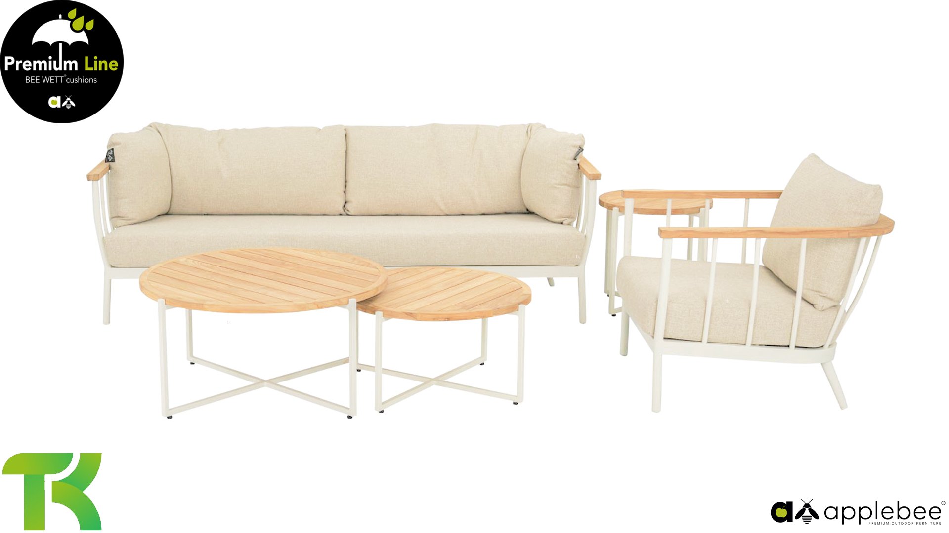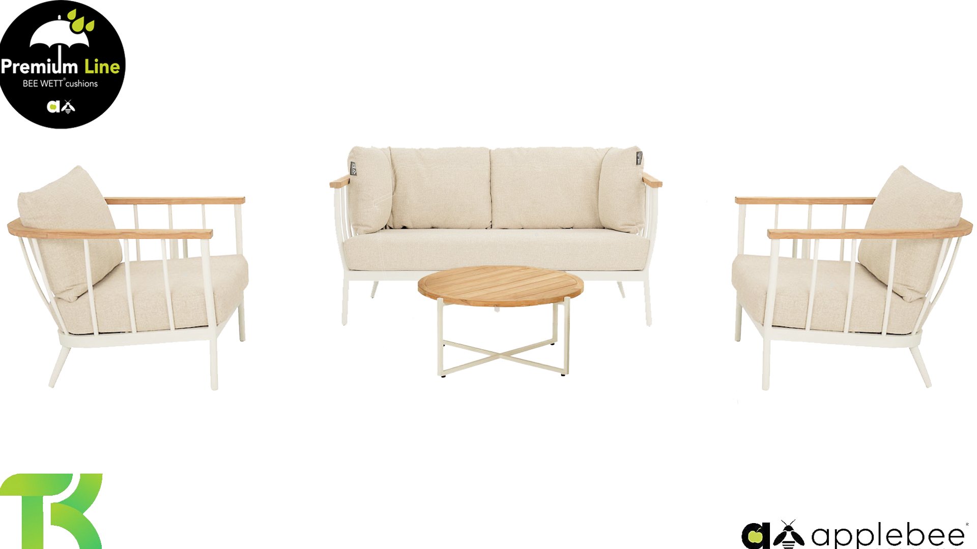 The Apple Bee Condor Lounge Set boasts an elegant look, reflected in both the lounge chair and the 2- and 3-seater sofas. The set's base material is Oyster-colored powder-coated aluminum, which is used in robust dimensions. The BEE WETT® cushions have a wonderfully soft touch for optimal comfort. Combined with the beautiful curves in the back and the use of natural teak in the tabletop and backrests, the Apple Bee Condor Lounge still has a pleasant touch of natural warmth.