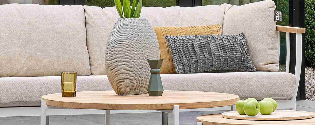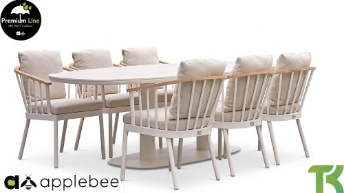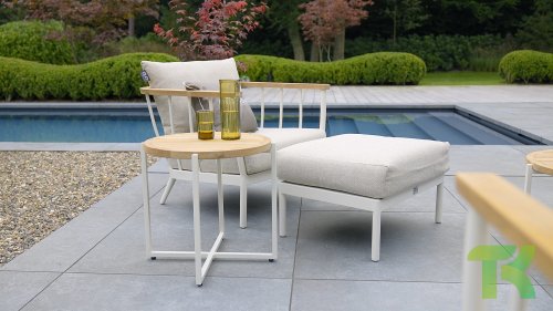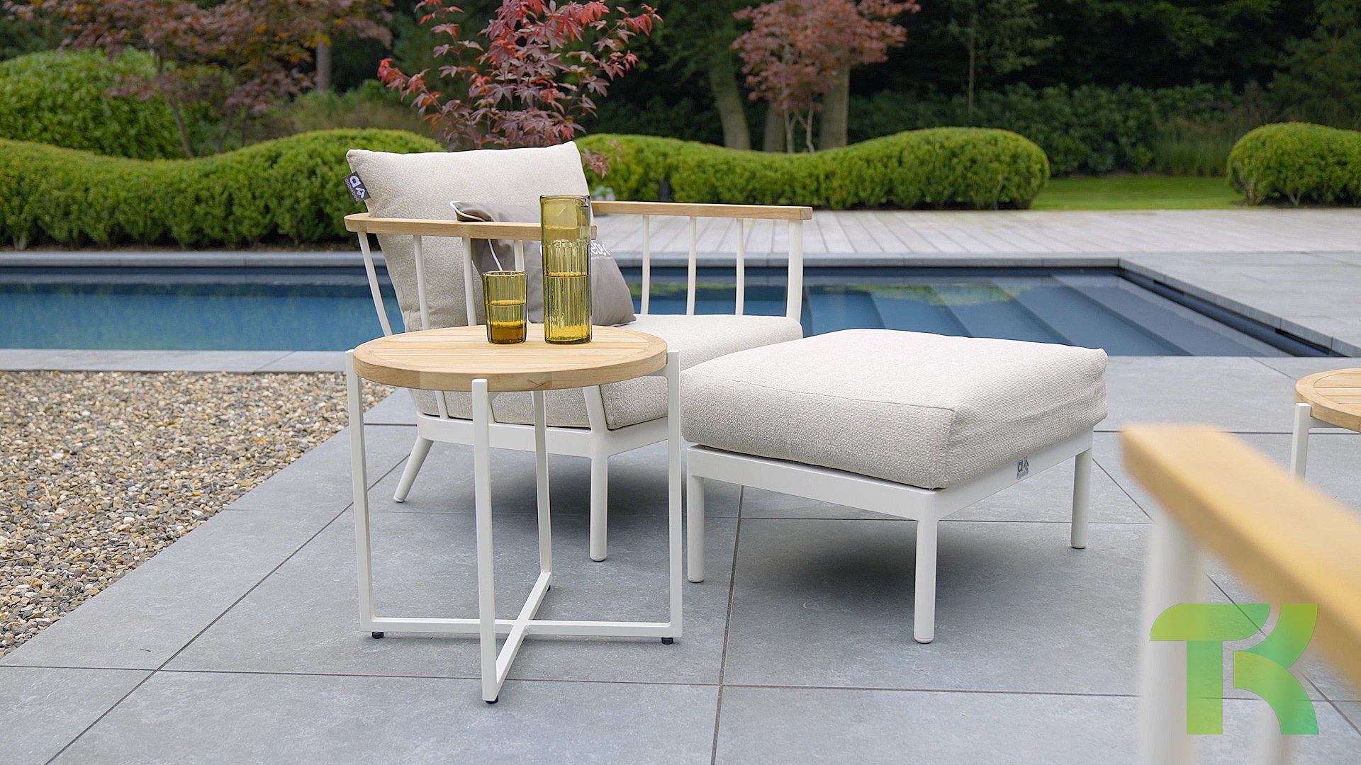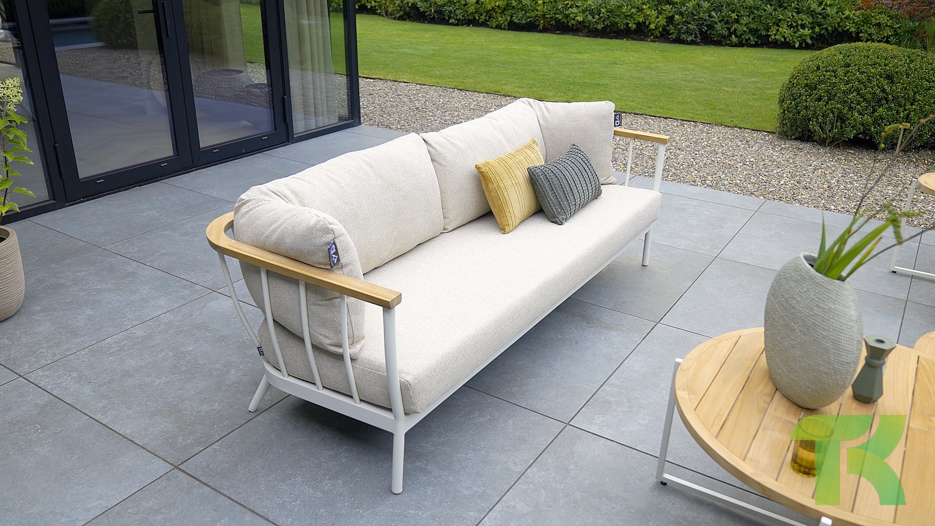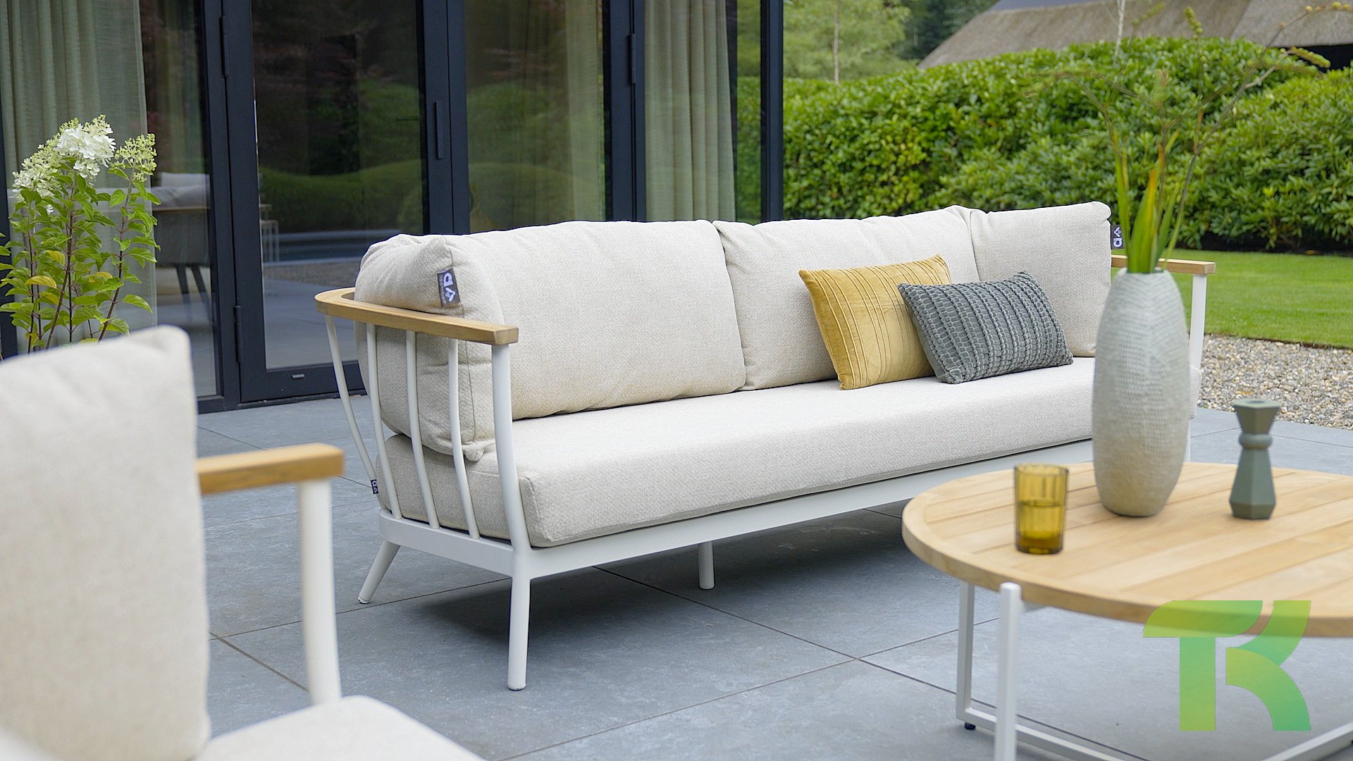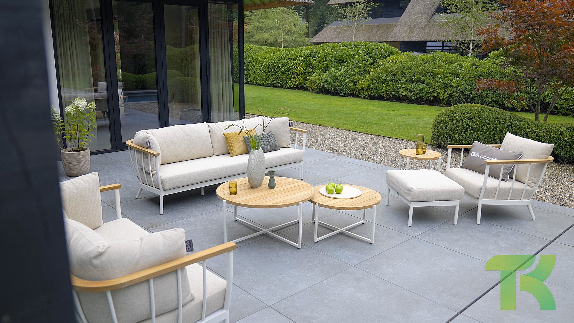 The Apple Bee Condor Lounge Set boasts an elegant look, reflected in both the lounge chair and the 2- and 3-seater sofas. The set's base material is Oyster-colored powder-coated aluminum, which is used in robust dimensions. The BEE WETT® cushions have a wonderfully soft touch for optimal comfort. Combined with the beautiful curves in the back and the use of natural teak in the tabletop and backrests, the Apple Bee Condor Lounge still has a pleasant touch of natural warmth.