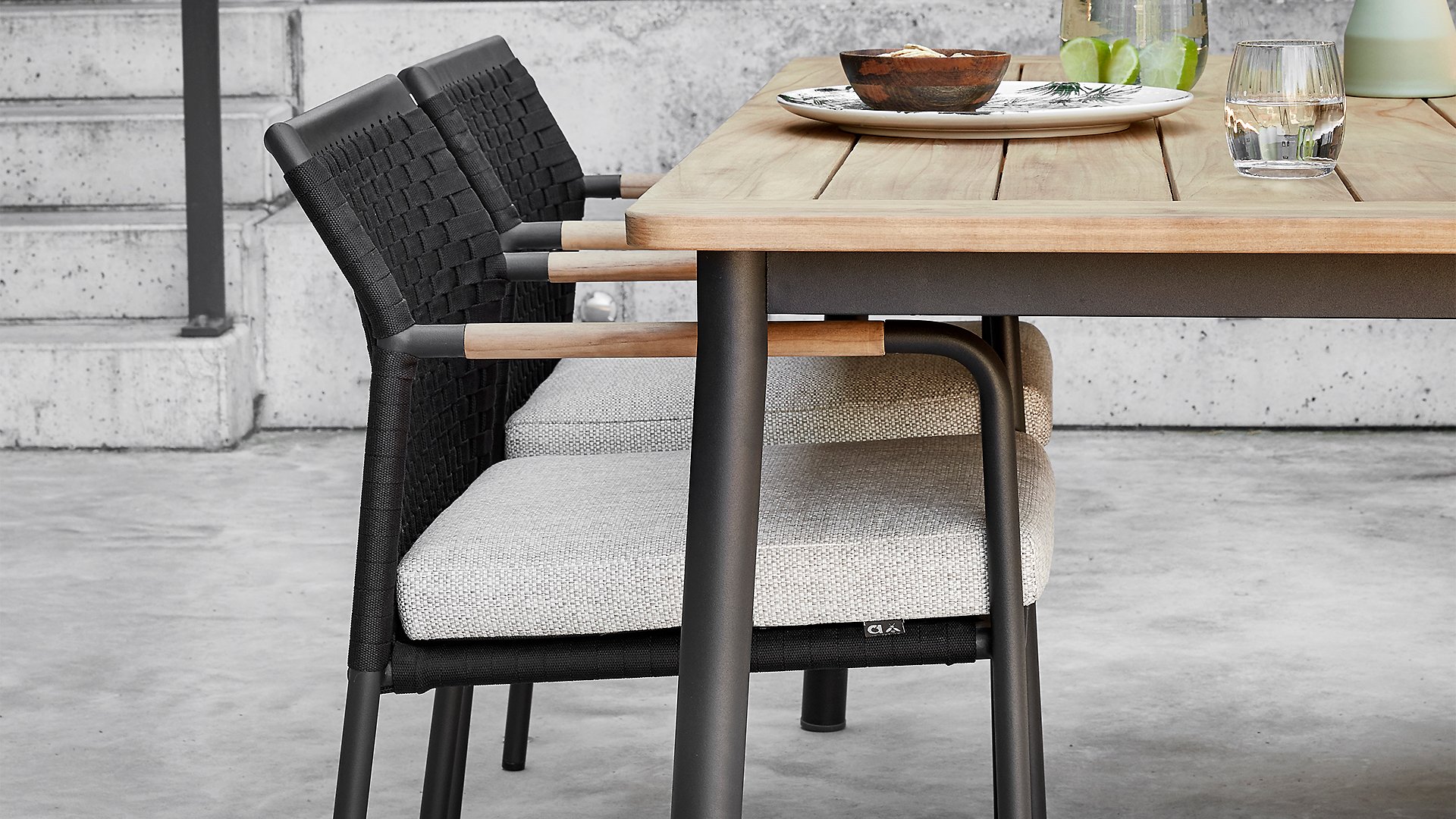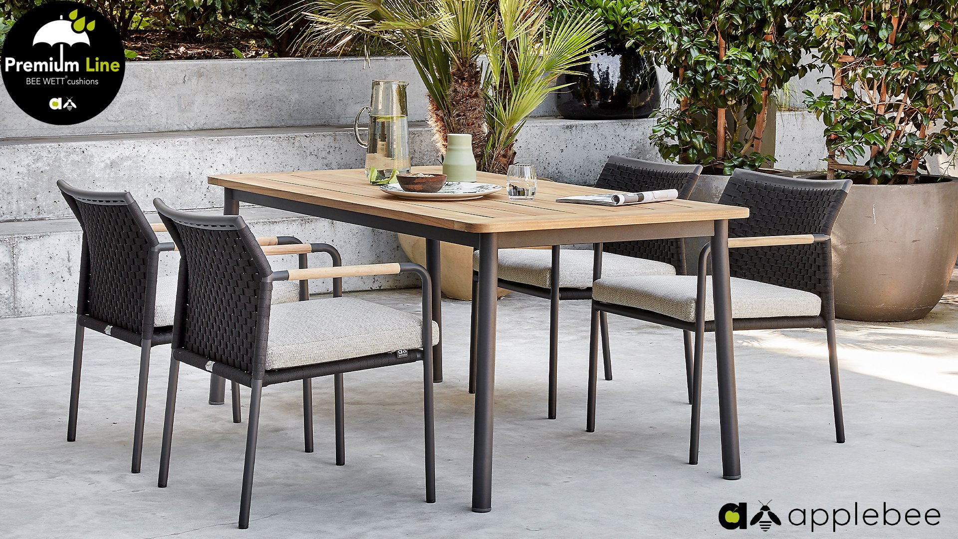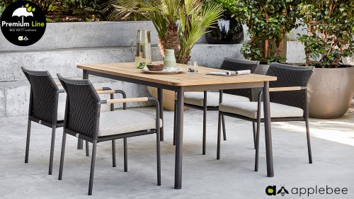 The Apple Bee Elle table, a minimalist yet beautiful design by AppleBee. This table is part of the Elle dining series, where the choice of the garden chair made of rope or aluminum is evident. The chair features teak armrests that naturally match the wood of the table. The bases of the Elle series come in a matte black color.