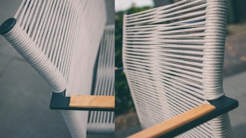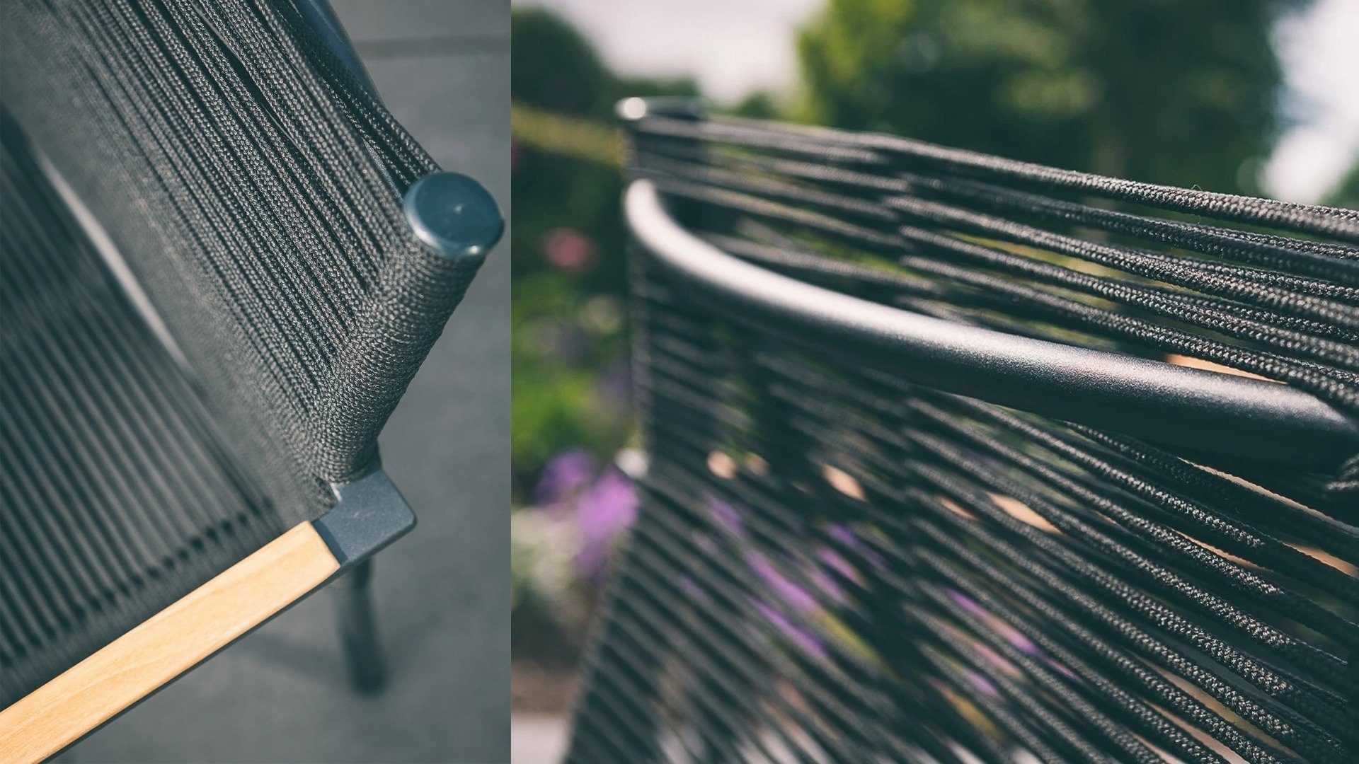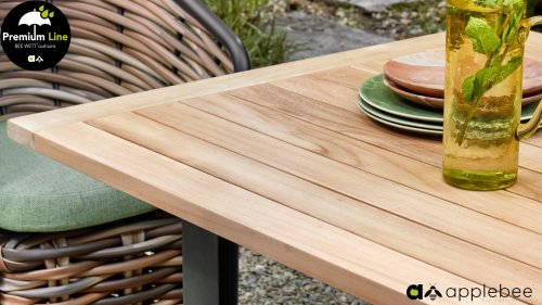The Apple Bee Jakarta dining series consists of stackable chairs in 4 colors combined with the matching round or square table. The black frame, in combination with the rope and warm teakwood, creates a modern style with a "natural touch". The Apple Bee Jakarta Dining is truly a feast for the eyes! The beautiful frames are made of aluminum with a black coating. In this frame, a beautiful rope wire is woven with a soft and comfortable look. The beautiful shapes keep this modern design perfectly balanced. This beautifully finished garden set from AppleBee has a minimalist design with nice details.