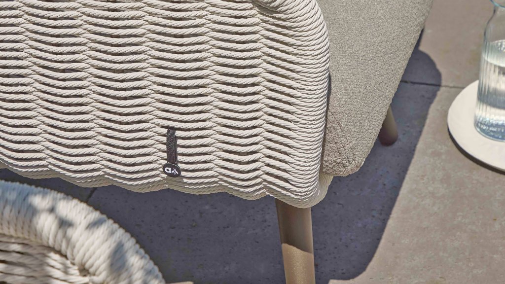 A refined design with character. The Key Largo immediately stands out with its beautiful contrasts. The powder-coated aluminum frame in a chic Bronze color forms a sturdy yet elegant base. The Biculair® wire is woven seamlessly in a single, curved line all the way to the seat. This wickerwork, with the look of luxurious rope, gives the set a rustic, bohemian character that will look great in any garden.