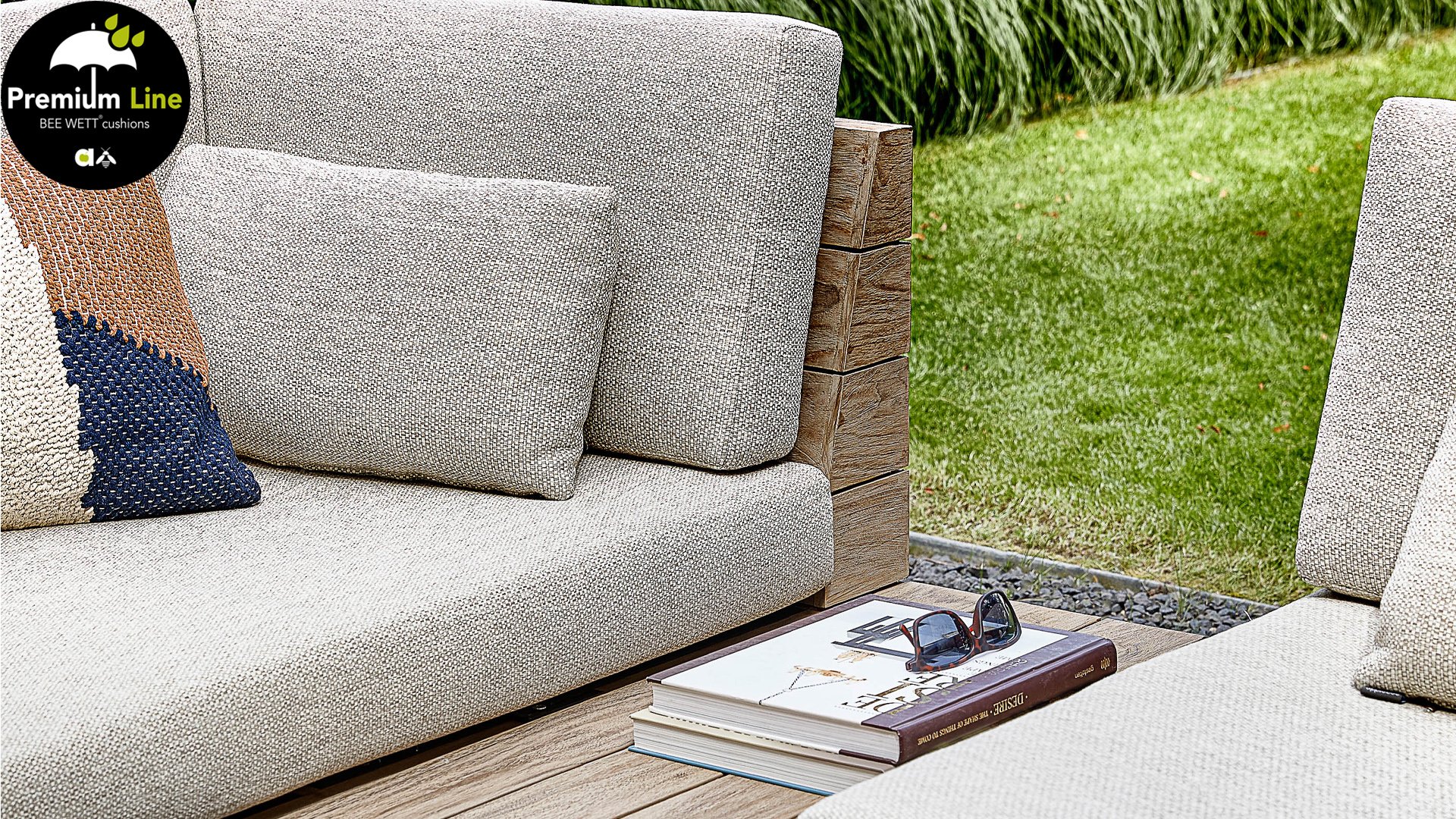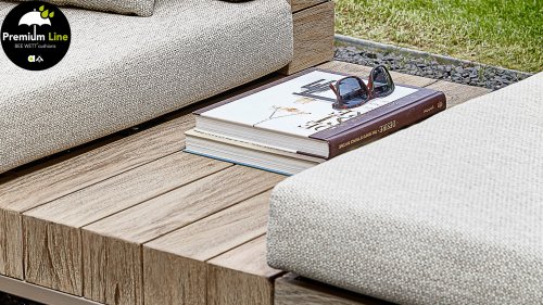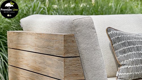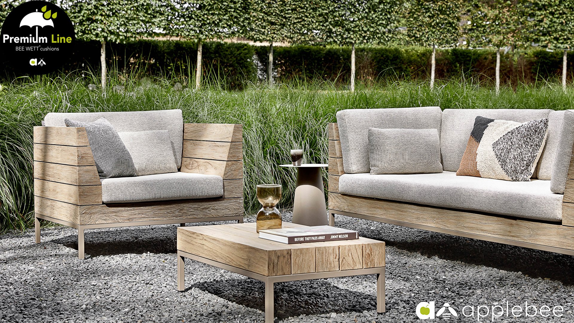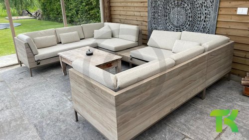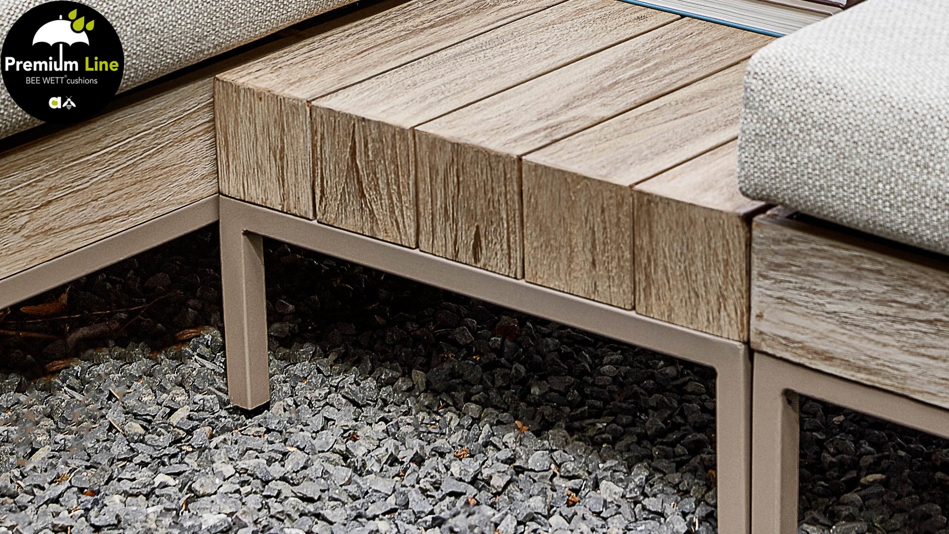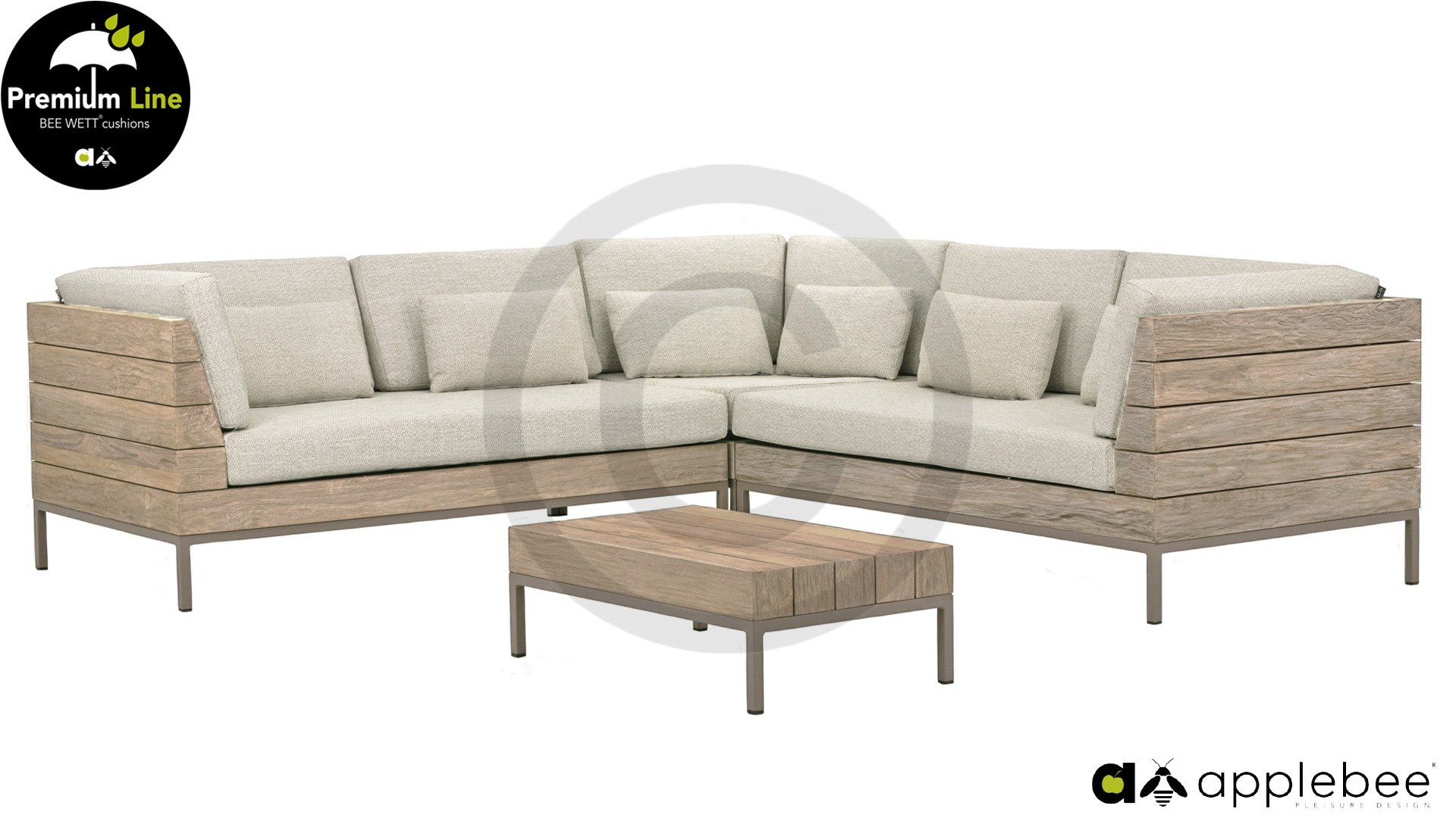 Applebee Long Island Lounge Set Coastal: Robust teak beams fused into a rugged and timeless lounge furniture. The Applebee Long Island Lounge will certainly not go unnoticed in your garden or on your terrace, in any configuration! The Coastal finish applied to the teak gives this set a very stylish character. The narrow gaps between the teak slats guarantee the clean lines that run across the furniture. The slim taupe aluminum frame at the bottom of the lounge set provides contrast with the sturdy top. The Natural Bee Wett cushions complete the whole.