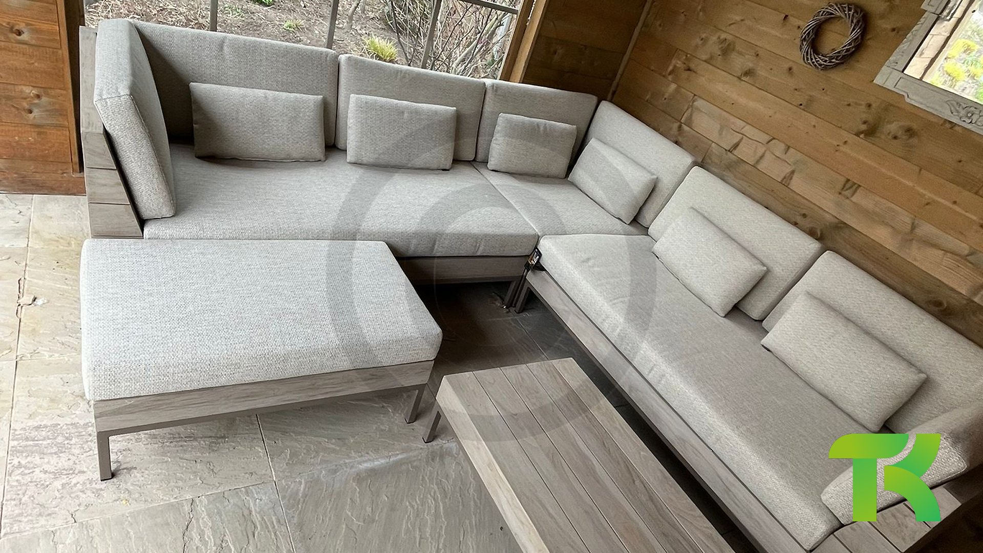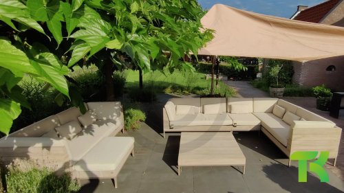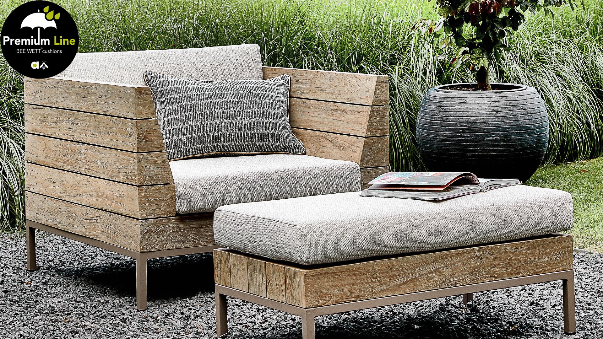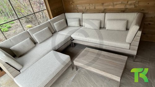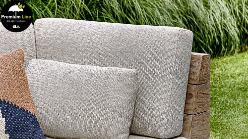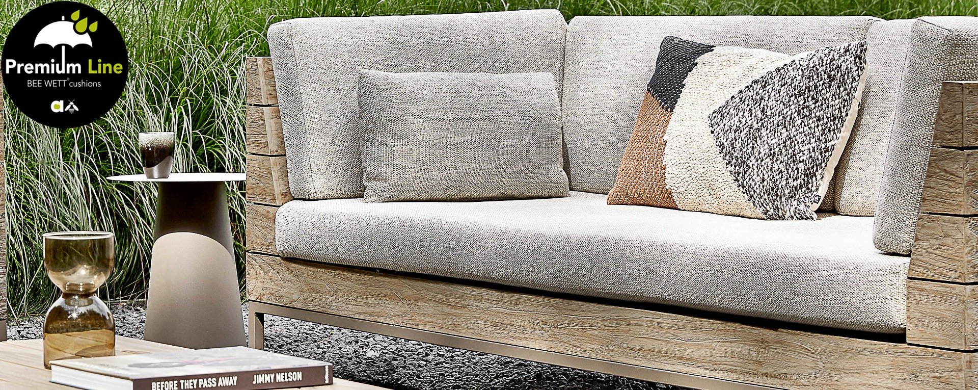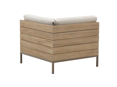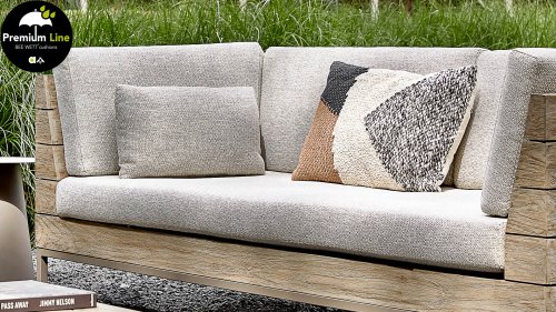 Applebee Long Island Lounge Set Coastal: Robust teak beams fused into a rugged and timeless lounge furniture. The Applebee Long Island Lounge will certainly not go unnoticed in your garden or on your terrace, in any configuration! The Coastal finish applied to the teak gives this set a very stylish character. The narrow gaps between the teak slats guarantee the clean lines that run across the furniture. The slim taupe aluminum frame at the bottom of the lounge set provides contrast with the sturdy top. The Natural Bee Wett cushions complete the whole.