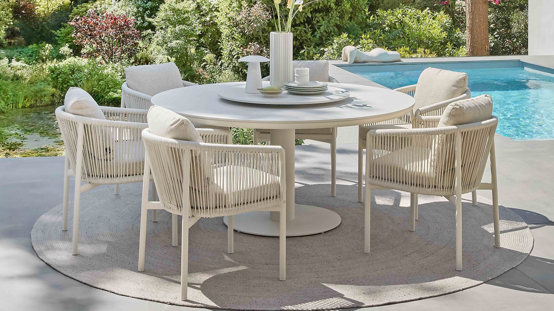 This Oyster Lazy Susan is part of the Apple Bee Melville 160cm Oyster garden table. The rotating platform is made of sintered stone, which is scratch- and weather-resistant. It adds a nice touch to the table and is also functional during meals, for example, when you want to pass something to the person across from you.