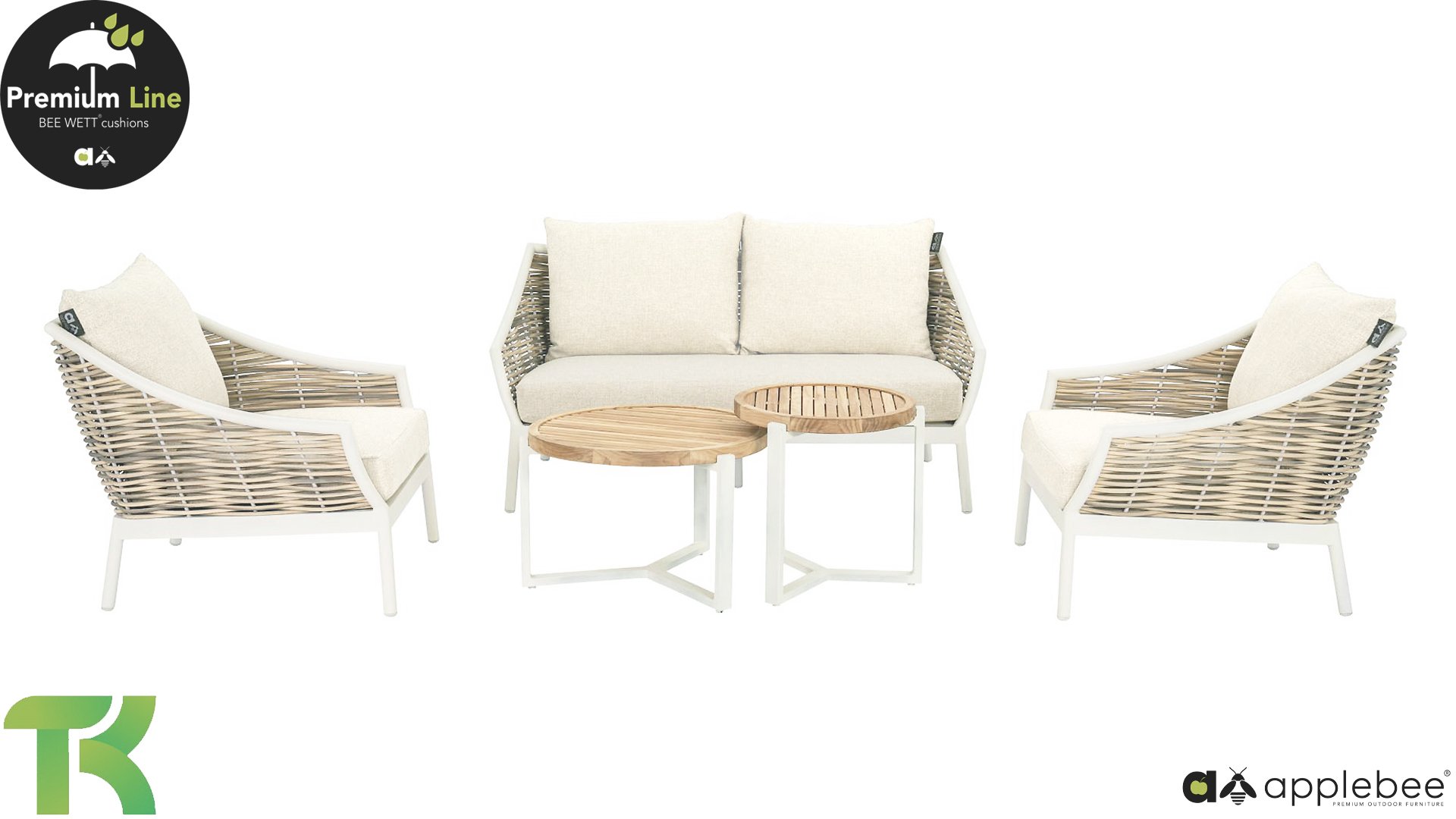 Apple Bee is characterized by the use of special Biculair® wickerwork, originally developed for professional applications in the hospitality industry. This Biculair® wickerwork is a lifelike, sustainable alternative to rattan. This highly durable synthetic rattan fiber (HDPE) is completely weatherproof, colorfast, recyclable, and therefore an environmentally friendly choice. The appearance and performance of the furniture remain unaffected by European weather conditions, and the colors retain their natural vibrancy. The superior quality of this wickerwork, verified by the Netherlands Organisation for Applied Scientific Research (TNO), is clearly demonstrated compared to other comparable materials.