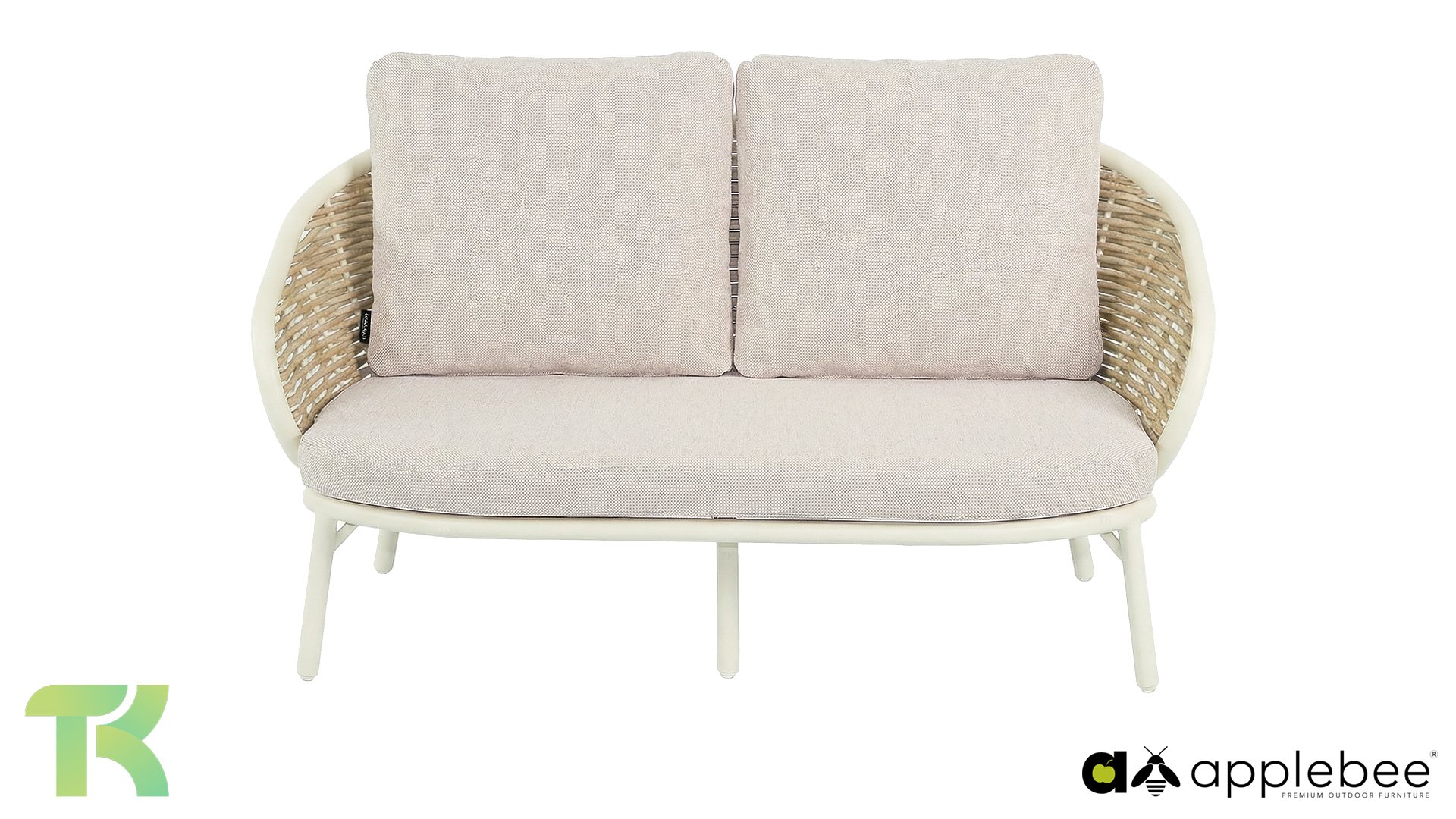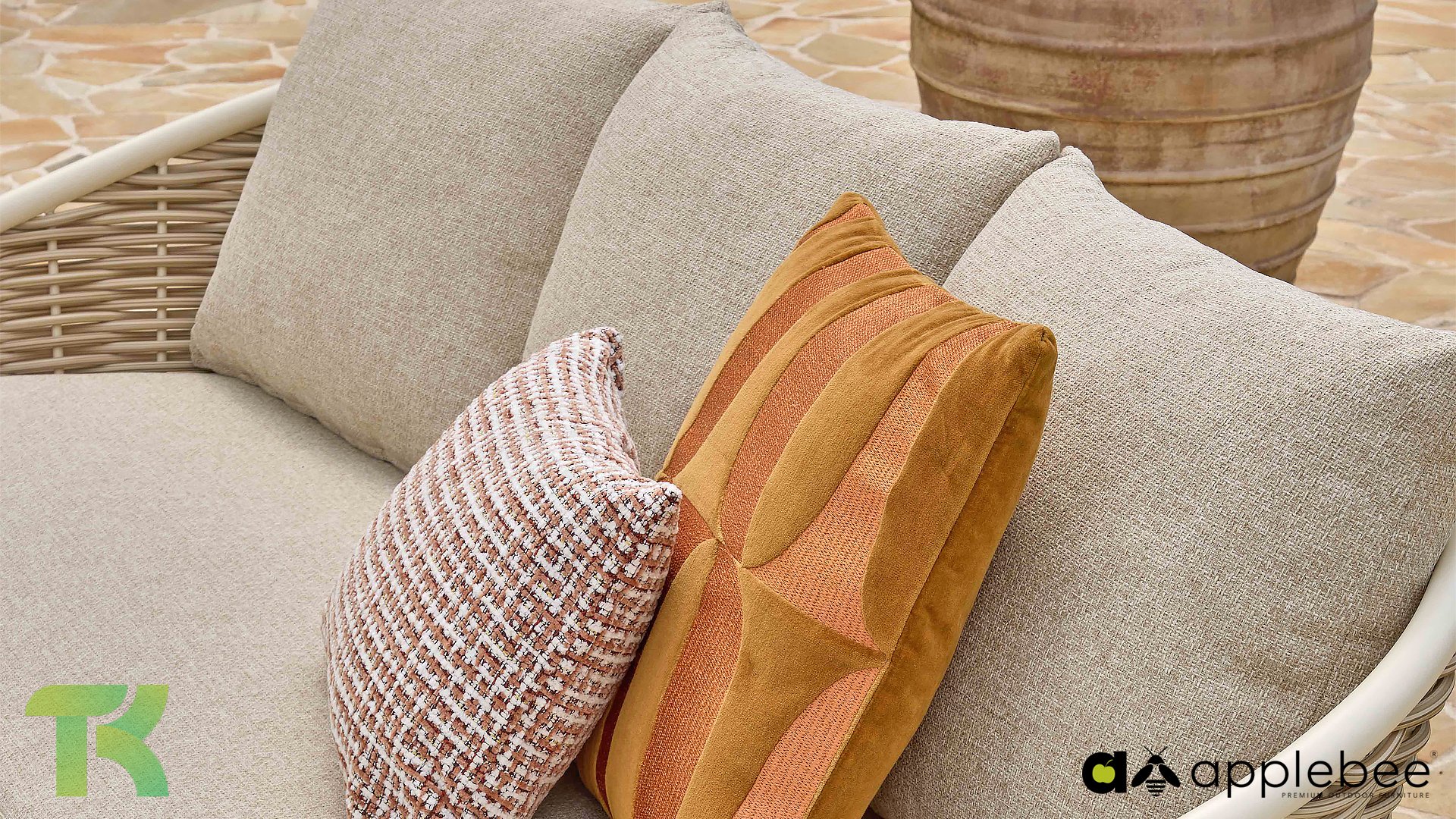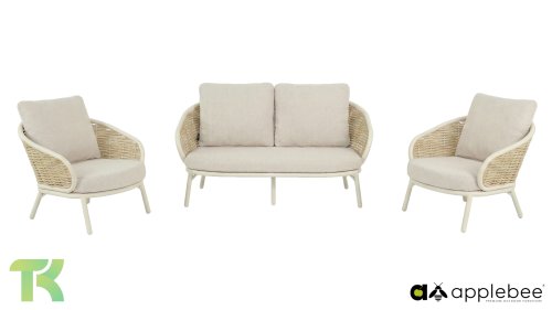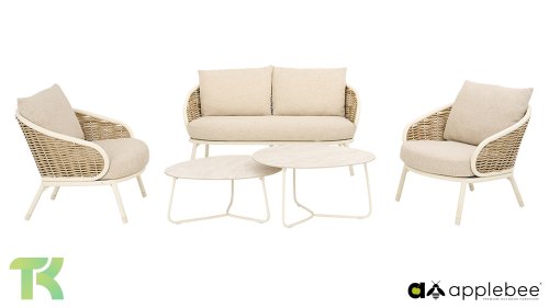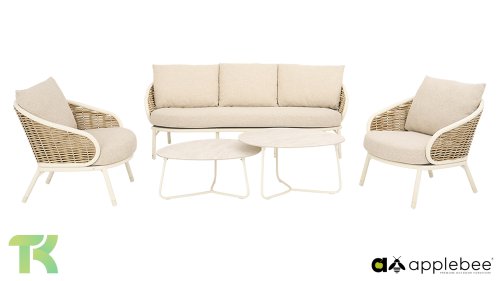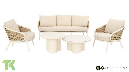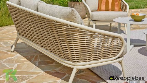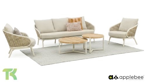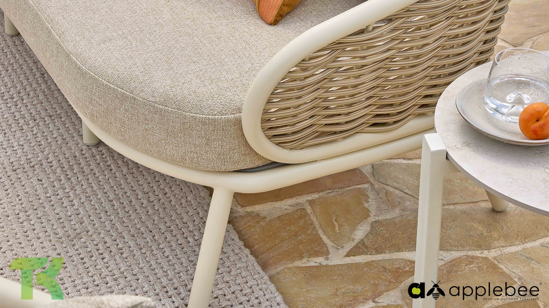 The foundation of this set is a refined frame of powder-coated aluminum in the stylish Oyster color. This not only creates a chic, matte finish but also guarantees longevity. The frame is beautifully complemented by the robust wickerwork in a light Seashell shade. The thick threads are ingeniously woven, creating an airy and spacious effect that fits perfectly in a modern garden. Worry about rain showers is a thing of the past. The Pine Key is equipped with innovative BeeWett® technology. These premium cushions, in the soft Cotton Flower color, are weather-resistant, dry quickly, and offer unparalleled seating comfort.