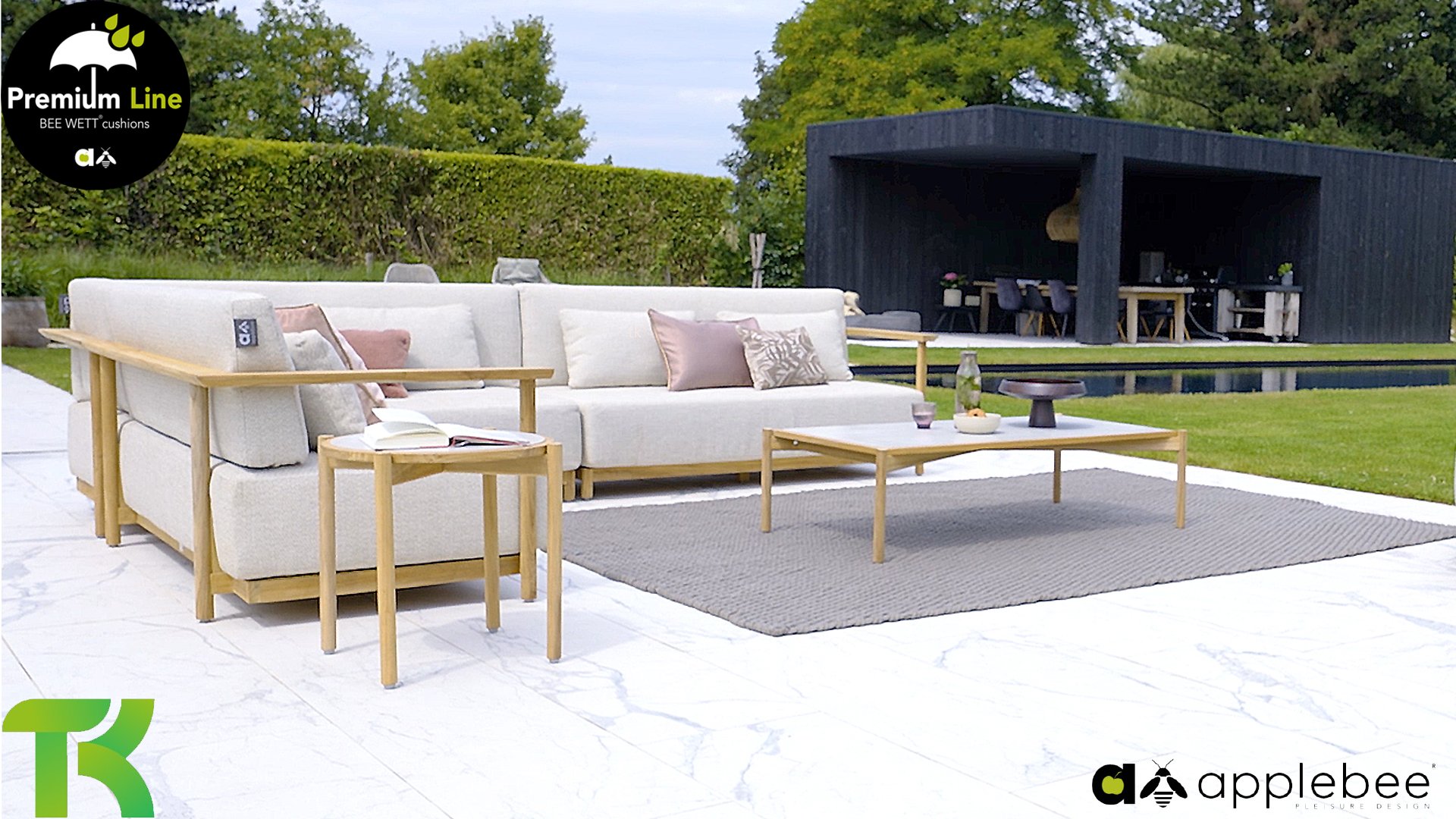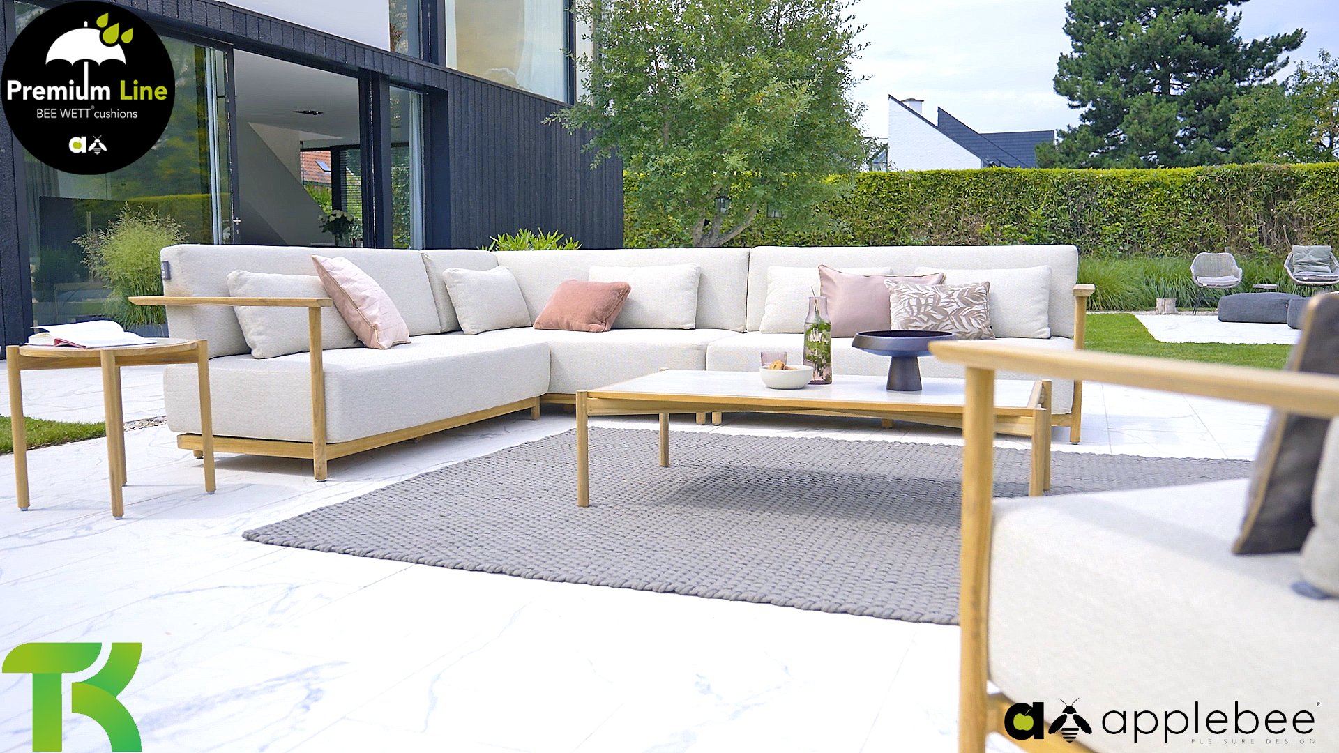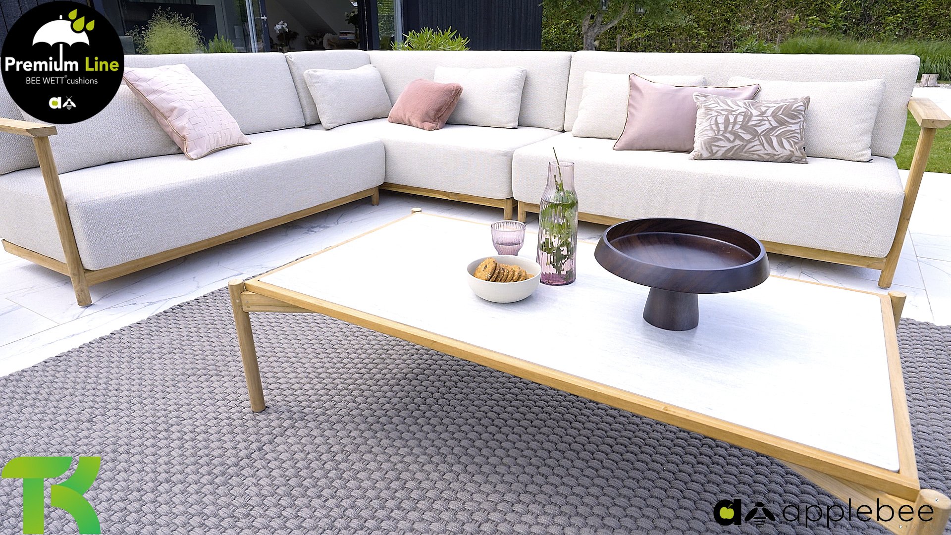 AppleBee St. Lucia Coffee Table 128cm: There are two different tables in the AppleBee St. Lucia series, and a rectangular Coffee Table and a round side table. Both are equipped with a beautifully crafted teak frame and have a ceramic tabletop in a cream-colored Travertine pattern. This matches perfectly with the rest of the color palette. Create one long couch with two sofas or create a spacious corner arrangement with 3 or 4 sofas. Want to add a separate lounge chair? The choice is entirely up to you… Who do you invite to your next garden party?