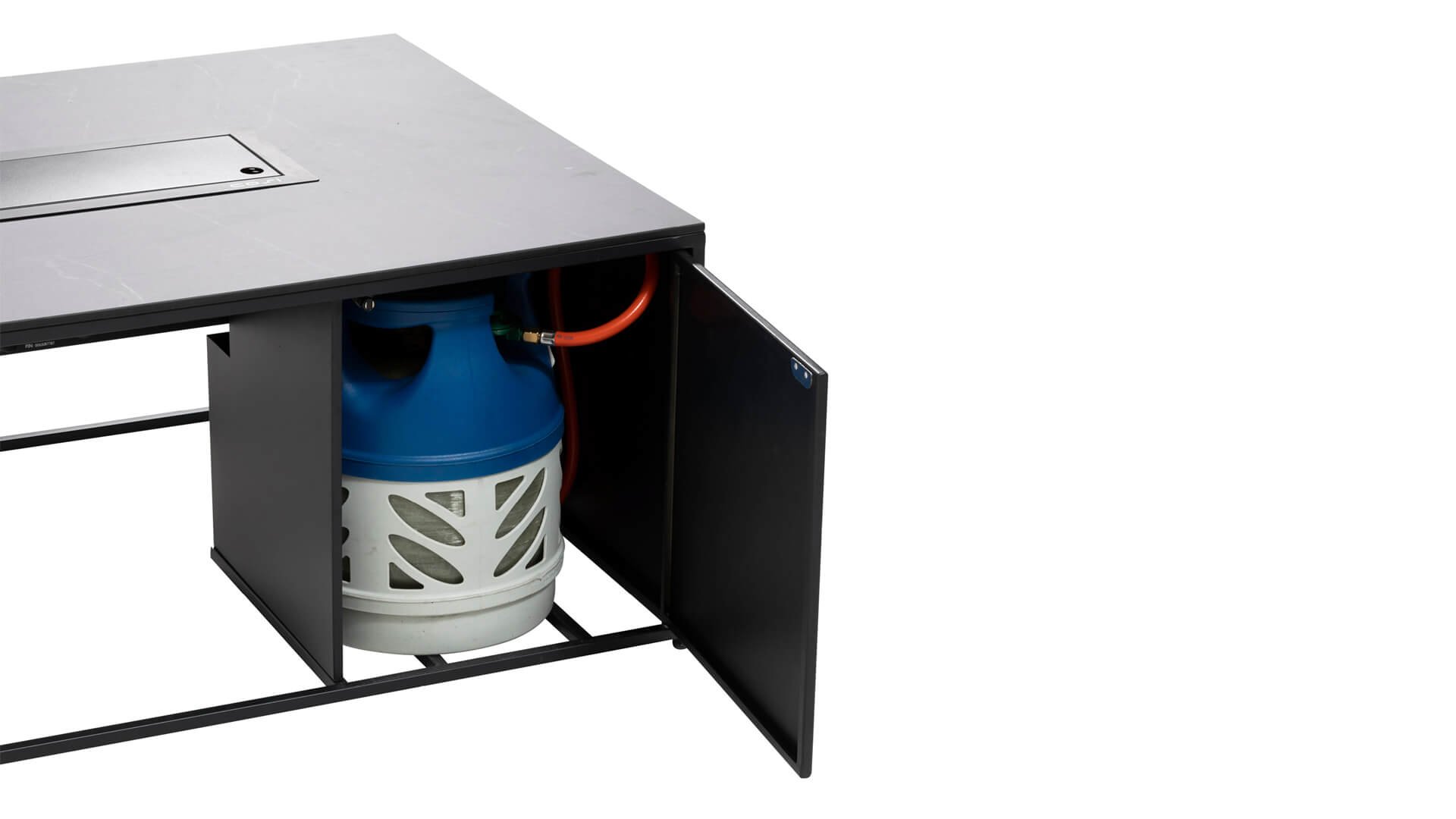 The Cosiloft 100 lounge table is a beautiful lounge table that you can completely customize to your taste. This new collection from Cosi is an evolution in fire tables. The Cosiloft features a beautiful, open-worked aluminum frame with a tabletop of your choice. There are three different tabletops available: grey, black, and teak. The frame is available in two colors: white for a modern look or black for an industrial style. Despite its beautiful lounge table height, the Cosiloft 100 can even accommodate a 5 kg gas bottle. This is well concealed in the pure design of the Cosiloft table. Each Cosiloft comes with a cover plate for the burner. If you are not using the fireplace, you can still utilize the entire tabletop surface. Enjoy being together with family and friends!