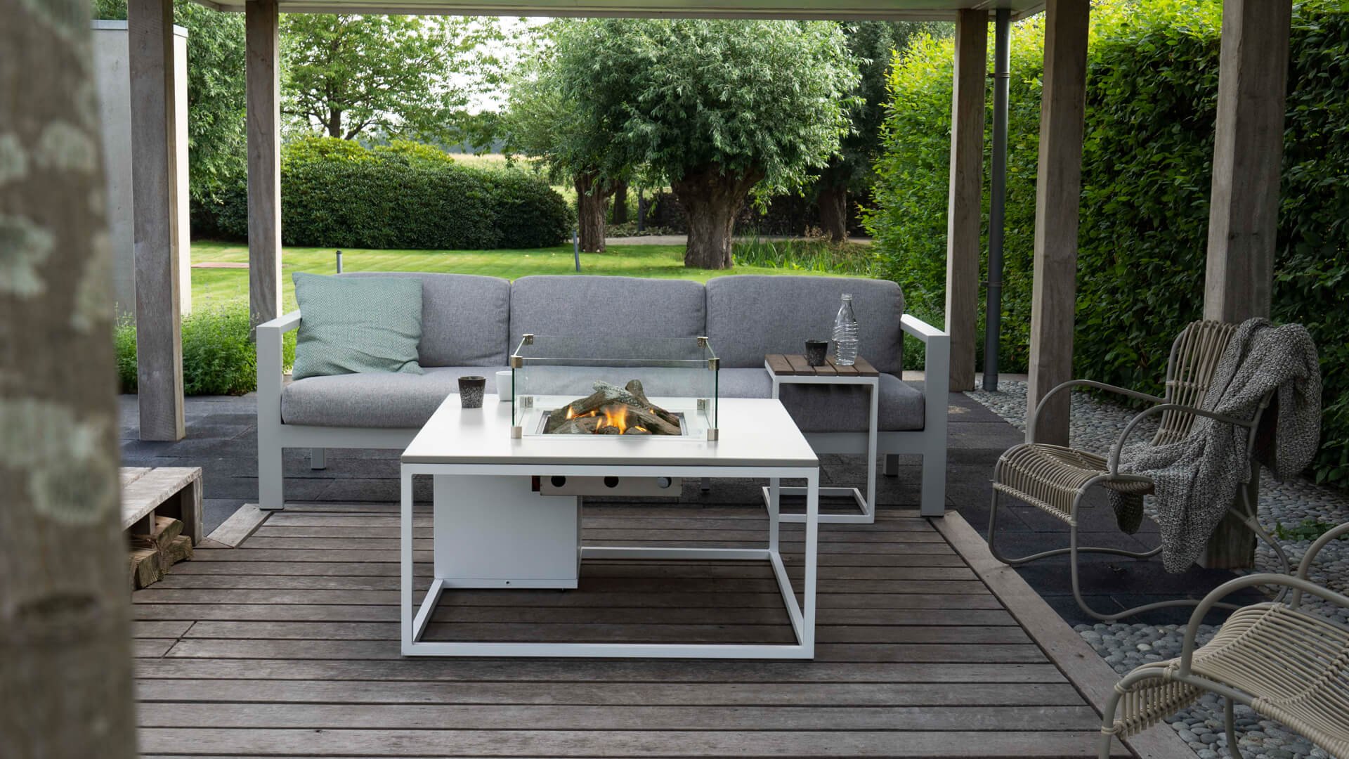 The Cosiloft 100 lounge table is a beautiful lounge table that you can customize to your liking. This new collection from Cosi is an evolution in fire tables. The Cosiloft features a beautifully designed open aluminum frame with a tabletop of your choice. Three different tabletops are available: gray, black, and teak. The frame comes in two colors: white for a modern look or black for an industrial style. Despite its elegant lounge table height, the Cosiloft 100 can even accommodate a 5 kg gas bottle. This is well integrated into the pure design of the Cosiloft table. Each Cosiloft comes with a cover plate for the burner. When the fireplace is not on, this way you can still utilize the entire table surface. Enjoy being together with family and friends!