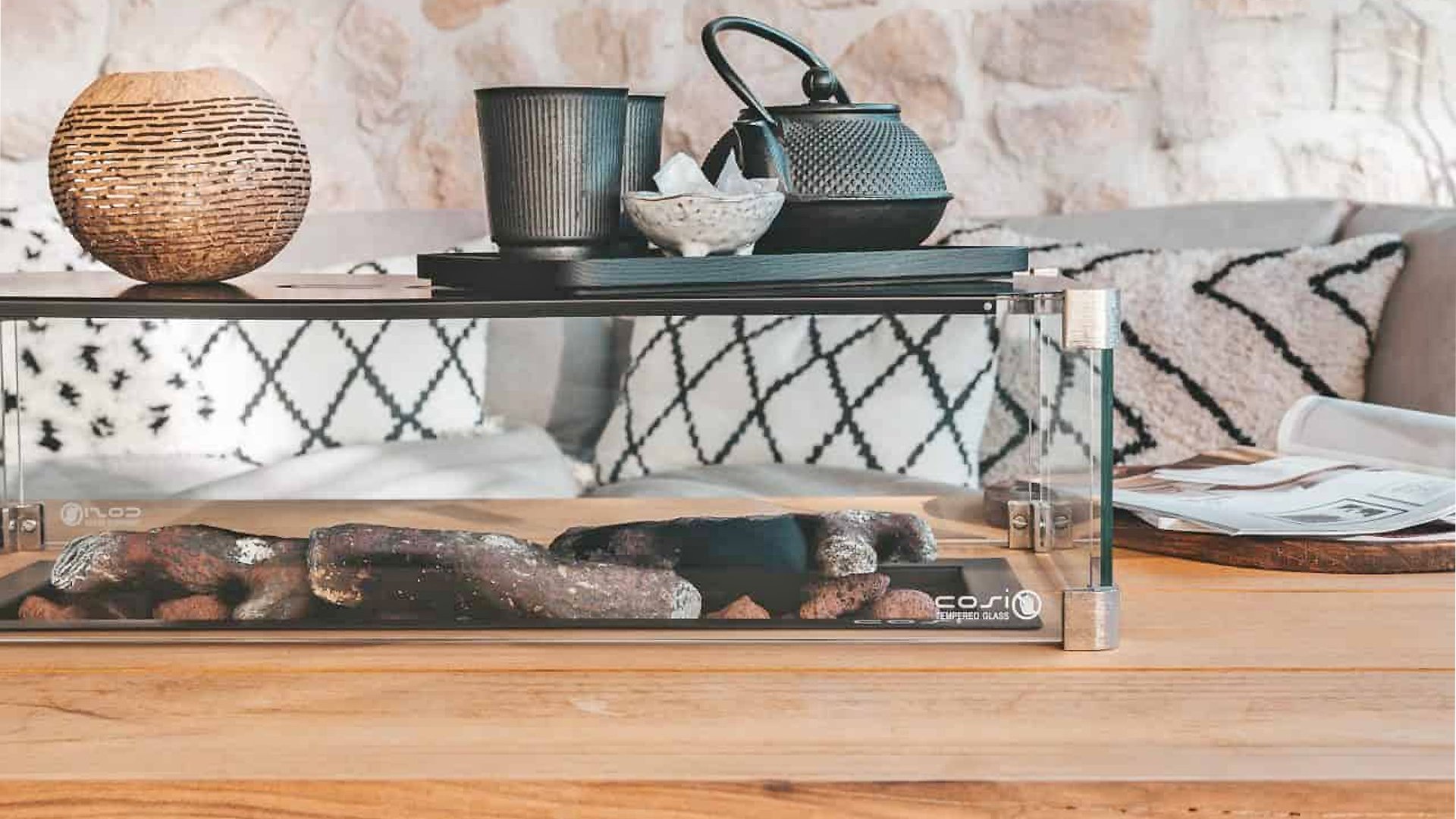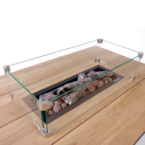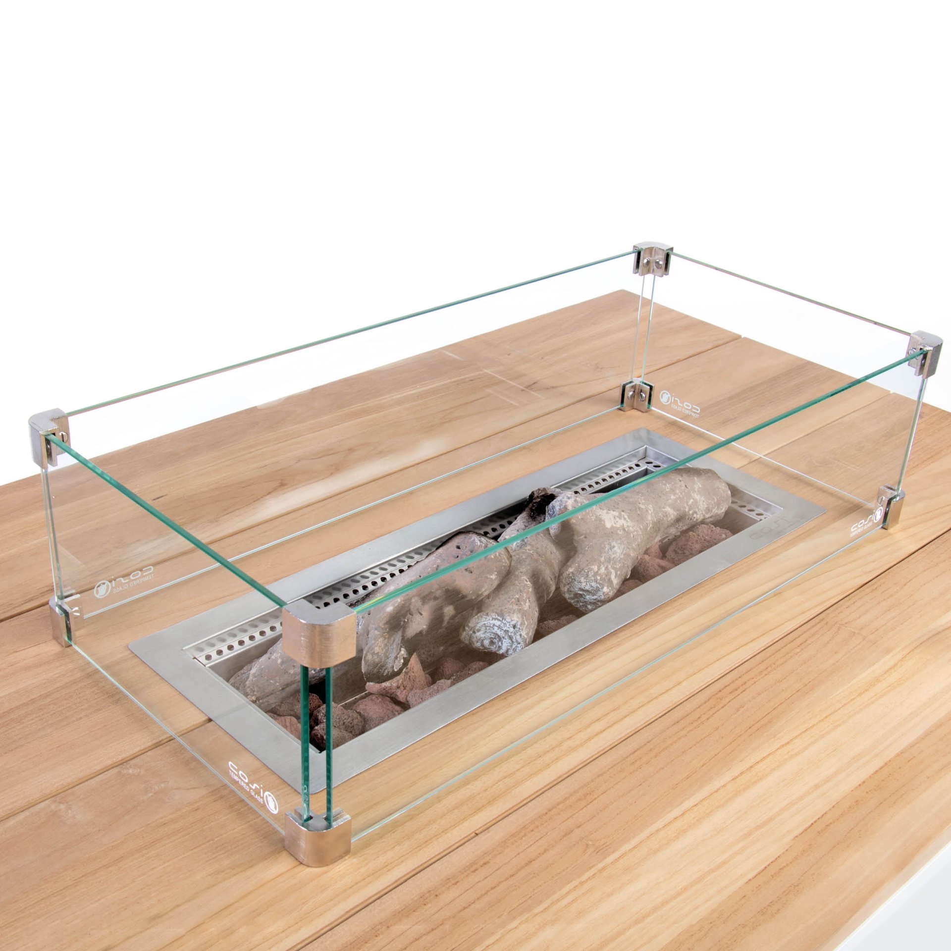 The Cosiloft 120 lounge table can easily be combined with a wide range of lounge sets. The Cosiloft 120 lounge table features a straight burner that provides enough space to invite all your friends and family for a drink. The Cosiloft is 80 cm wide and 120 cm long. This fire table, like the Cosiloft 100, has a beautiful, openworked aluminum frame that can be combined with one of three tabletops: teak, black, and gray. The frame is available in two colors: white for a modern look or black for an industrial style. Despite its beautiful lounge table height, the Cosiloft 120 can even accommodate a 5 kg gas bottle, which is well integrated into the pure design of the Cosiloft table. Each Cosiloft comes with a cover plate for the burner. When the fireplace is not on, you can still use the entire table surface in this way.