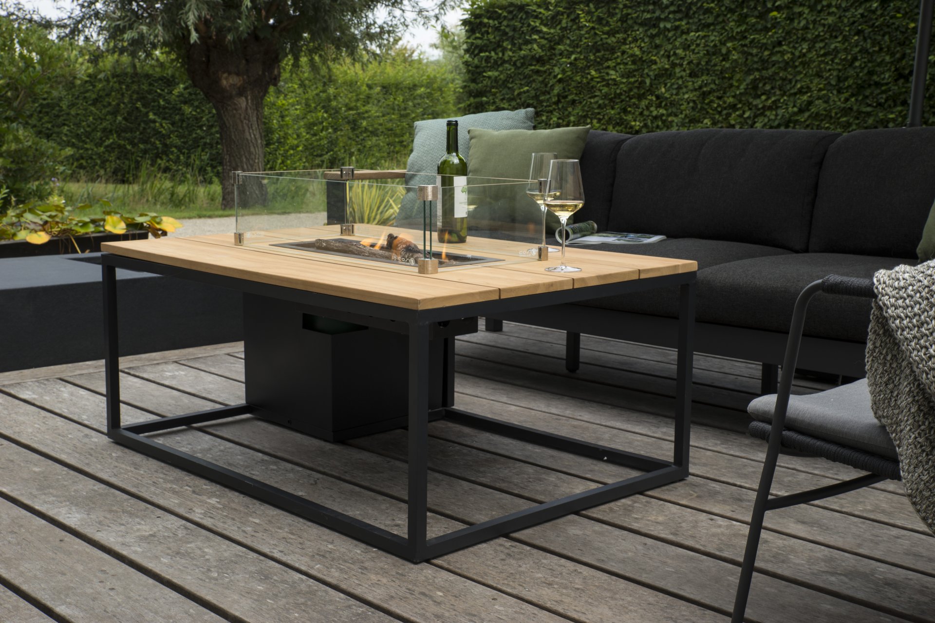 The Cosiloft 120 lounge table can easily be combined with a large range of lounge sets. The Cosiloft 120 lounge table features a straight burner that provides enough space to invite all your friends and family for a drink. The Cosiloft is 80 cm wide and 120 cm long. This fire table has a beautiful, open aluminum frame just like the Cosiloft 100, which can be combined with one of the three table tops: teak, black, and gray. The frame is available in two colors: white for a modern look or black for an industrial style. Despite its beautiful lounge table height, a 5 kg gas bottle can fit inside the Cosiloft 120. This is well integrated into the pure design of the Cosiloft table. Every Cosiloft comes with a cover plate for the burner. If you are not using the fire, you can still make use of the entire table surface in this way.