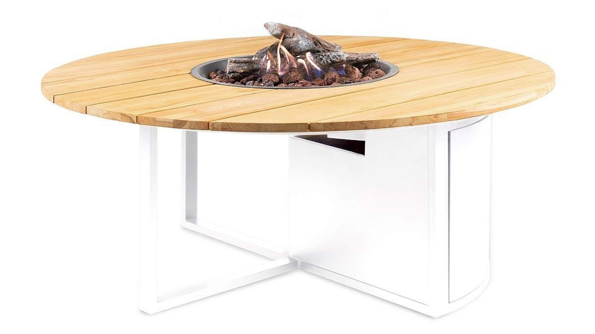 Looking for a round fire table where you can enjoy some cozy time with friends and family? Then the Cosiloft 120 round is the fire table for you! The Cosiloft 120 round is a new addition to the Cosiloft fire table series. The Cosiloft features a beautiful, open-worked aluminum frame with a teak wood tabletop. The frame is available in two colors: white for a modern look or black for an industrial style. Despite its nice lounge table height, the Cosiloft 120 round can even fit a 5 kg gas cylinder. This is well integrated into the pure design of the Cosiloft table.