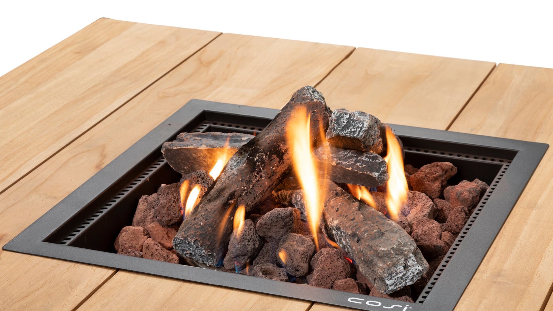 The Cosiloft 120 round comes with a 30 mBar regulator with gas hose, 4 ceramic fire logs, lava stones, and a battery.