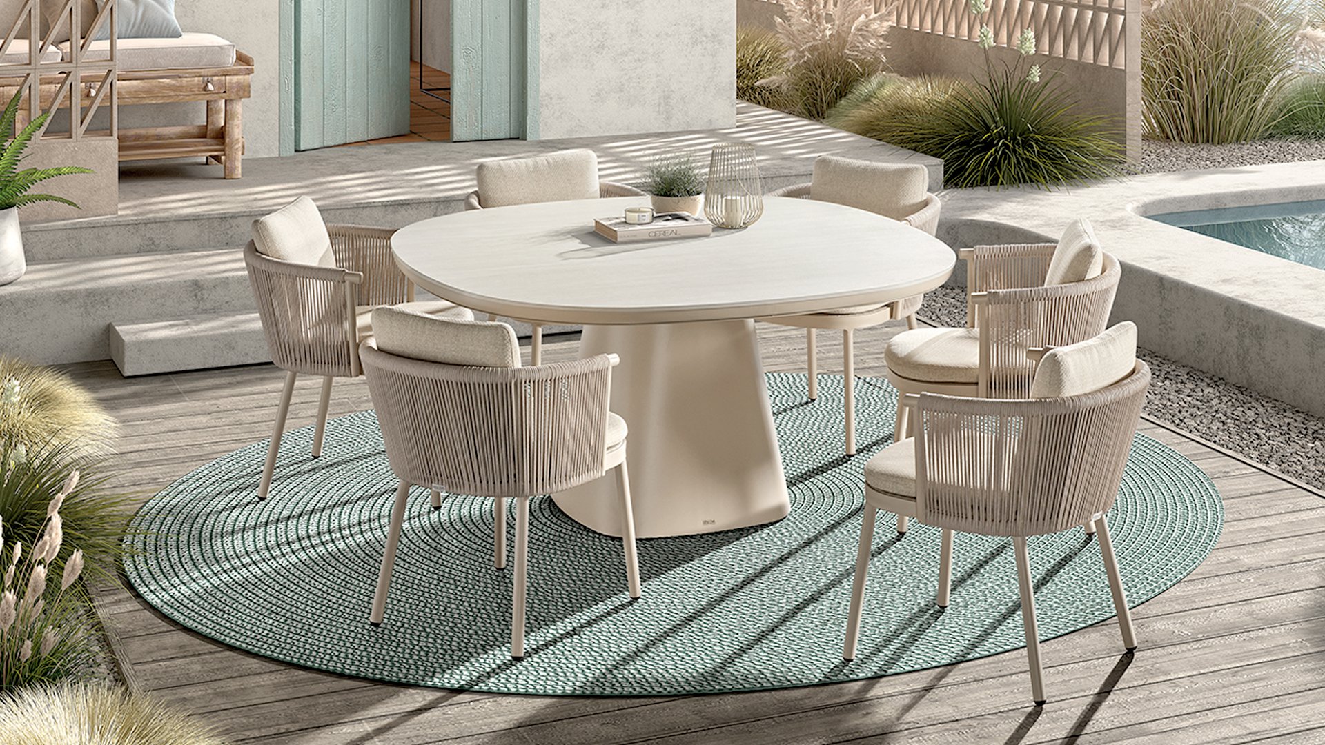 Available in Stylish Colours: The combination of the warm, linen-coloured frame and the elegant, light grey, hand-woven rope creates a modern yet cosy look that fits into any garden. Available with teak or aluminium elements.
