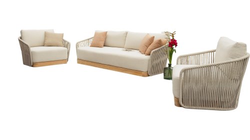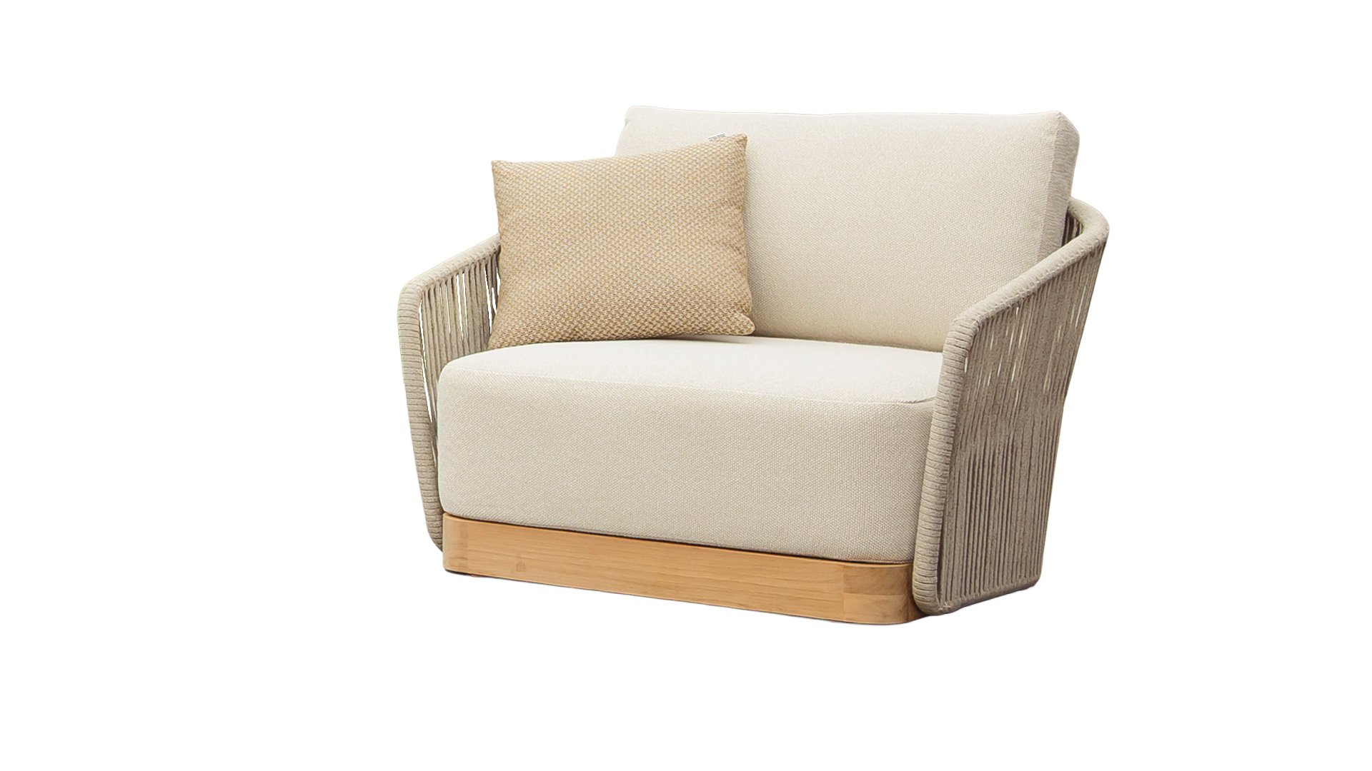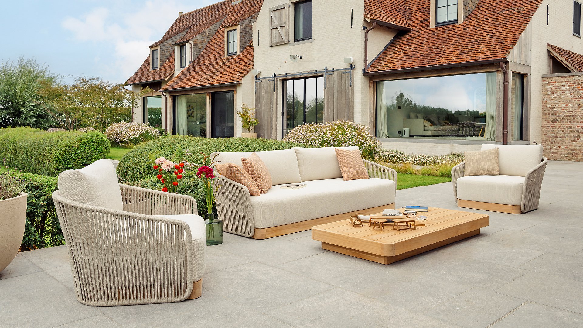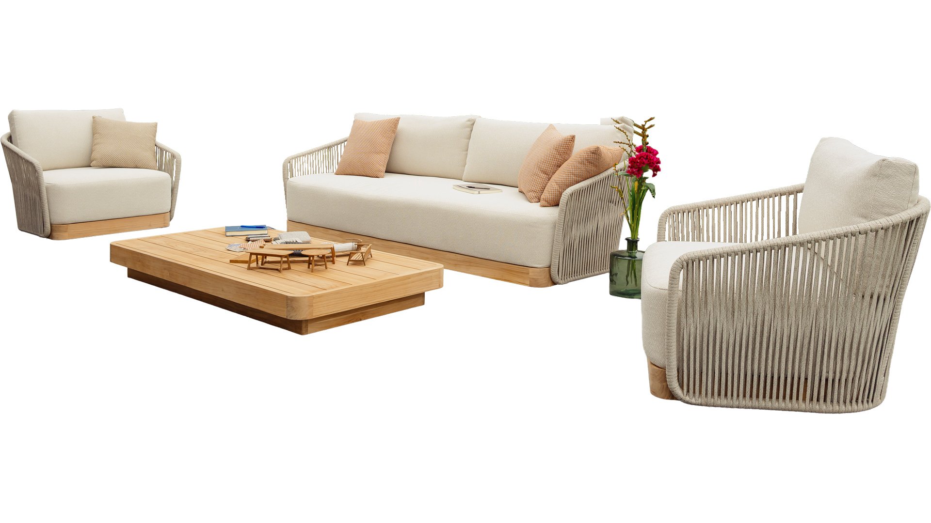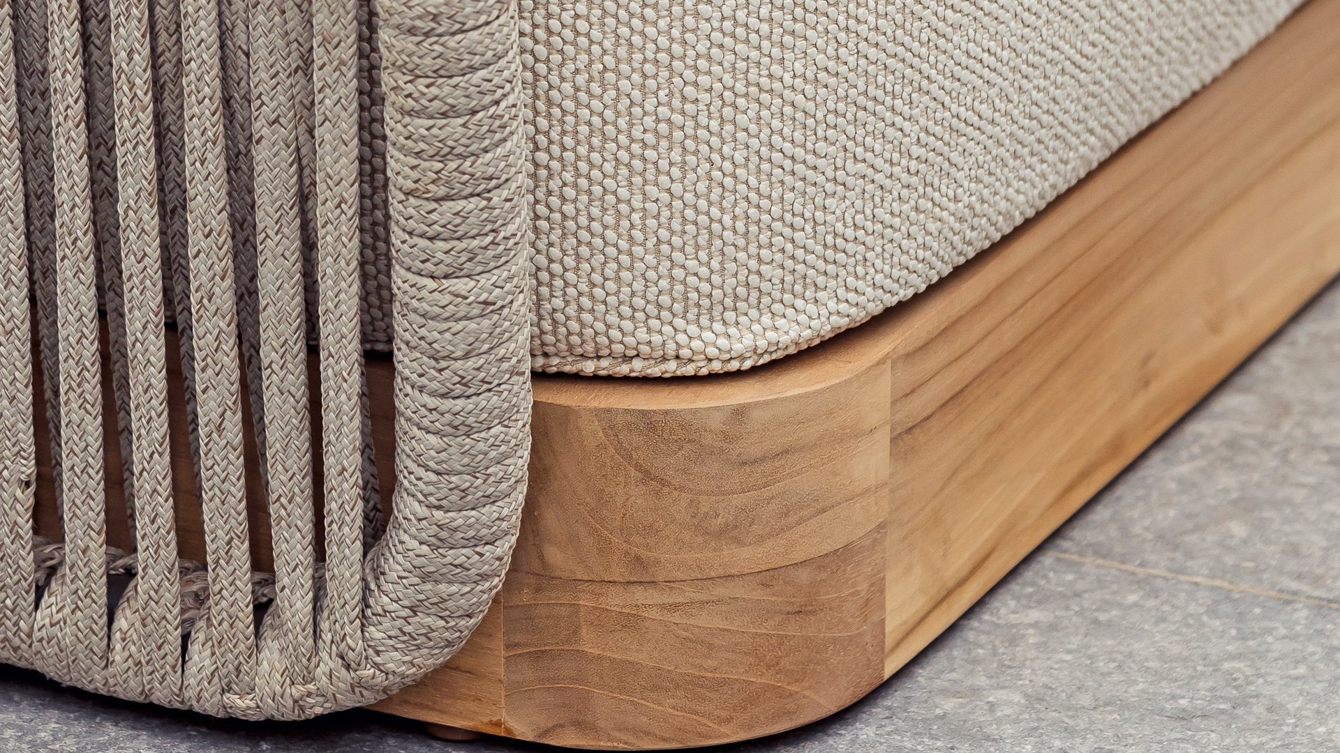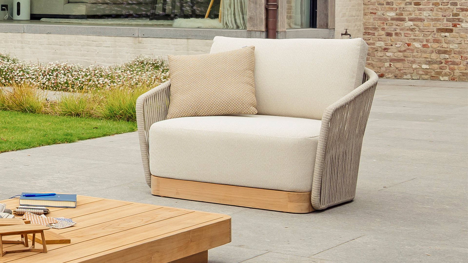 Durable materials such as Rope, Teak, Stainless Steel (RVS), aluminum, and Olefin cushions.