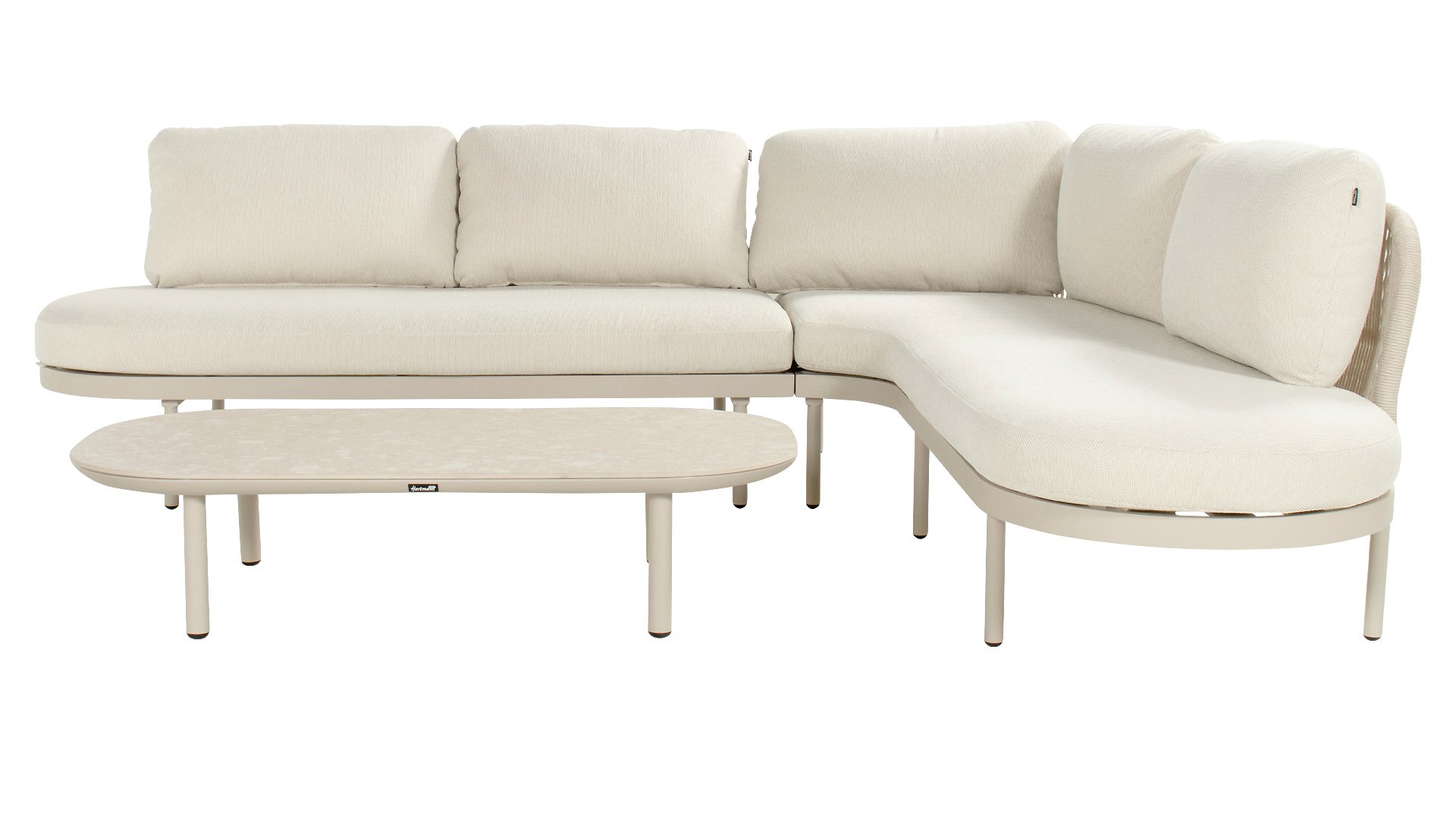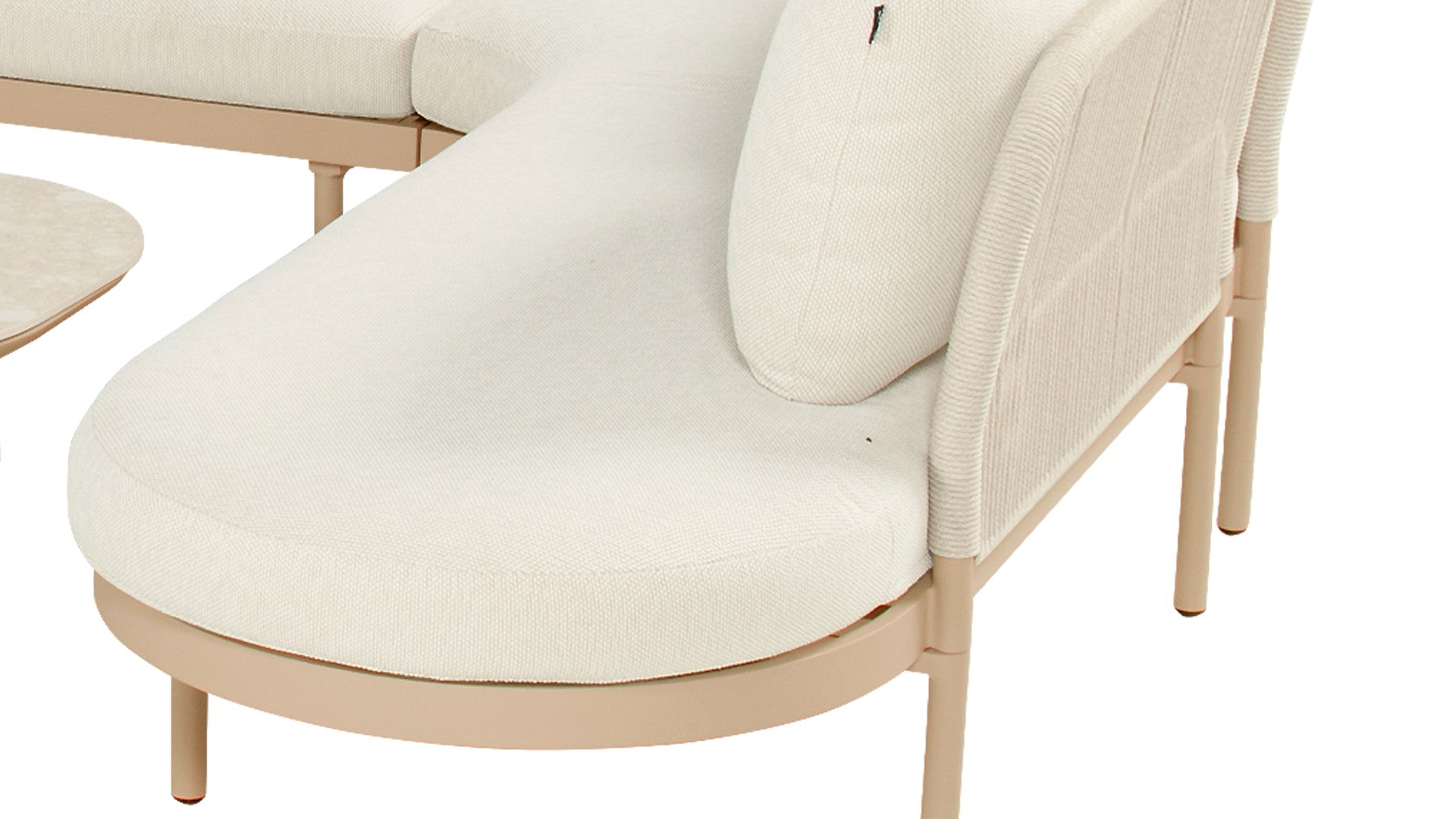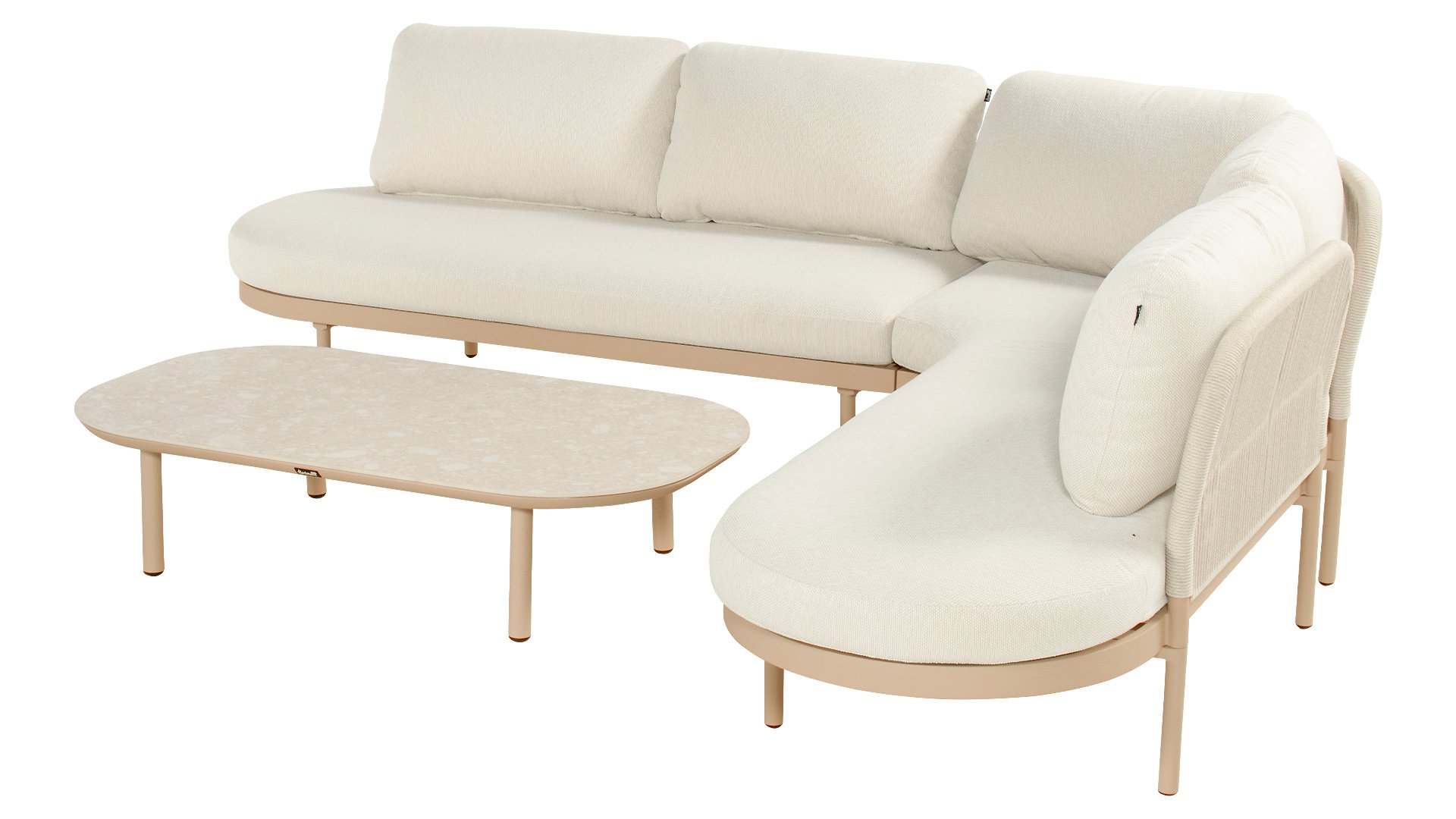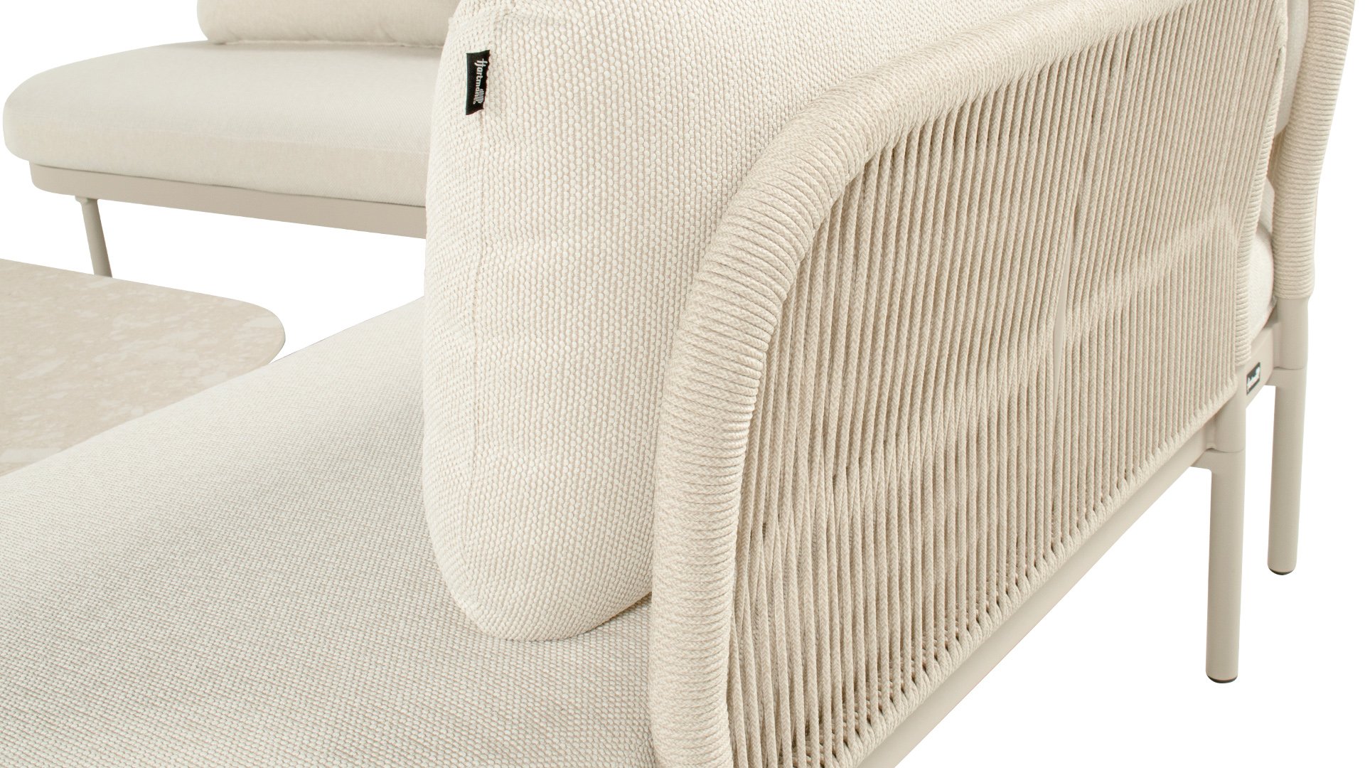 The Bilboa corner lounge set in Sand, Cappuccino or Soft Green invites you to relax in ultimate comfort. The aluminium frame and beige cushions are low-maintenance and weather-resistant. The soft, rounded shapes and elegant rope details, combined with the matching coffee table, create a cosy and warm lounge seating area.
