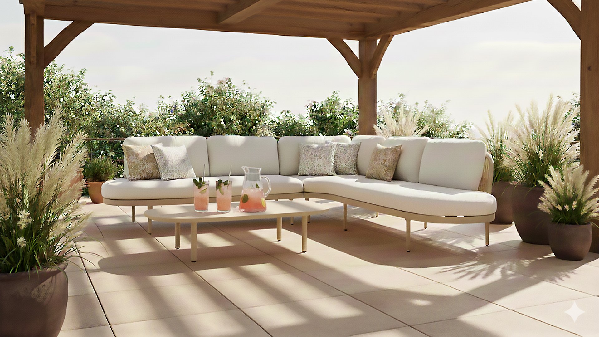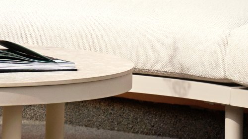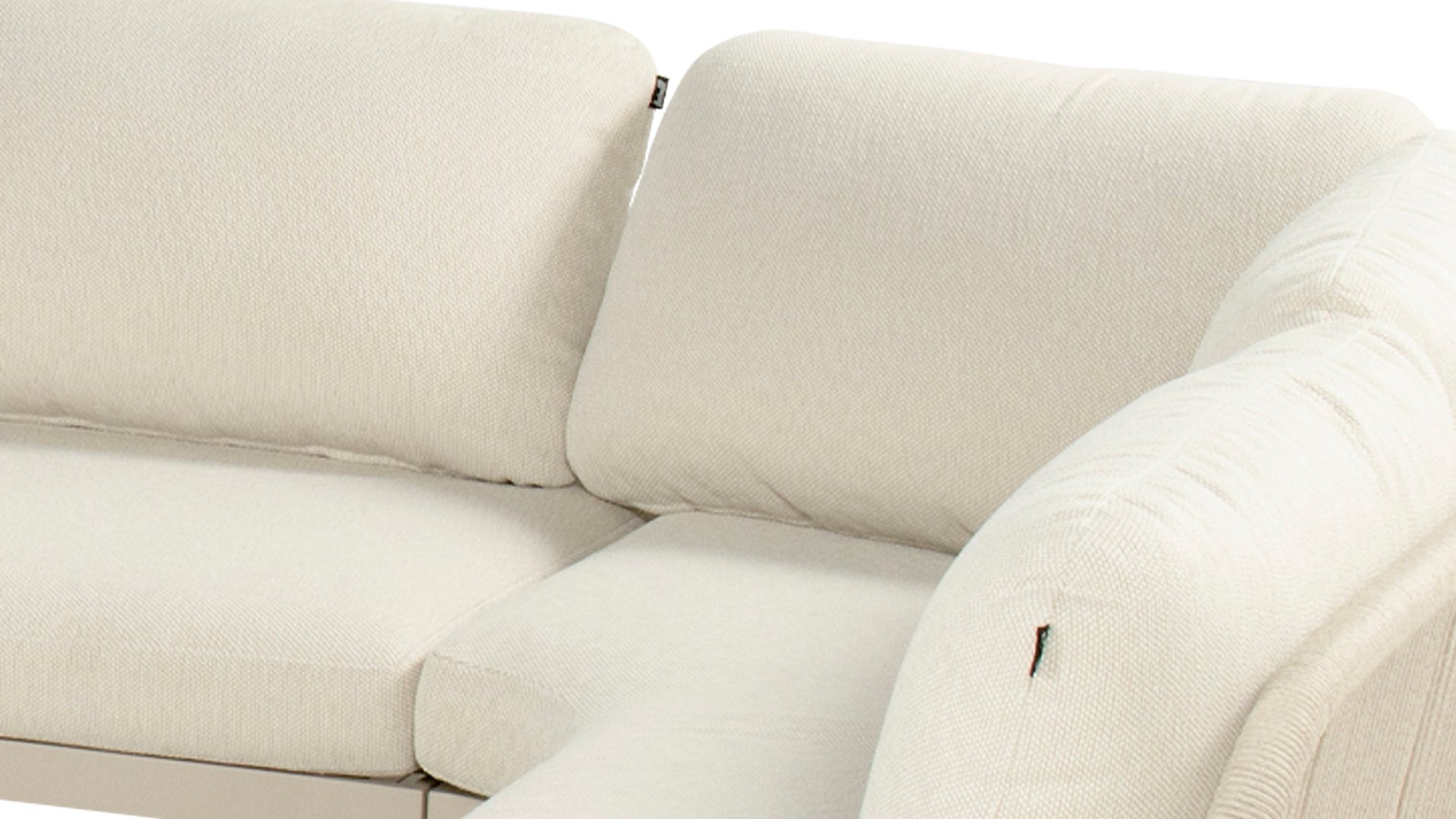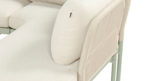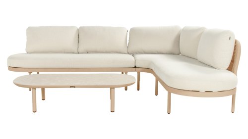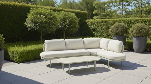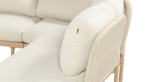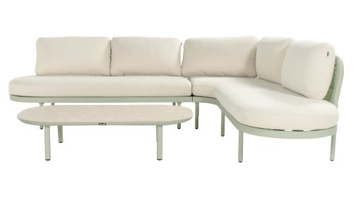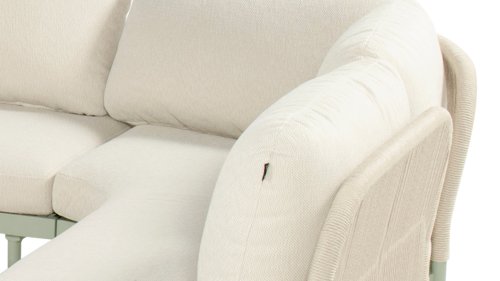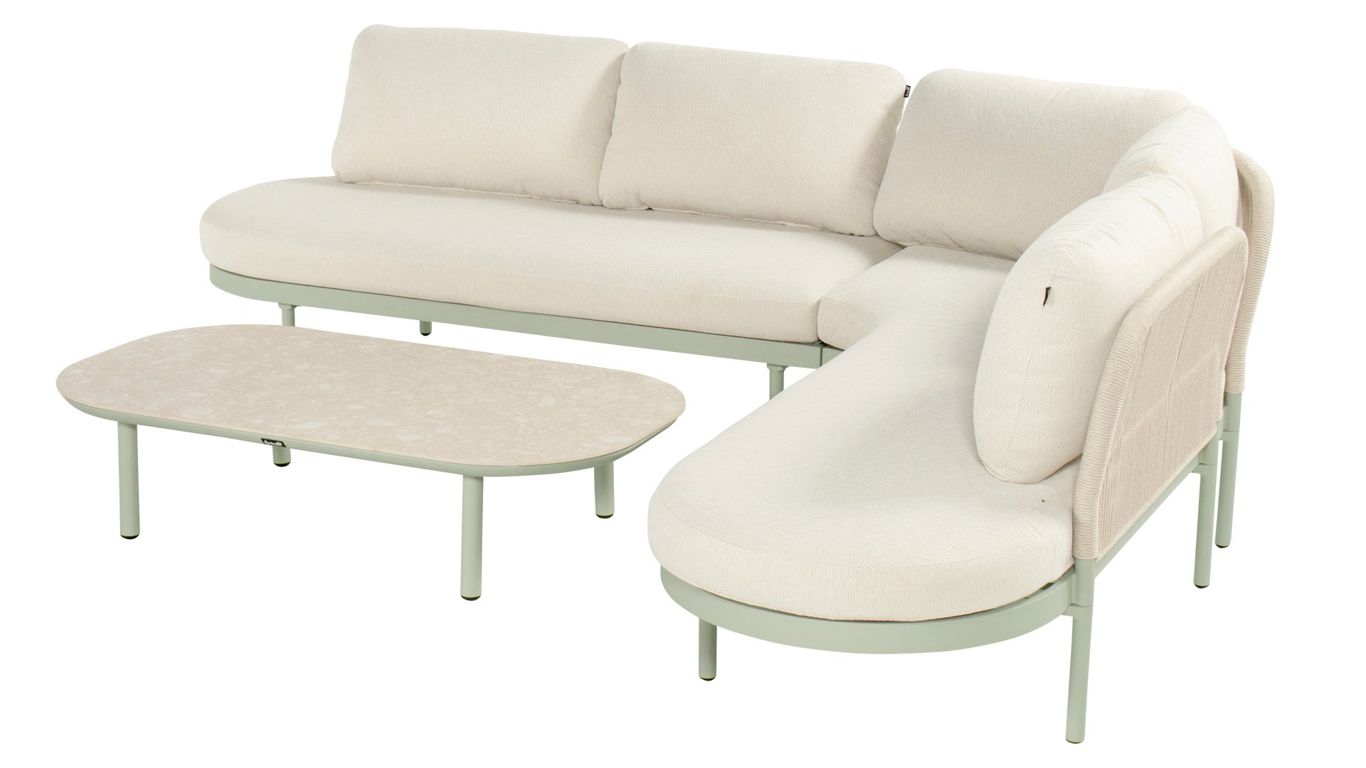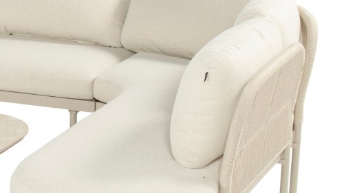 The Bilboa corner lounge set in Sand, Cappuccino or Soft Green invites you to relax in ultimate comfort. The aluminium frame and beige cushions are low-maintenance and weather-resistant. The soft, rounded shapes and elegant rope details, combined with the matching coffee table, create a cosy and warm lounge seating area.