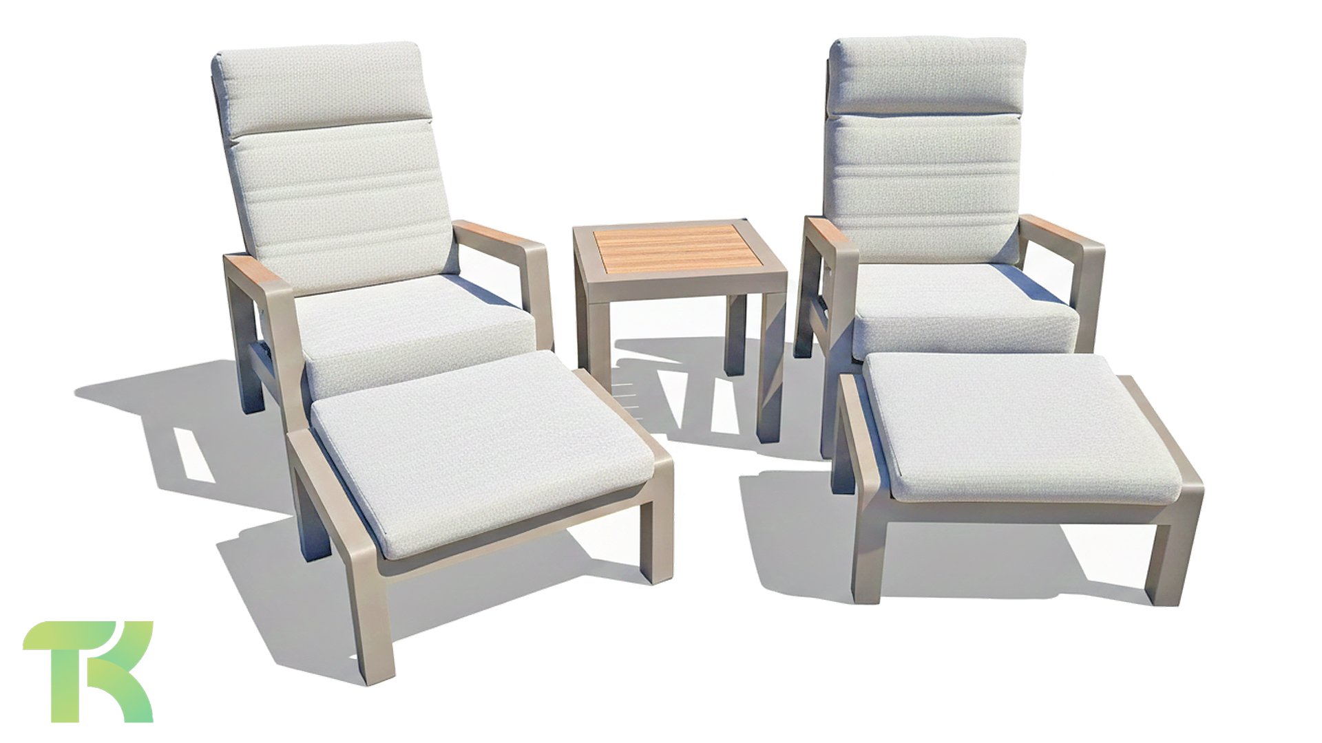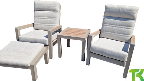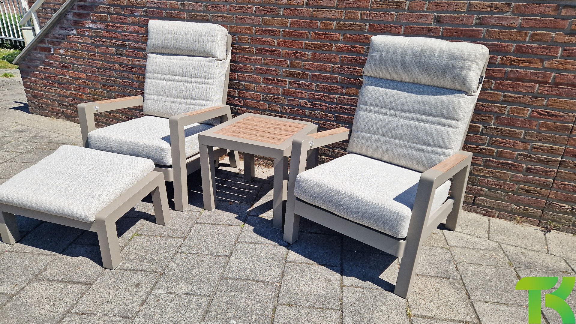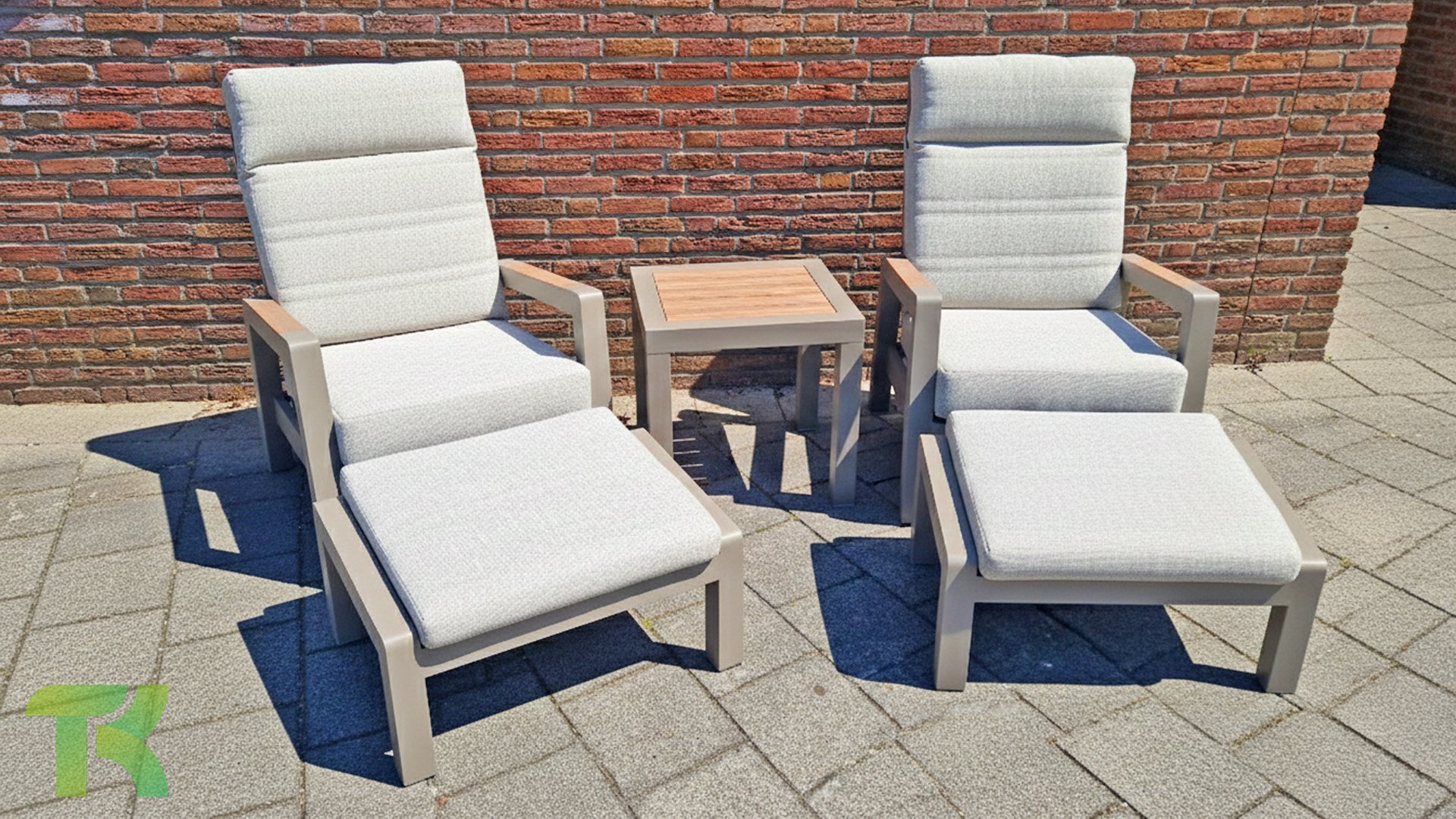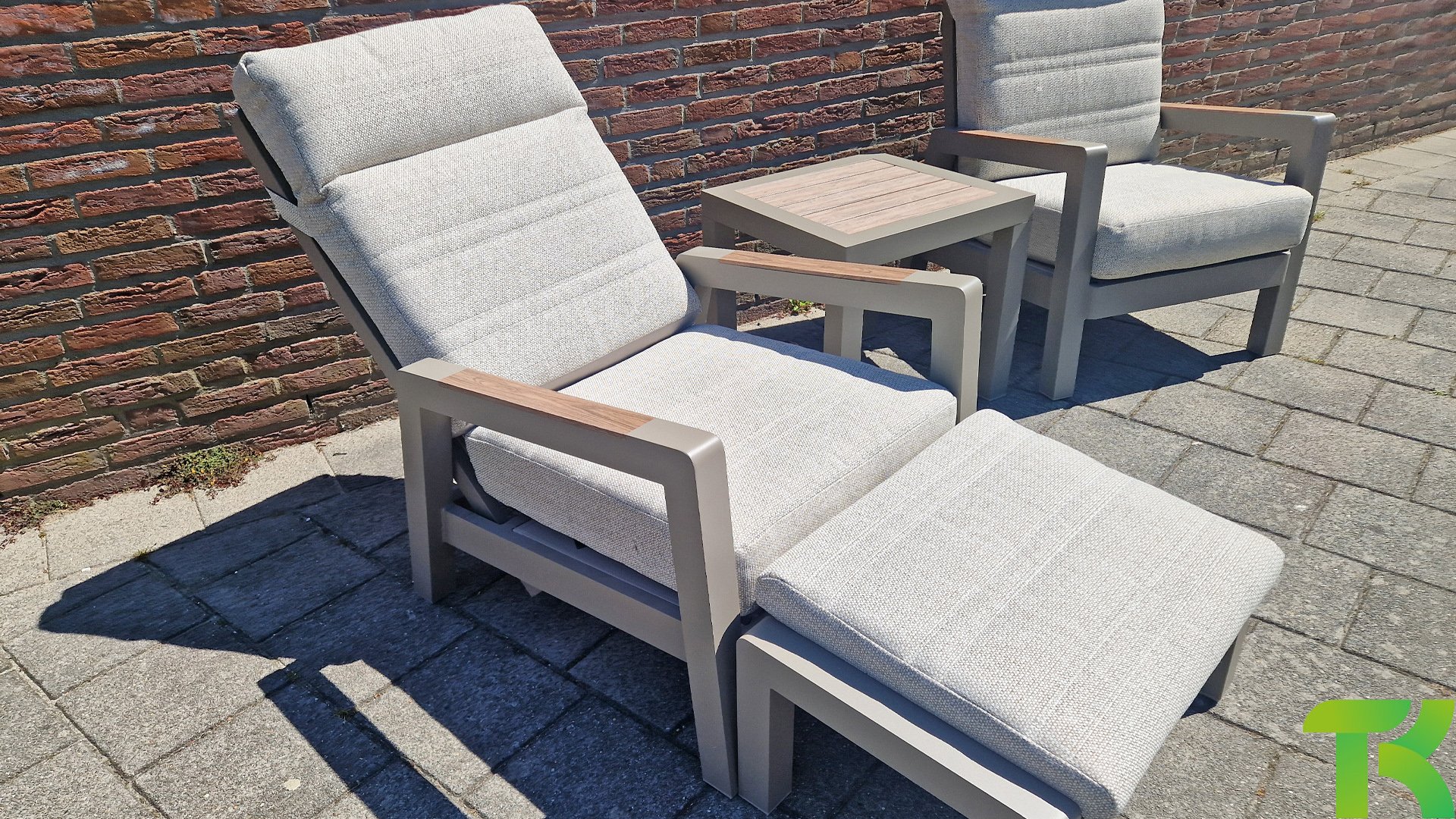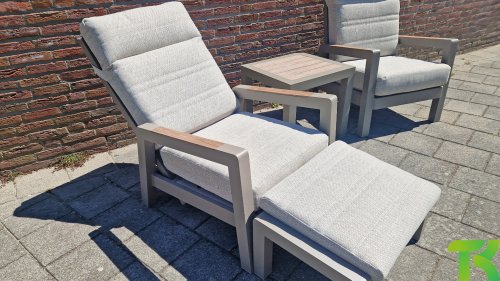 The set consists of two lounge chairs, two footstools, and a handy side table, which together form a complete and practical seating area. Each lounge chair features polyester seat cushions, and the backrests are adjustable via a knob in the armrest. This allows you to easily find the ideal seating position for added comfort and relaxation. The side table has a wood-look top, giving the set a natural look and perfectly complementing the modern design of the rest of the furniture. The wood-look top is also easy to maintain, making it practical for outdoor use.