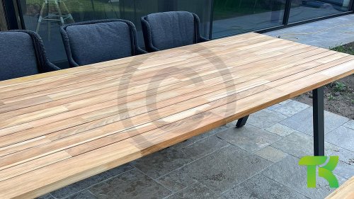 The teak garden table Ambassador is a popular model within the beautiful range of Taste 4SO. Ambassador tables. A striking detail of the teak surface of the Ambassador table is the different widths of the boards. This beautiful effect is clearly visible in the detail photos. It provides an original and contemporary look. The frame is made of powder-coated stainless steel.