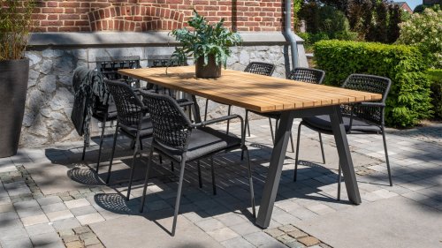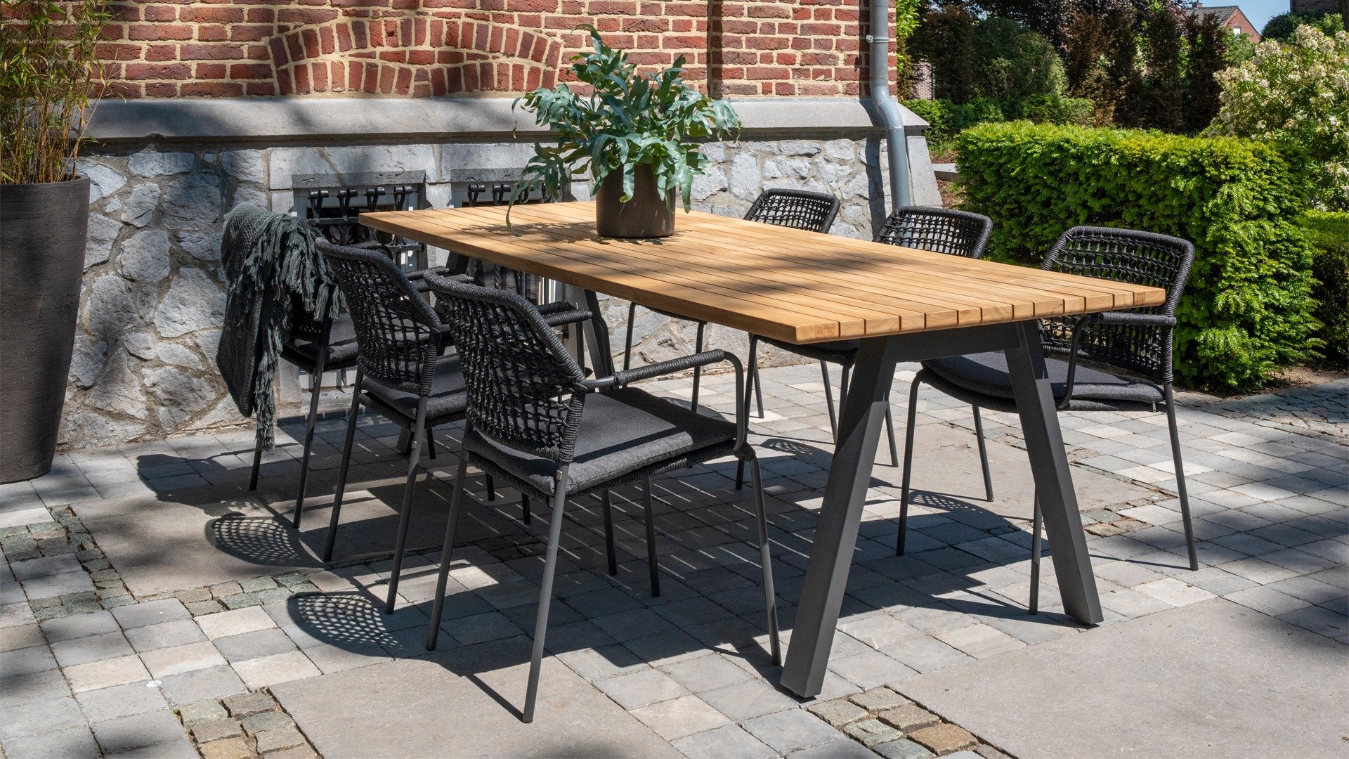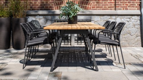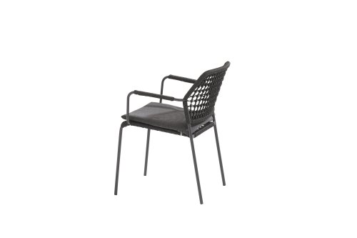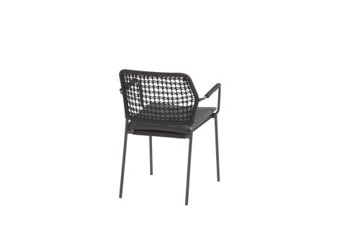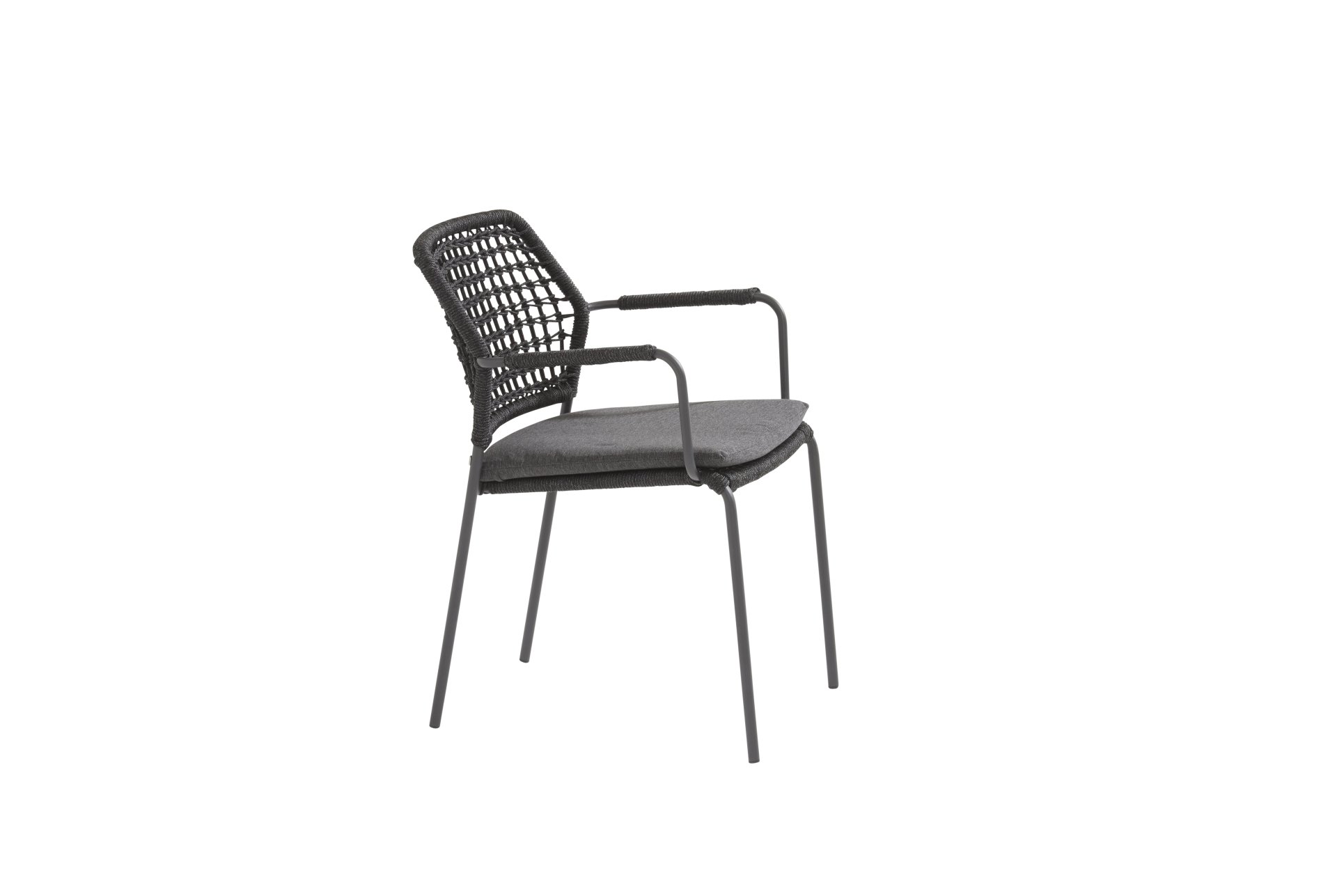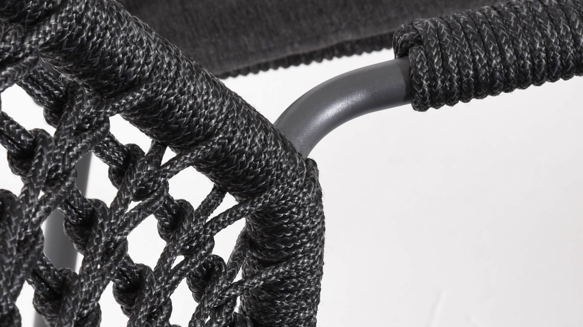 This chair is available in three colors: Anthracite, Terre, and Latte. The rope material is weather-resistant and knotted in a checkered pattern, which is subtly echoed in the armrests.