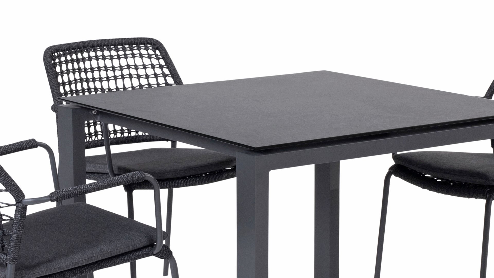 This chair is available in three colors: Anthracite, Terre, and Latte. The rope material is weather-resistant and knotted in a checkered pattern, which is subtly echoed in the armrests.