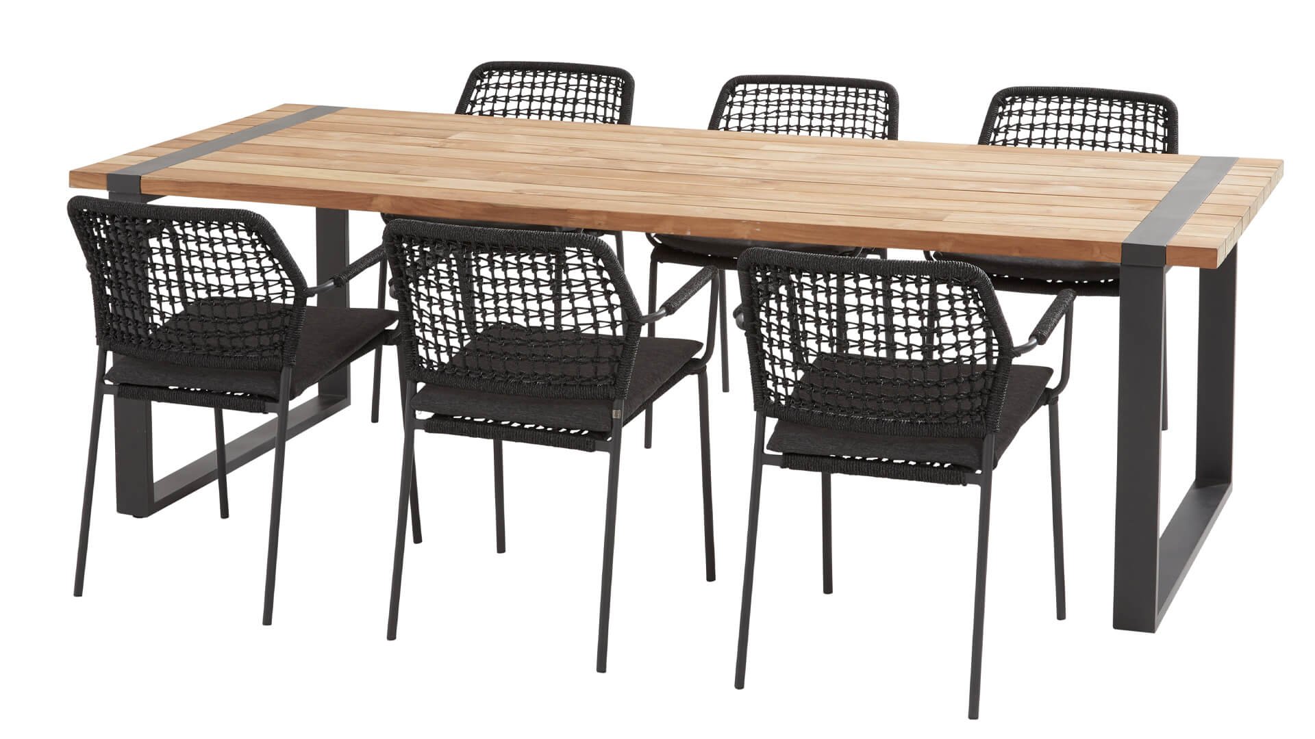 This chair is available in three colors: Anthracite, Terre, and Latte. The rope material is weather-resistant and knotted in a checkered pattern, which is subtly echoed in the armrests.