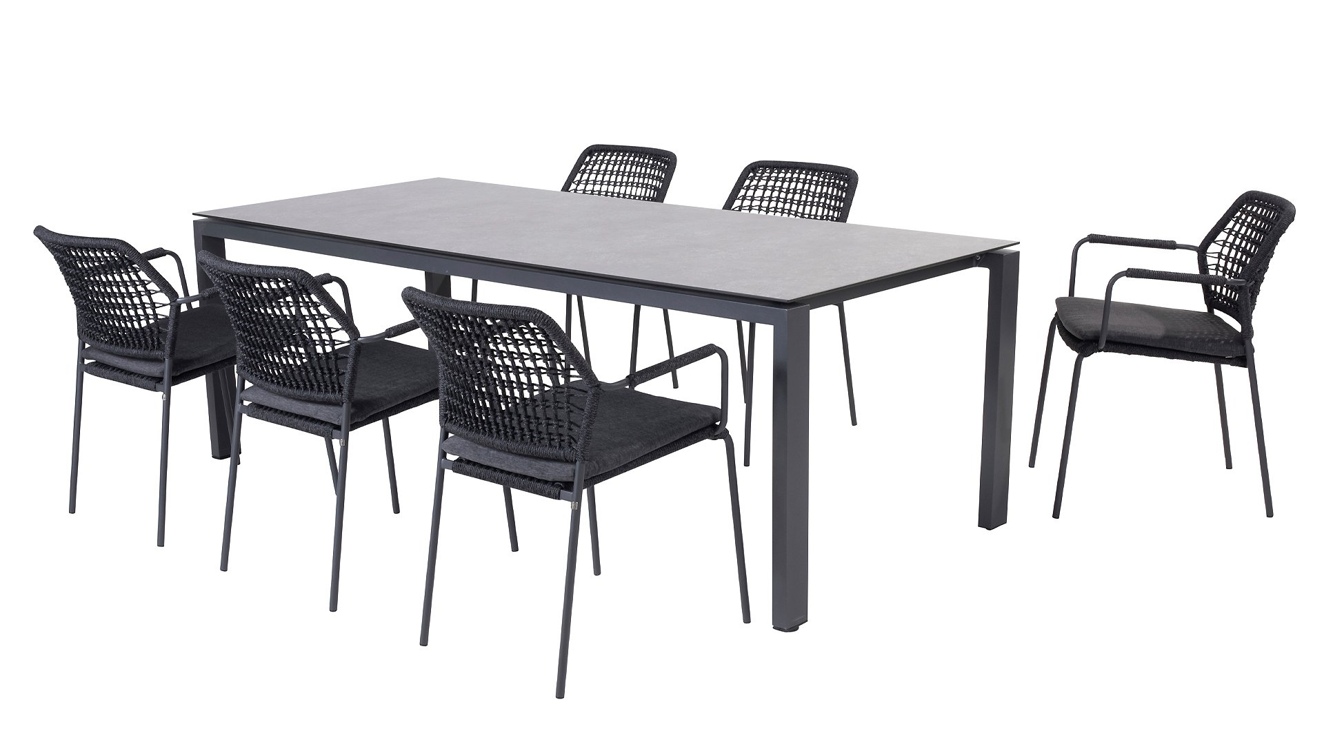 This chair is available in three colors: Anthracite, Terre, and Latte. The rope material is weather-resistant and knotted in a checkered pattern, which is subtly echoed in the armrests.