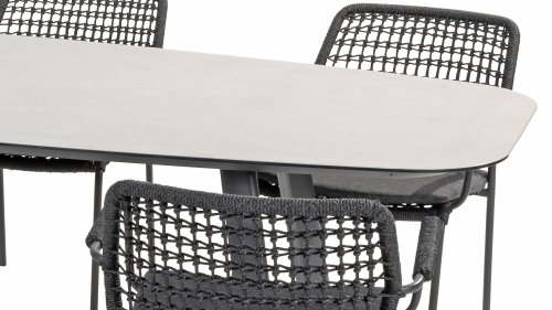 This chair is available in three colors: Anthracite, Terre, and Latte. The rope material is weather-resistant and knotted in a checkered pattern, which is subtly echoed in the armrests.
