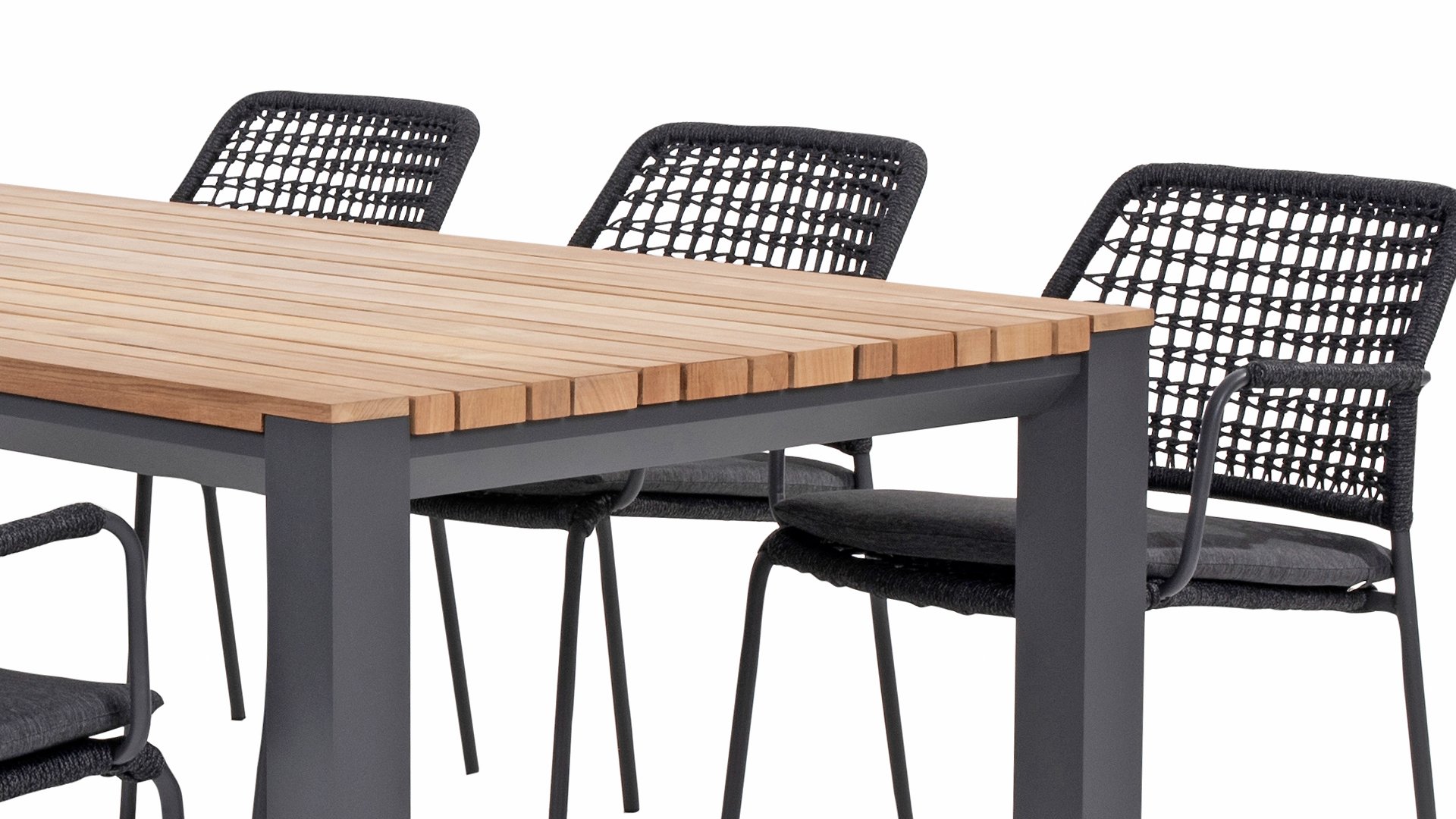This chair is available in three colors: Anthracite, Terre, and Latte. The rope material is weather-resistant and knotted in a checkered pattern, which is subtly echoed in the armrests.