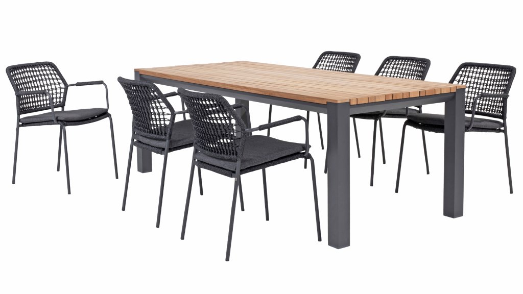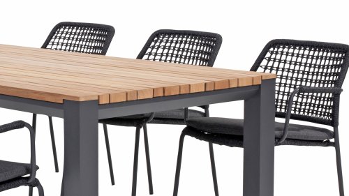 A modern table in the style of 2023. The playful teak wood slats have different widths. In combination with the aluminum powder-coated frame, this table can be combined with almost any dining chair.