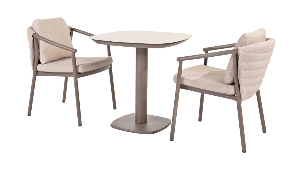 The Taste 4SO Barolo is unique. The quilted fabric backrest distinguishes the chair and provides wonderfully soft comfort. Combined with the elegant Terre powder-coated aluminum frame and the stylish gray rope that embraces the cushions, the chair creates a serene and stylish look that perfectly complements any modern garden. The light gray cushions complete the look and invite you to enjoy long, cozy evenings outdoors. In addition to the garden set, a lounge set is also available within this series to complete the outdoor experience.