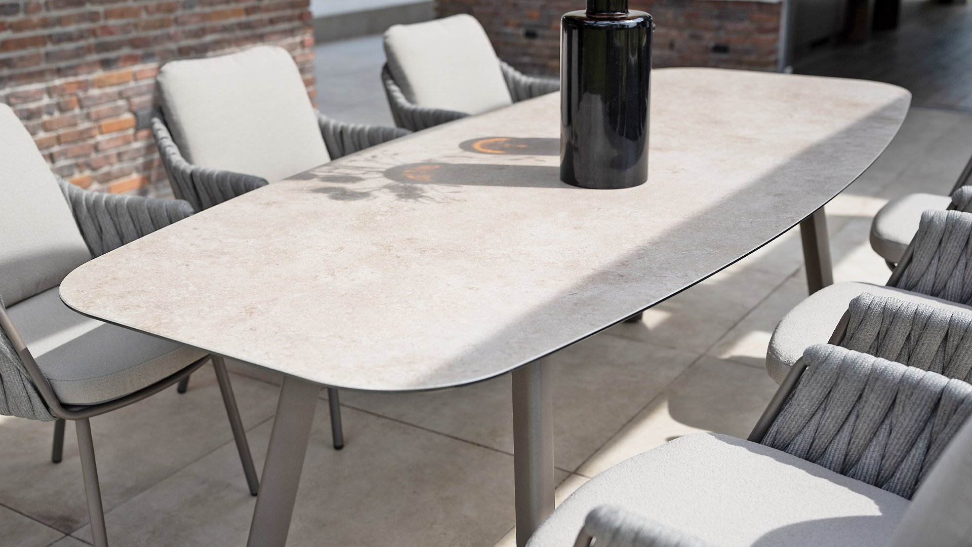 Looking for a low-maintenance table with a modern look? Then consider the Taste by 4 Seasons Outdoor Manolo 180cm, available in anthracite, latte, and terre. The shape of the tabletop and the position of the aluminum legs make this table incredibly practical. This shape creates ample space on all sides. The table's distinctive design features a Danish oval tabletop made of glass-printed ceramic, allowing it to remain outdoors year-round. The Manolo is also available in 75x75x75cm and 240x103x75cm in three colors.