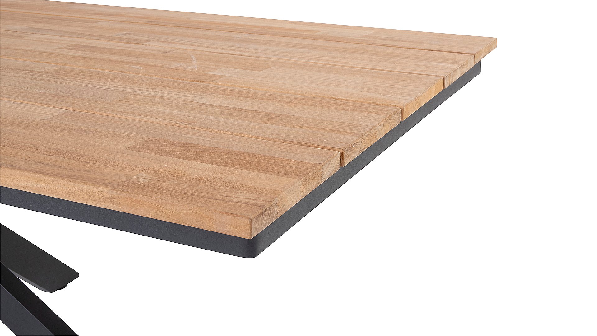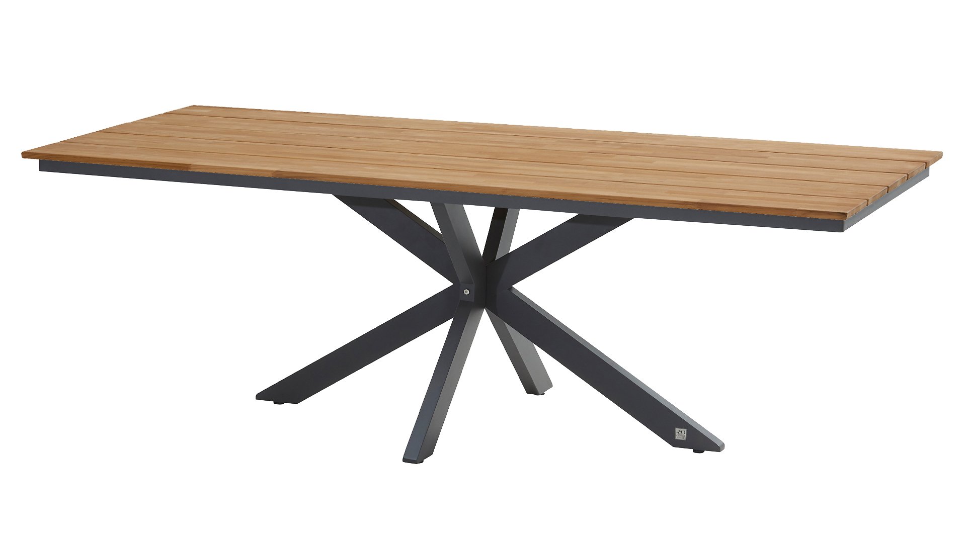The beautiful cross-leg base immediately catches the eye and gives your terrace a contemporary look. The 4 Seasons Outdoor Minerva table can be combined with many different tabletops. Here, we are looking at the combination with Goa teak tabletop. Very high-quality teak wood with a beautiful finish. The size 220×95 cm offers space for 6 to 8 chairs. We recommend maintaining the teak wood with our maintenance products from 4 Seasons Outdoor to ensure a long lifespan and a beautiful appearance.