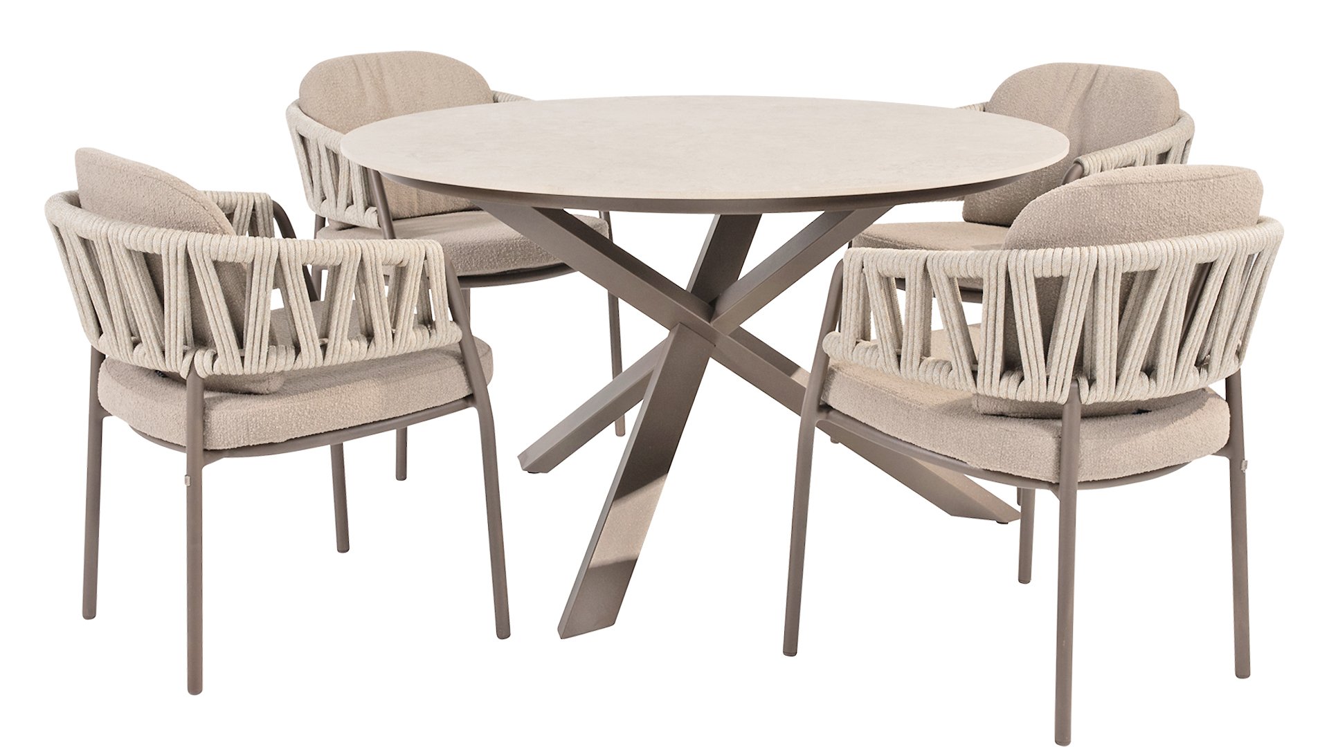 This dining set combines refined style with everyday comfort. The chic terre color adds a cozy and stylish ambiance to your garden, making it the perfect spot for relaxed meals and good conversations. The sleek design fits perfectly into any outdoor space and offers both comfort and charm for any time spent outdoors. This chair is available in two colors: Latte and Terre. It features comfortable, weather-resistant cushions that are both soft to the touch and quick-drying. This means you can enjoy not only the comfort of the chair but also its ease of care. The cushions are included as standard, so you can immediately enjoy ultimate seating comfort. The Calma series also includes two lounge versions, also in the colours Latte and Terre.