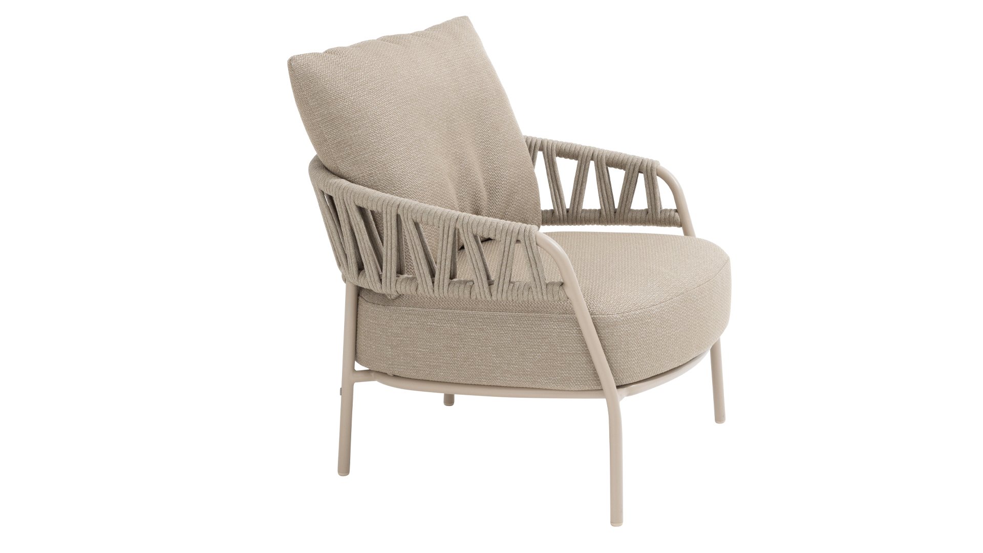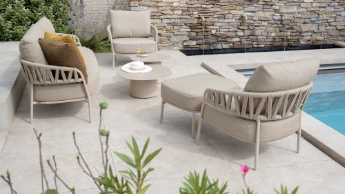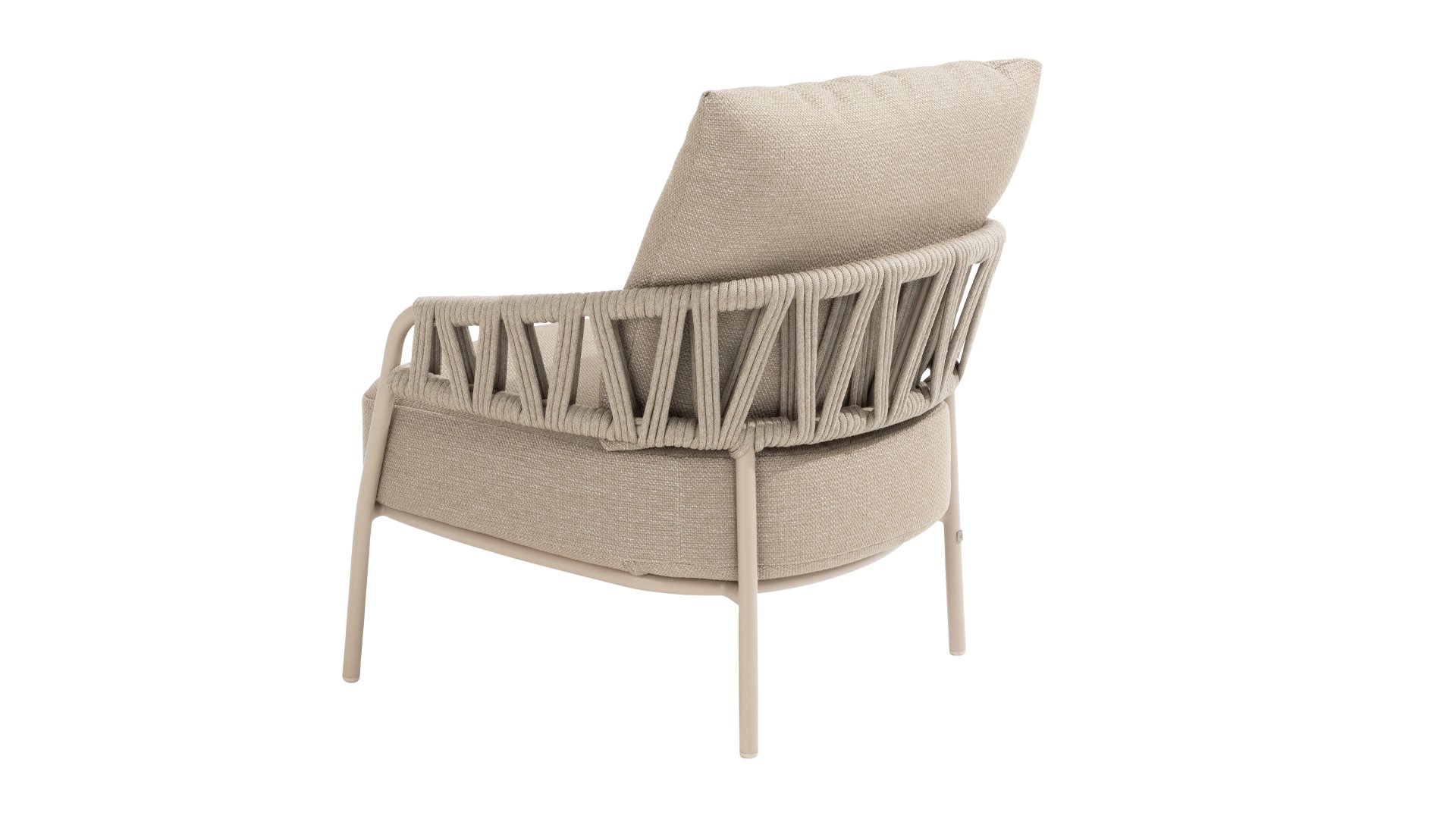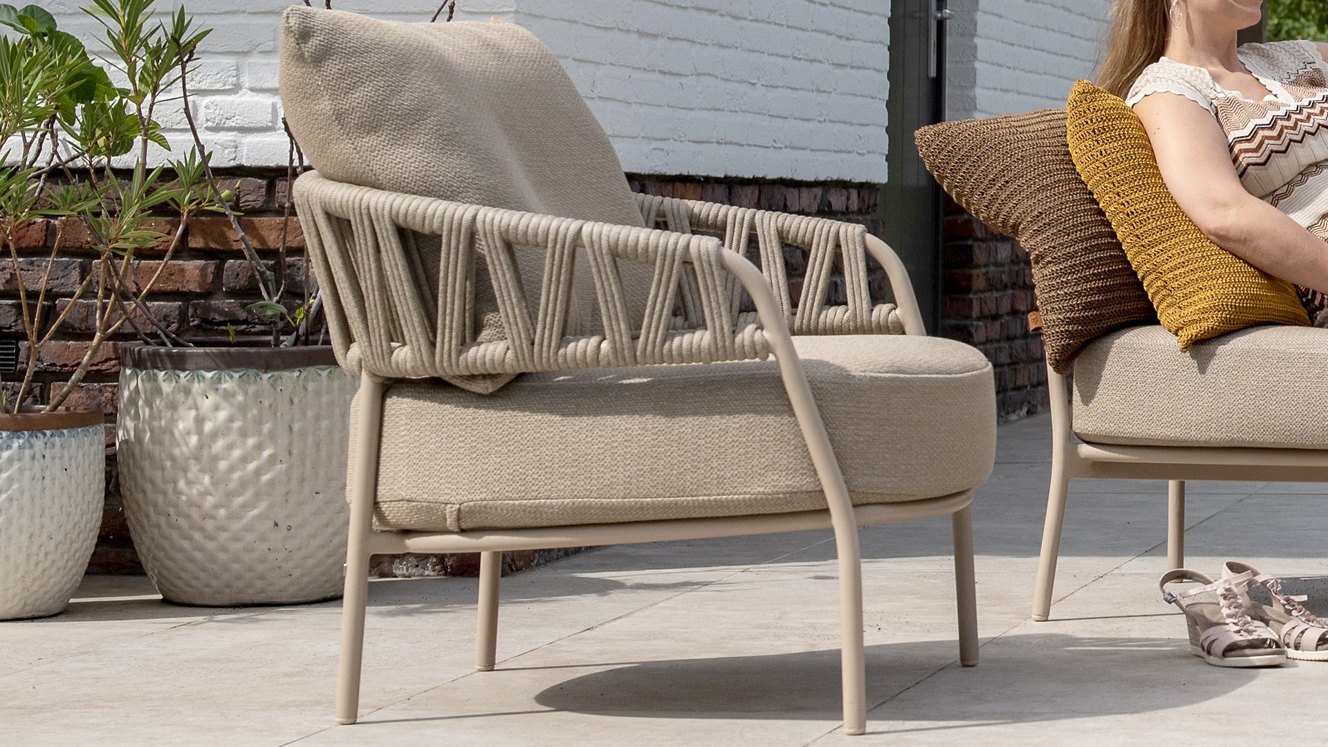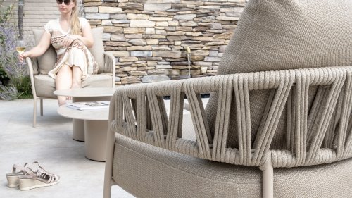 Calma by Taste by 4 Seasons – Taupe rope, latte frame, and ultimate seating comfort.