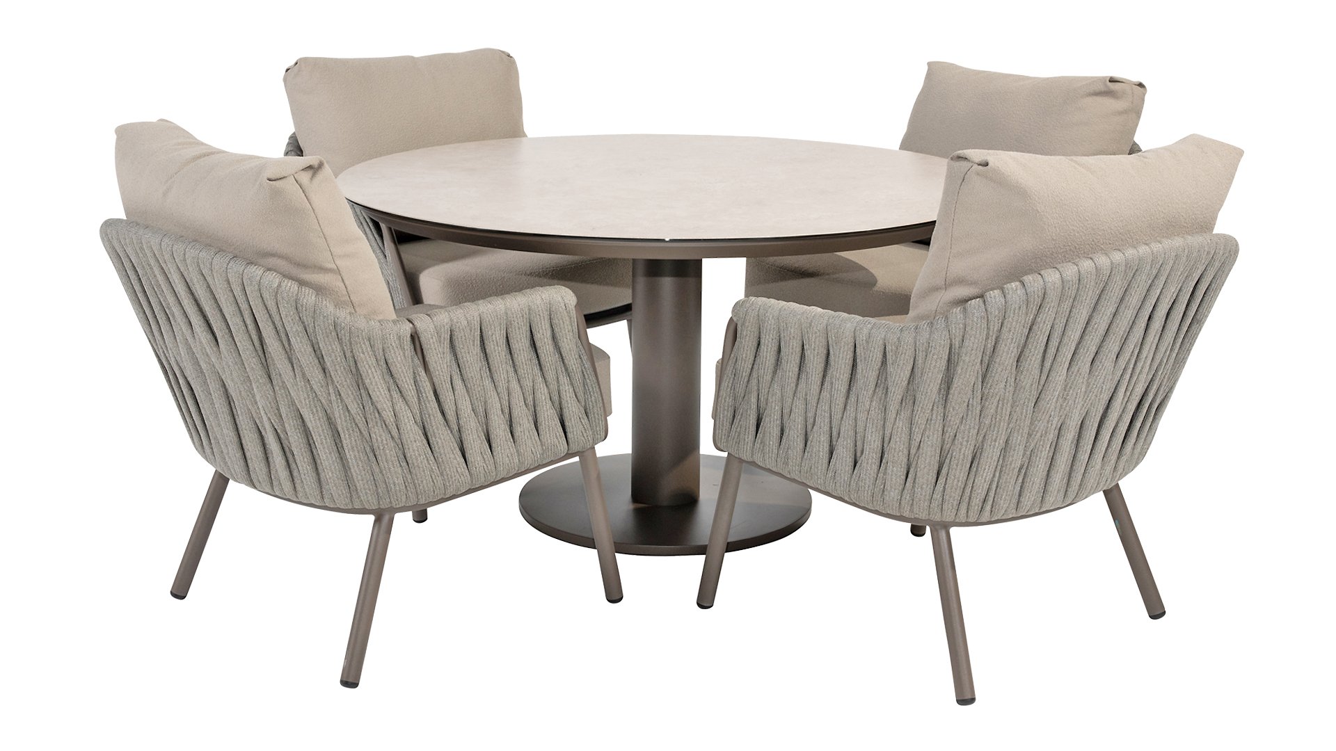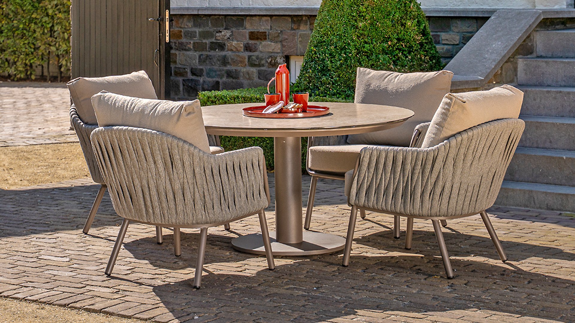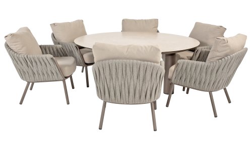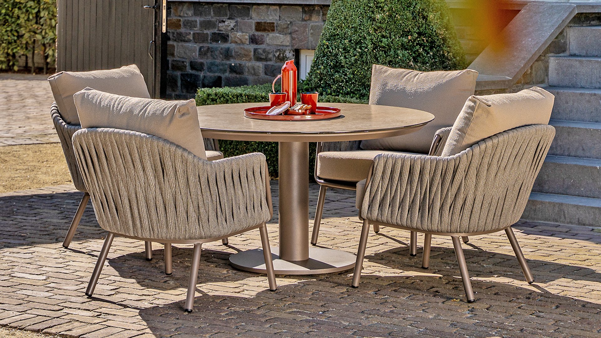 Taste by 4 Seasons Outdoor Cannes Low Dining Set – Comfortable & Stylish: The Taste Cannes Low Dining Set combines luxury with relaxed outdoor living. This set is relaxed, informal, and exceptionally comfortable. Unlike traditional dining sets, a low dining set is lower in height, allowing you to dine at a comfortable lounge height and enjoy a cozy, relaxed atmosphere. Perfect for long evenings outdoors, casual dinners, or drinks with friends and family. The terre-colored, powder-coated aluminum frame elegantly contrasts with the finely woven, light gray rope, giving the set a modern and inviting look. The generous Olefin cushions in soft gray not only offer ultimate comfort but are also highly resistant to UV and weather influences.