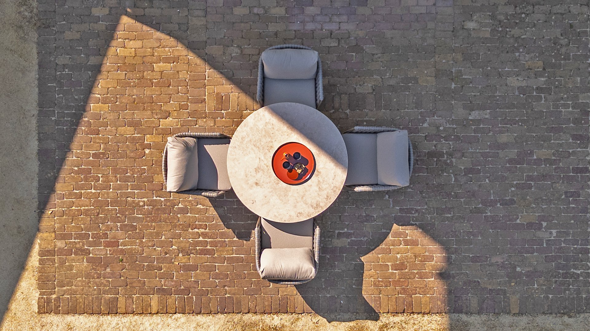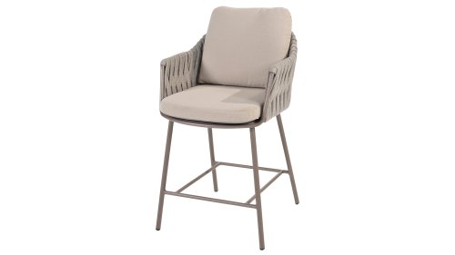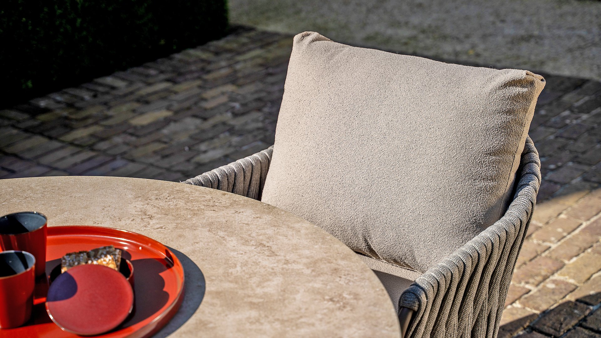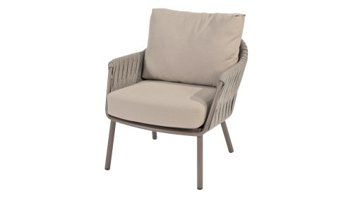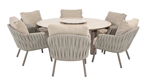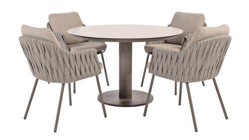 Taste by 4 Seasons Outdoor Cannes Low Dining Set – Comfortable & Stylish: The Taste Cannes Low Dining Set combines luxury with relaxed outdoor living. This set is relaxed, informal, and exceptionally comfortable. Unlike traditional dining sets, a low dining set is lower in height, allowing you to dine at a comfortable lounge height and enjoy a cozy, relaxed atmosphere. Perfect for long evenings outdoors, casual dinners, or drinks with friends and family. The terre-colored, powder-coated aluminum frame elegantly contrasts with the finely woven, light gray rope, giving the set a modern and inviting look. The generous Olefin cushions in soft gray not only offer ultimate comfort but are also highly resistant to UV and weather influences.