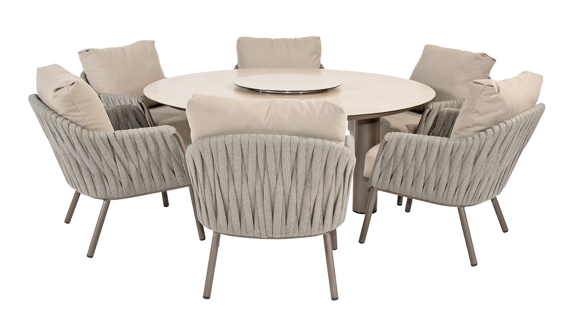 The Taste Cannes Low Dining set combines luxury with relaxed outdoor living. This set is relaxed, informal, and exceptionally comfortable. Unlike traditional dining sets, a low dining set is lower in height, allowing you to dine at a comfortable lounge height and enjoy a cozy, relaxed atmosphere. Perfect for long evenings outdoors, casual dinners, or drinks with friends and family. The terre-colored, powder-coated aluminum frame elegantly contrasts with the finely woven, light gray rope, giving the set a modern and inviting look. The generous Olefin cushions in a soft gray offer not only ultimate comfort but are also highly resistant to UV and weather influences. In addition to this low dining set, the Taste 4Seasons Cannes collection is also available as a garden set, lounge set, and high dining set, allowing you to furnish your outdoor space with the same stylish ambiance.