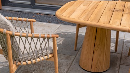 The round legs provide stability and contribute to the sleek design of the table. The natural tones and the beautiful grain of the teak wood ensure that each table is unique, with a warm, inviting look. This table is perfect for social gatherings and everyday meals. A real eye-catcher that combines functionality and aesthetics. Also available in the following sizes: