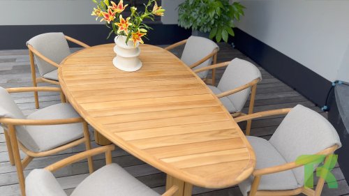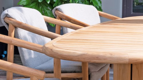 Teak is a natural product and particularly suitable for outdoor use. It is resistant to pests and mold and can withstand sun, rain, and snow. Over time, teak develops a silver-gray patina. Teak is a robust material and requires little maintenance. If you prefer the original color of your teak, you can easily prevent it from turning gray by regularly using our care product. You can also clean teak with green soap. We offer a warranty on all manufacturing and construction defects. This does not include the working of teak. When you choose teak, we expect you to appreciate these qualities. Hairline cracks that may develop, knots in the teak, and rough surfaces or irregular discoloration over time are not covered by our warranty. These characteristics give teak its unique character and appearance; they are part of its natural properties. Be careful with a flowerpot or vase on your teak garden table, as this can cause persistent rings or color variations. Imperfections are common; these imperfections are characteristic of this product. These irregularities can never give ground to a claim, warranty, or complaint. This is a signs ans signature of originality!