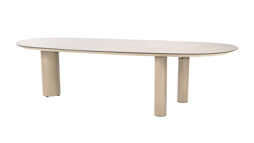 The striking mango-shaped tabletop gives the Denia table a playful, organic silhouette that immediately catches the eye. Available in two colors – Latte and Terre – and two sizes – 290x110x75 cm and 240x105x75 cm. The tabletop is made of ceramic on glass, a strong and easy-to-maintain combination that is resistant to scratches, heat, and stains. The three-legged base, made of powder-coated aluminum, ensures maximum stability and a modern look. View all the options in the Taste Denia table series below: