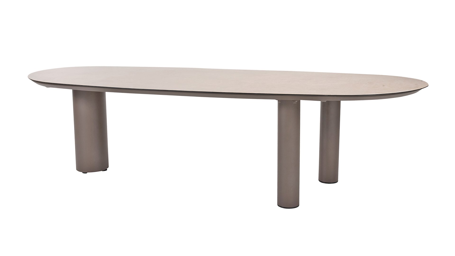 The striking mango-shaped tabletop gives the Denia table a playful, organic silhouette that immediately catches the eye. Available in two colors – Latte and Terre – and two sizes – 290x110x75 cm and 240x105x75 cm. The tabletop is made of ceramic on glass, a strong and easy-to-maintain combination that is resistant to scratches, heat, and stains. The three-legged base, made of powder-coated aluminum, ensures maximum stability and a modern look. View all the options in the Taste Denia table series below:
