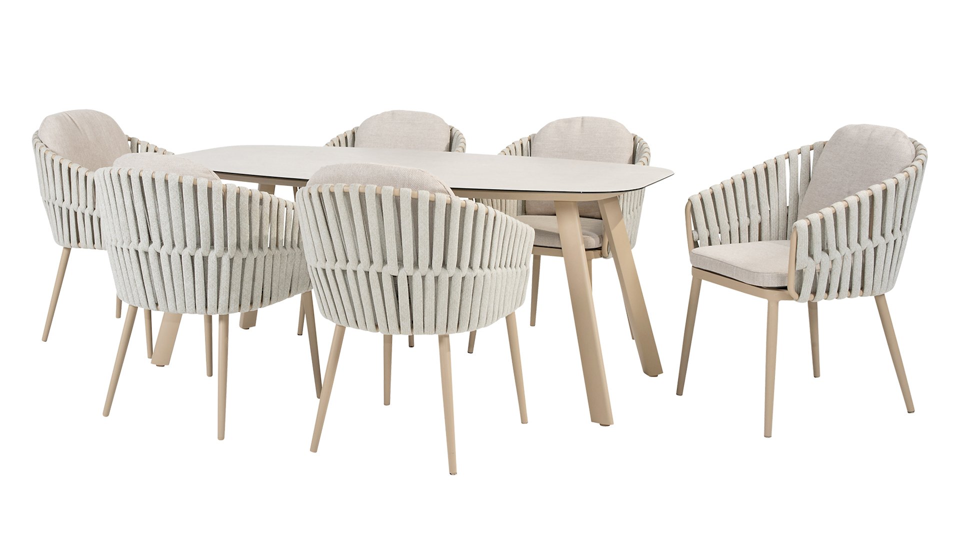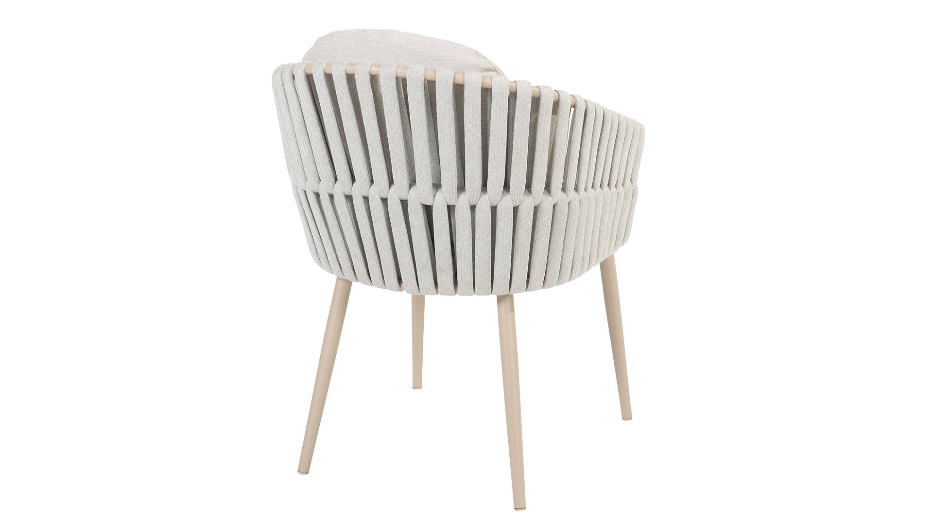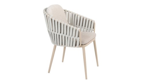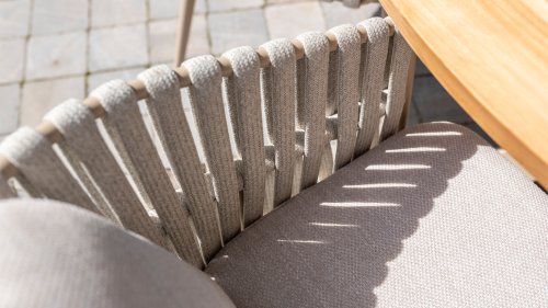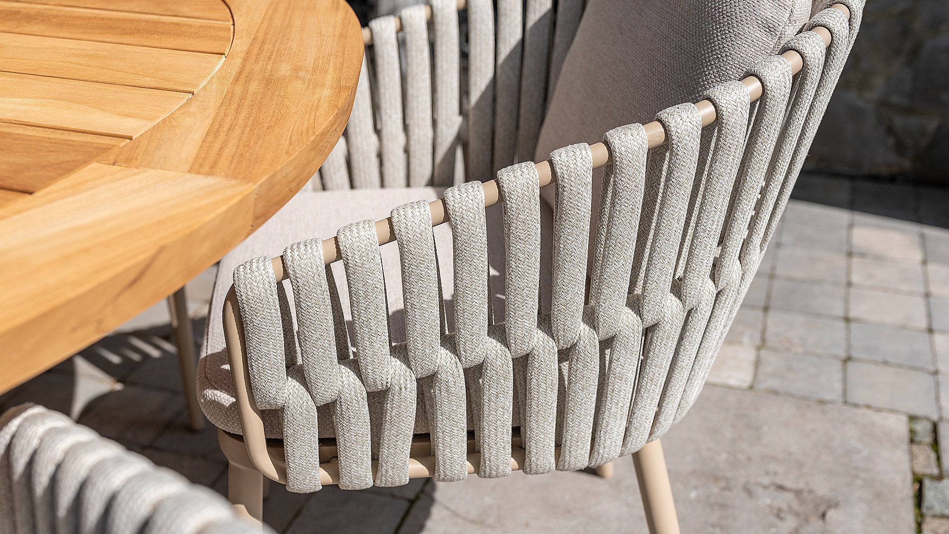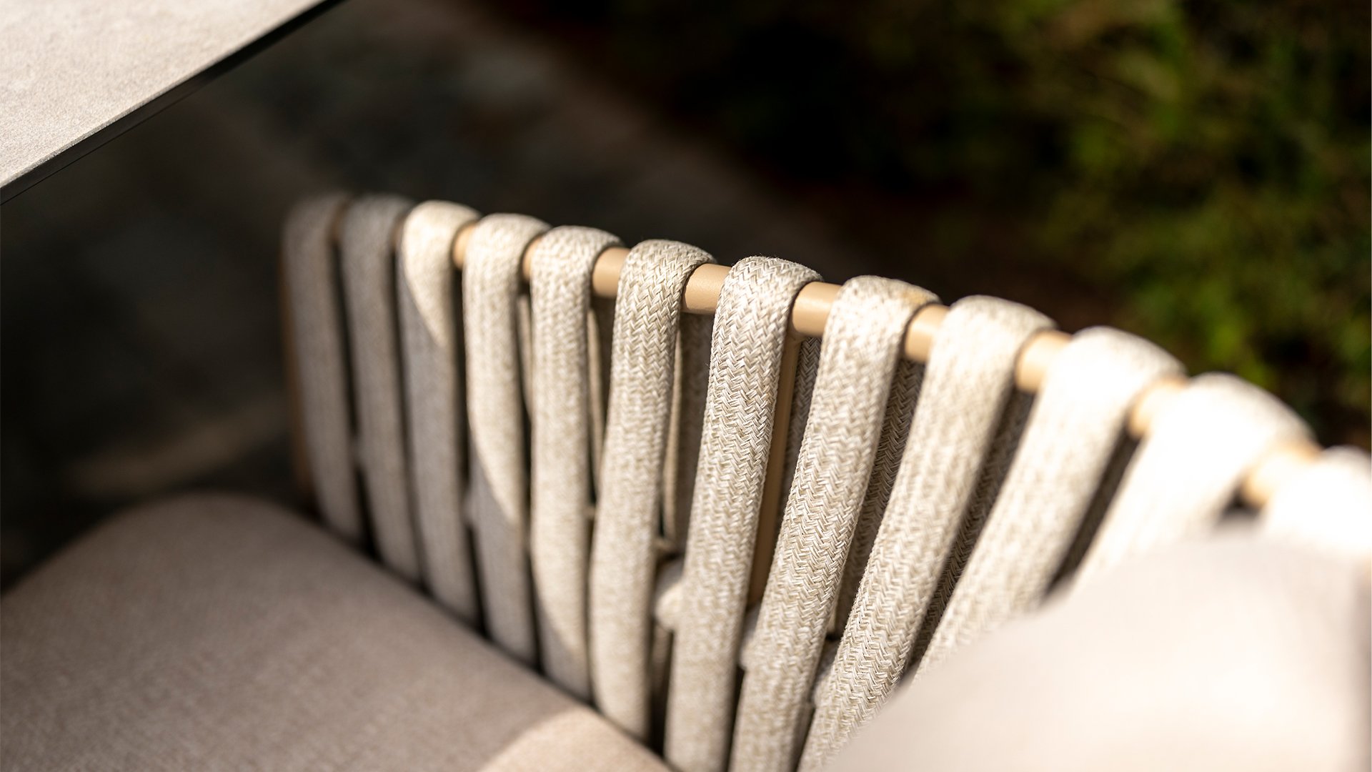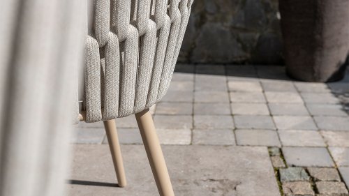 Passion for Eva Designed with an eye for detail. The thick, soft rope straps follow the beautiful organic shape of the frame. Add to that the delicious comfortable cushions and you'll understand why we are so enthusiastic about the Taste by 4 Seasons Outdoor Eva lounge & dining set. The Taste 4SO Eva dining chair has a modern appearance. The chair comes with soft cushions and has a contemporary aluminum frame with matching latte rope upholstery. The thick rope combines beautifully with the latte frame and, together with the cushions, provides comfortable seating. A color that can best be described as tasteful beige.