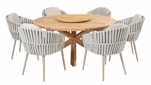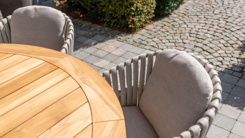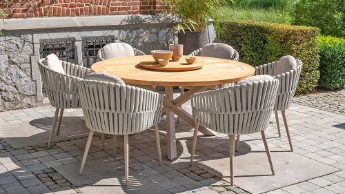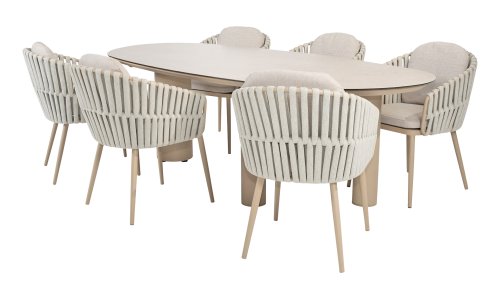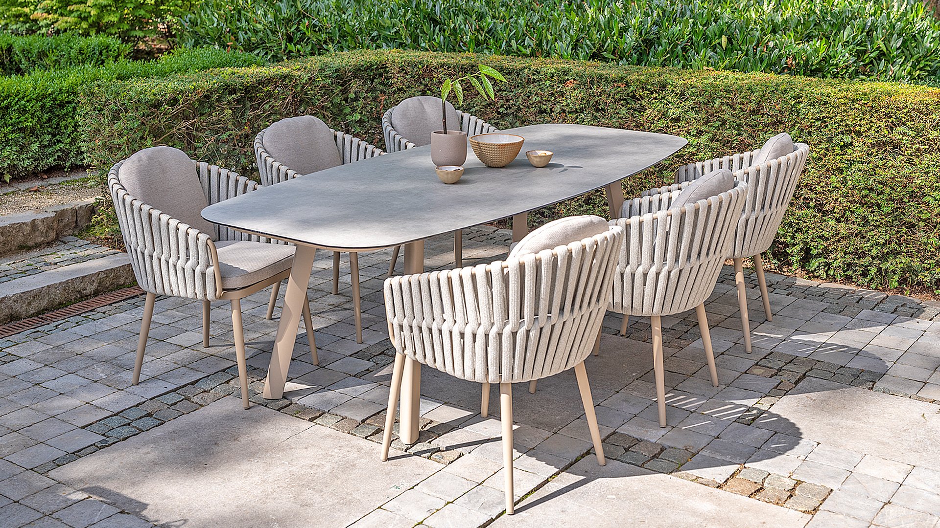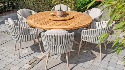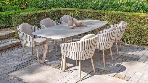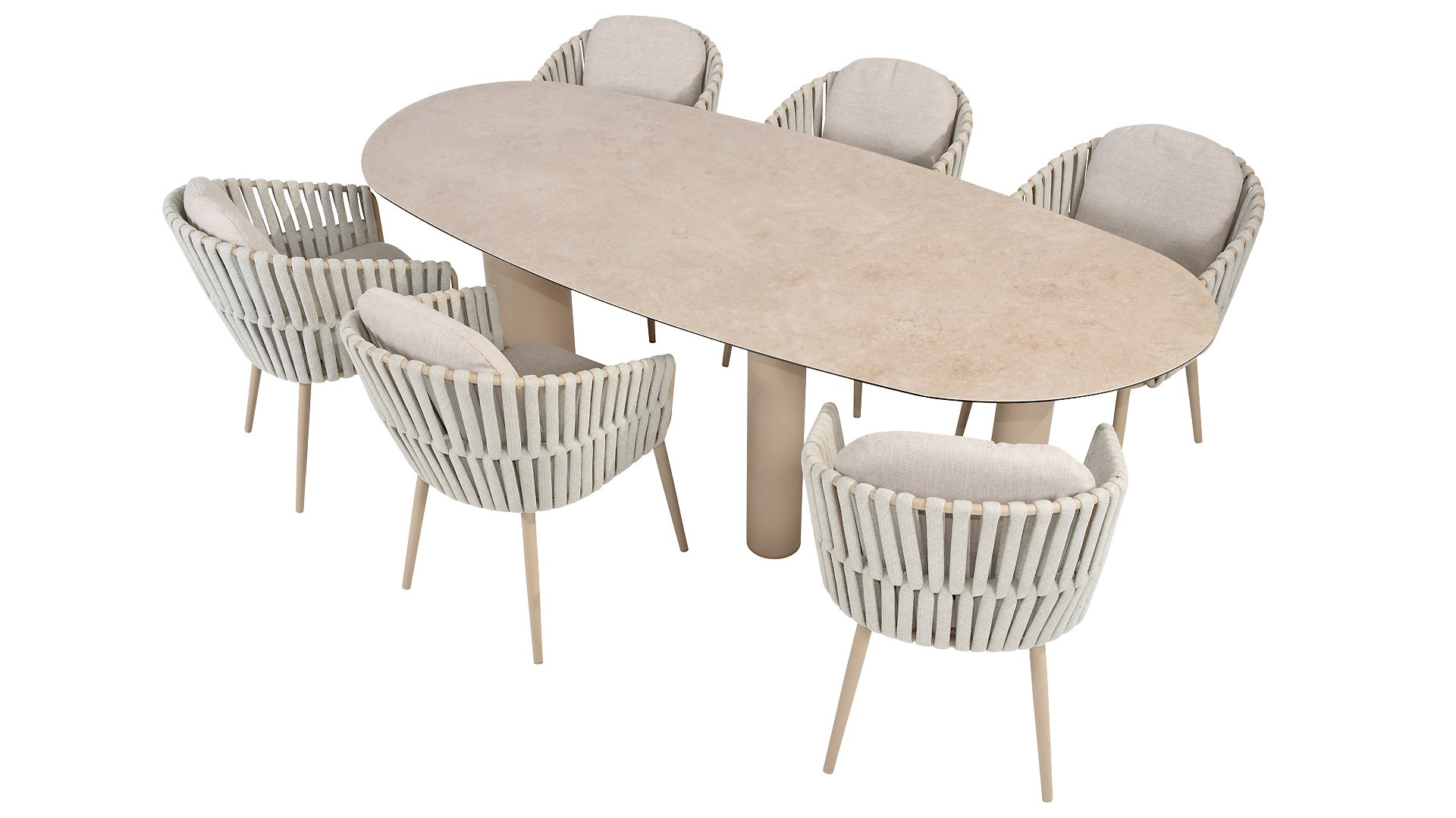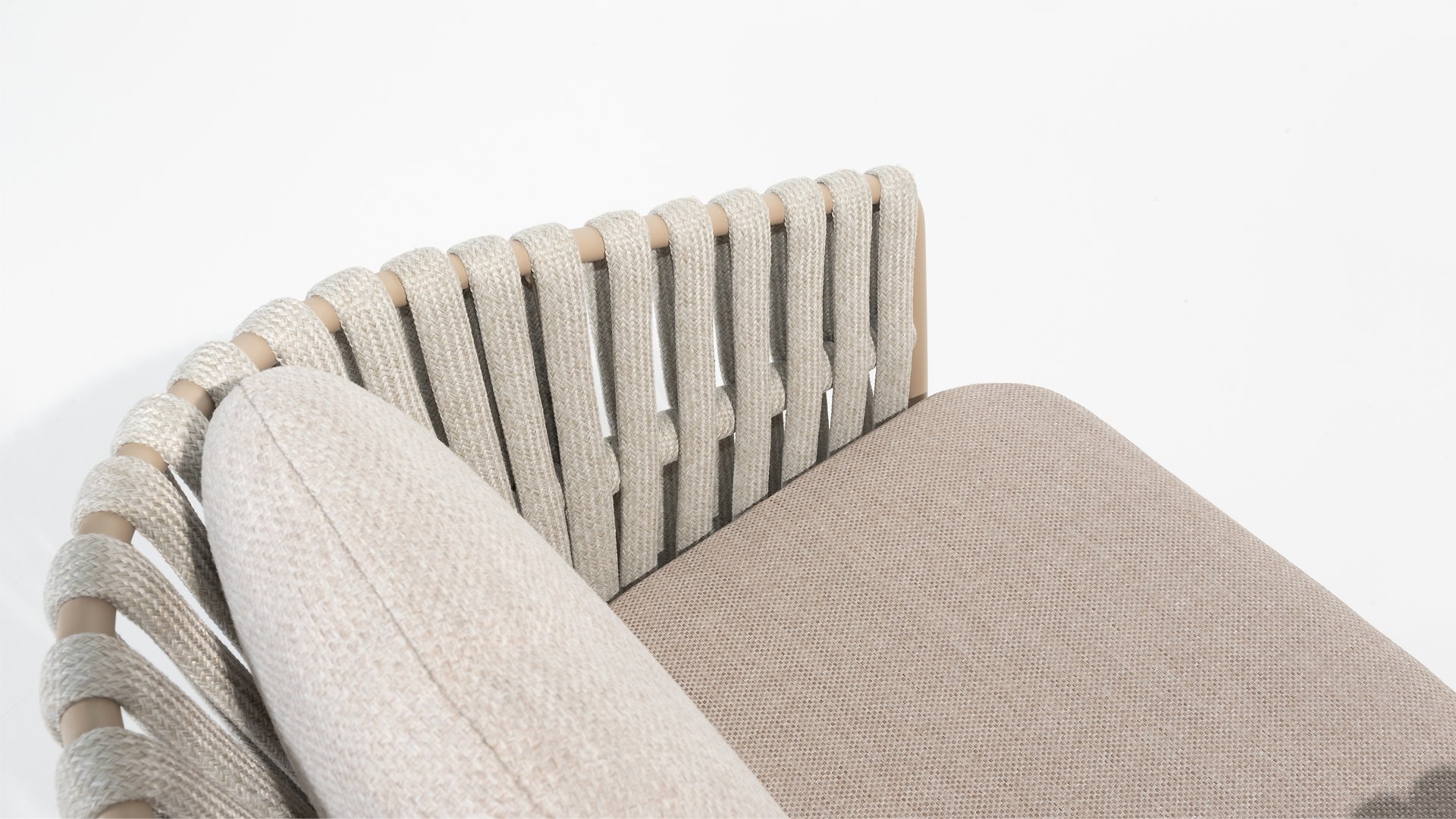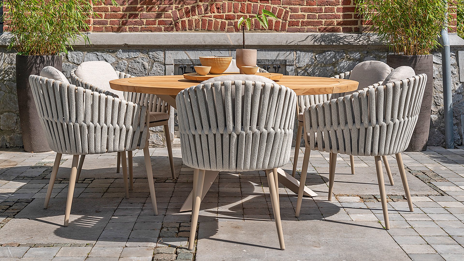 Passion for Eva Designed with an eye for detail. The thick, soft rope straps follow the beautiful organic shape of the frame. Add to that the delicious comfortable cushions and you'll understand why we are so enthusiastic about the Taste by 4 Seasons Outdoor Eva lounge & dining set. The Taste 4SO Eva dining chair has a modern appearance. The chair comes with soft cushions and has a contemporary aluminum frame with matching latte rope upholstery. The thick rope combines beautifully with the latte frame and, together with the cushions, provides comfortable seating. A color that can best be described as tasteful beige.