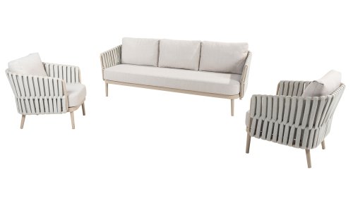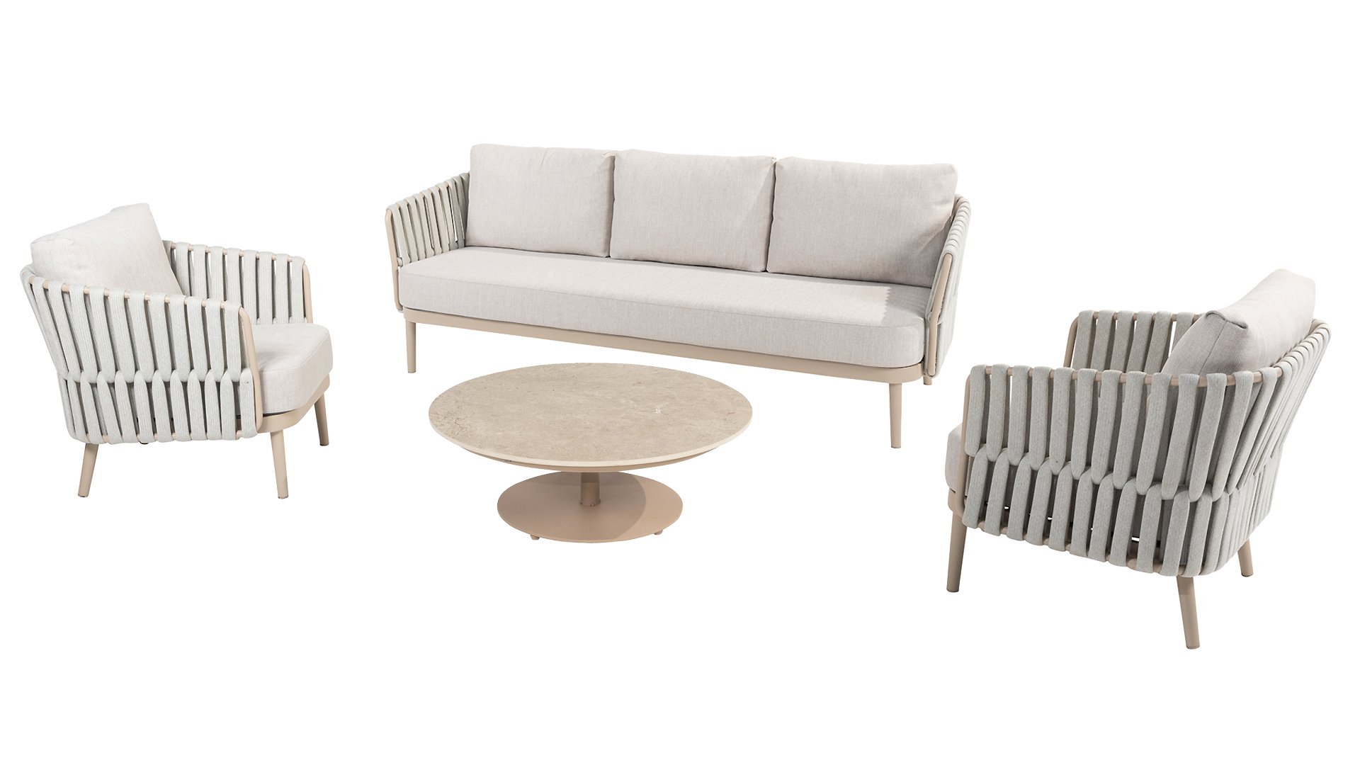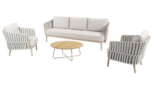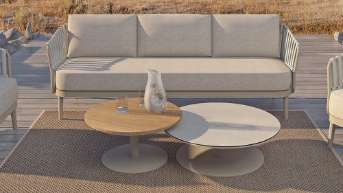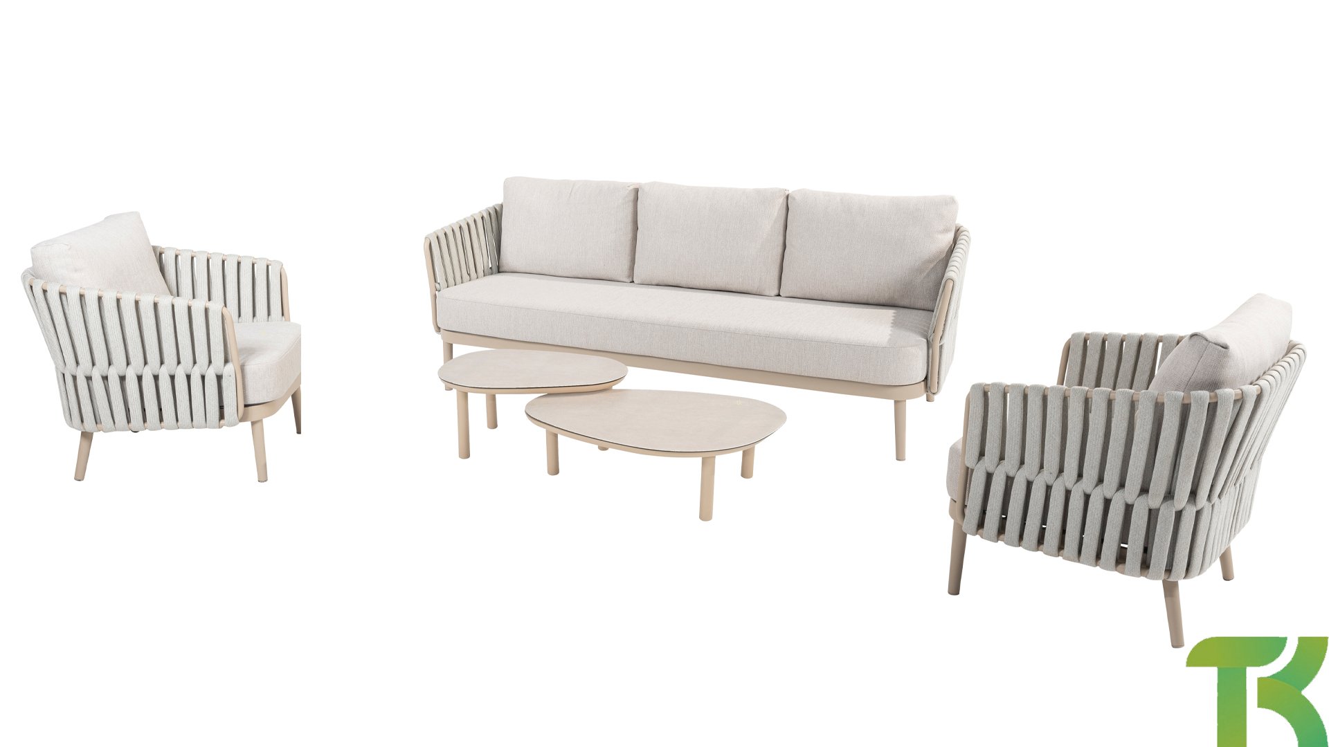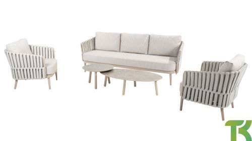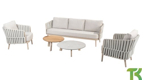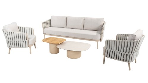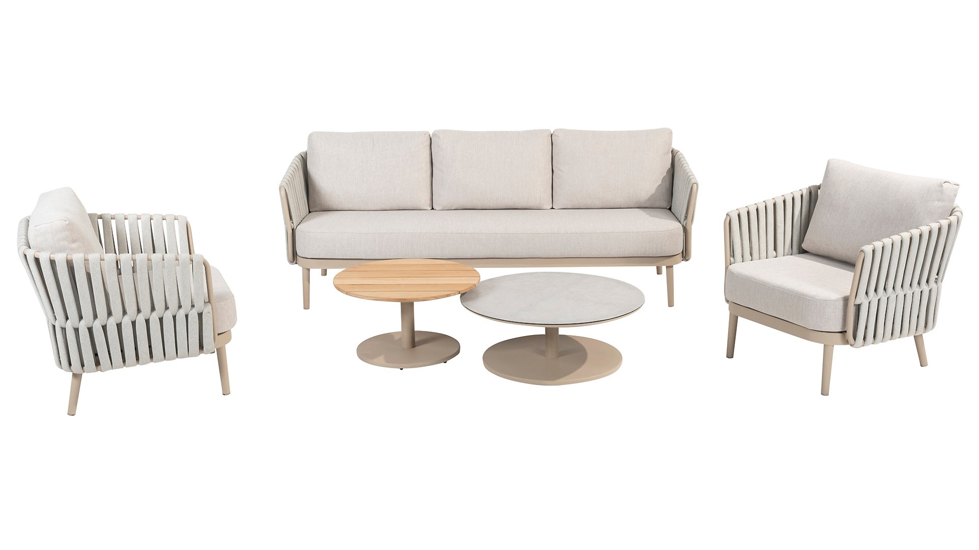 The Taste 4SO Eva lounge set has a modern appearance. The set comes with soft cushions and has a contemporary aluminum frame with matching latte rope upholstery. The thick rope combines beautifully with the latte frame and, together with the cushions, provides comfortable seating comfort. A color best described as tasteful beige. The Eva lounge set consists of a 3-seater sofa and two lounge chairs. There is also the Eva dining chair, allowing you to stylishly combine on your terrace.A beautiful combination of different materials. The Taste 4SO Sara coffee table set is a true feast for the eyes. Not only beautiful to look at but also practical. The central leg makes the tables very stable and there are no legs in the way. The beautiful latte color gives a warm appearance to the coffee tables. The table of 80 ø cm has a ceramic top, and the smaller table of 65 ø cm has a beautiful teak top.