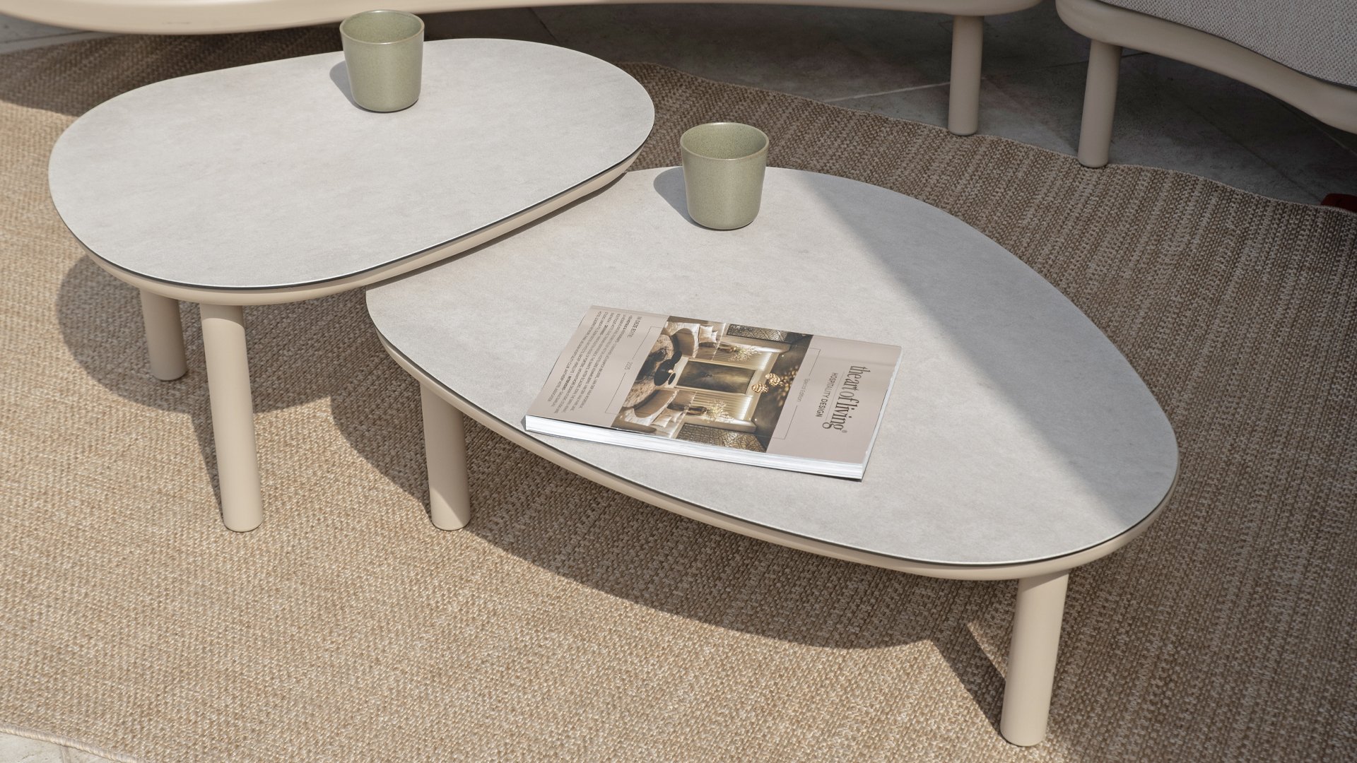 Bring a touch of elegance and refinement to your living space with the Monroe coffee table series from Taste by 4 Seasons Outdoor. This beautiful set consists of two organically shaped tables with pebble-shaped tops – playful, yet perfectly balanced. Thanks to its distinctive design, the Monroe becomes a stylish focal point of any outdoor or indoor space. The tops are crafted from printed ceramic on glass, creating a luxurious look and a durable, easy-to-maintain surface. The powder-coated aluminum base provides a sturdy foundation with a modern, airy look. The set comes in two sizes – Ø65xH32cm and Ø80xH27cm – that fit together perfectly or can be placed separately for a dynamic ensemble. Available in three stylish colors – Terre, Latte, and Anthracite – so you can effortlessly coordinate the Monroe with your interior or garden setting.