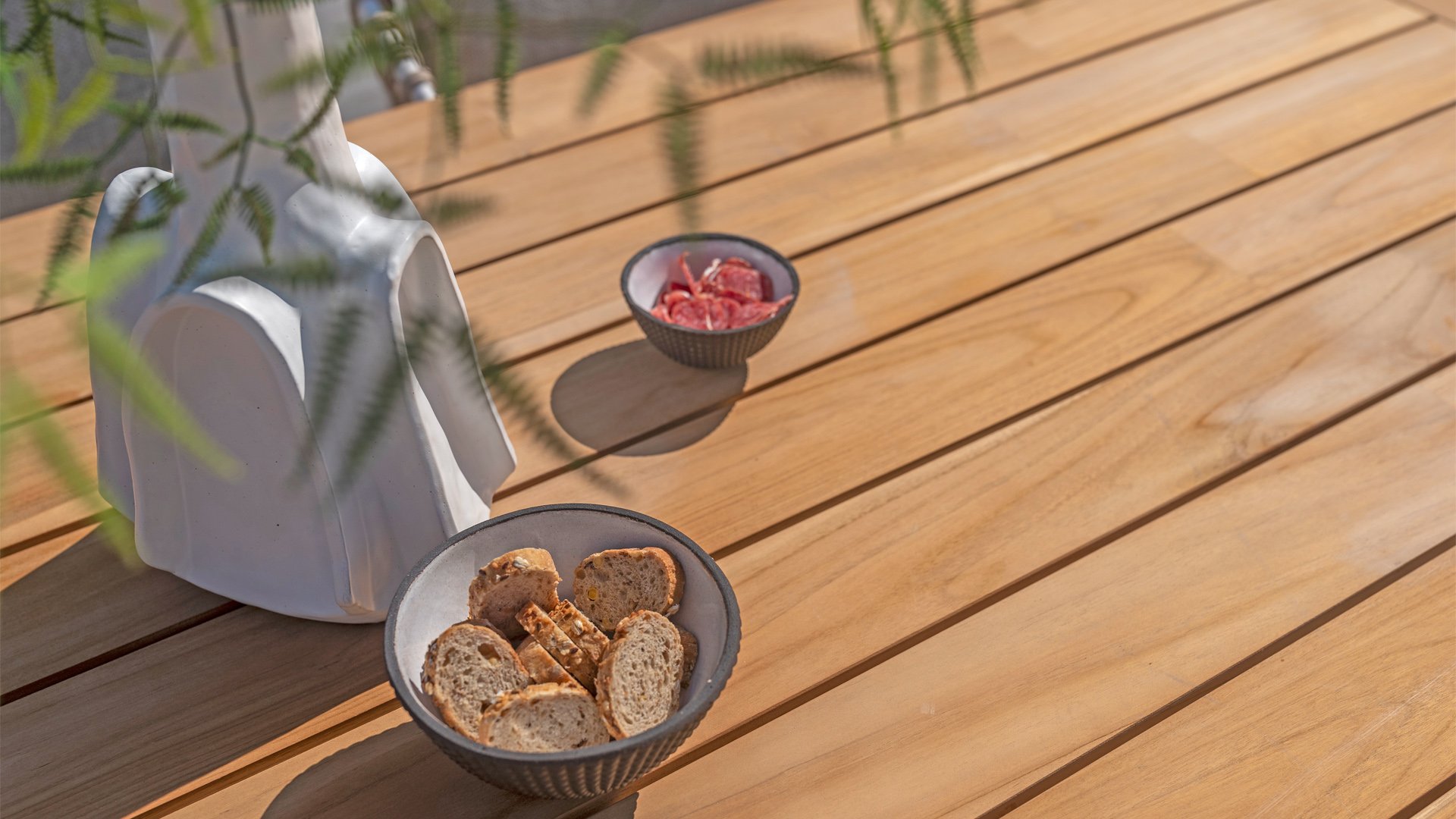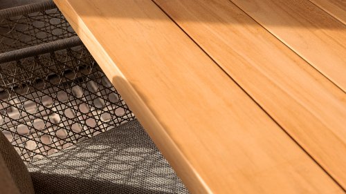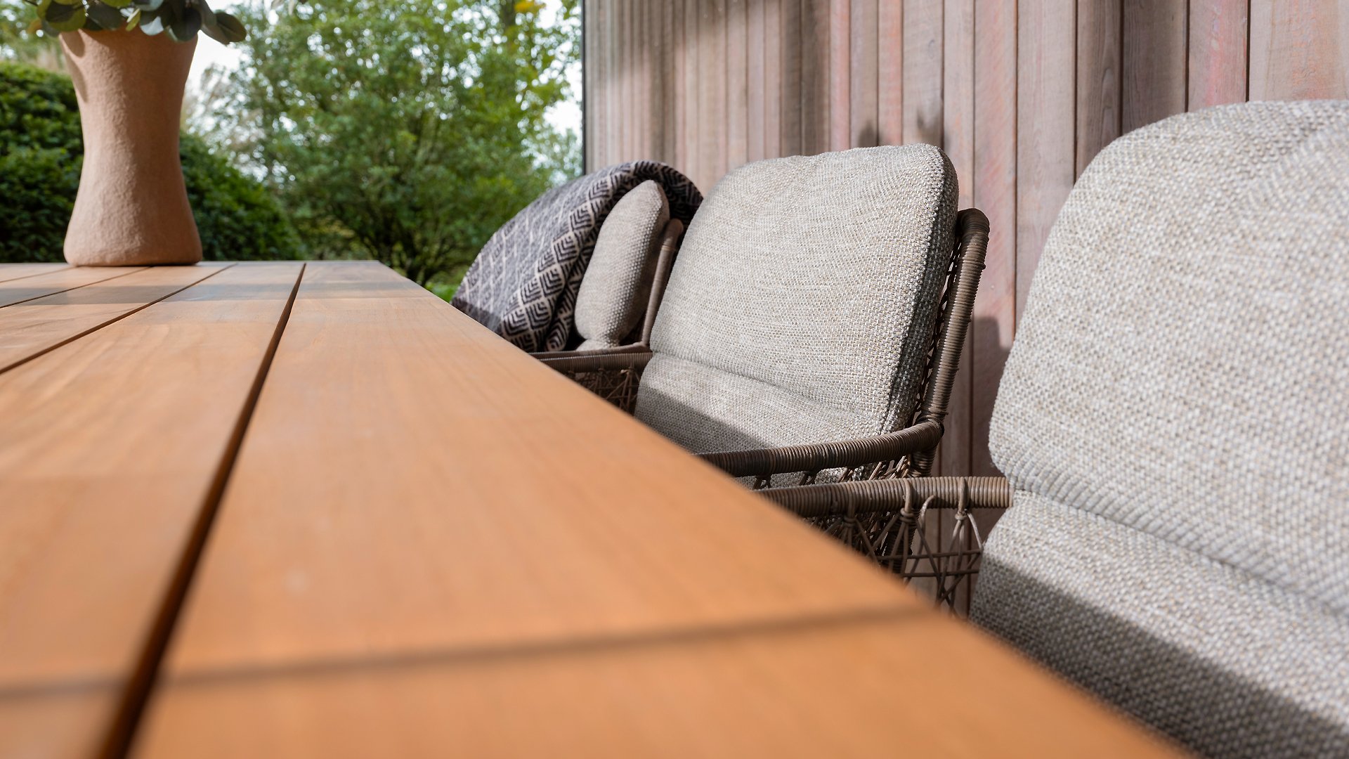 After the treatment(s) with Teak Cleaner (and possibly a color-influencing product), let the teak dry and add a treatment of 4 Seasons Outdoor – Teak Shield. This adds a transparent layer that is dirt and water repellent. Teak Shield prevents the most common stains, but we do recommend immediate cleaning when your teak has become dirty. Despite the use of Teak Shield, some stains can still cause permanent discoloration (such as tomato sauce) if you leave them on for a long time.