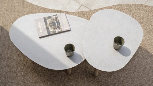 Bring a touch of elegance and refinement to your living space with the Monroe coffee table series from Taste by 4 Seasons Outdoor. This beautiful set consists of two organically shaped tables with pebble-shaped tops – playful, yet perfectly balanced. Thanks to its distinctive design, the Monroe becomes a stylish focal point of any outdoor or indoor space. The tops are crafted from printed ceramic on glass, creating a luxurious look and a durable, easy-to-maintain surface. The powder-coated aluminum base provides a sturdy foundation with a modern, airy look. The set comes in two sizes – Ø65xH32cm and Ø80xH27cm – that fit together perfectly or can be placed separately for a dynamic ensemble. Available in three stylish colors – Terre, Latte, and Anthracite – so you can effortlessly coordinate the Monroe with your interior or garden setting.