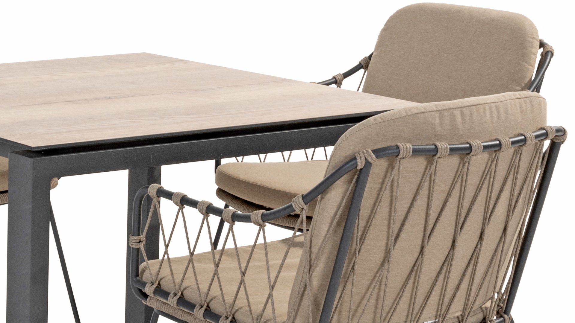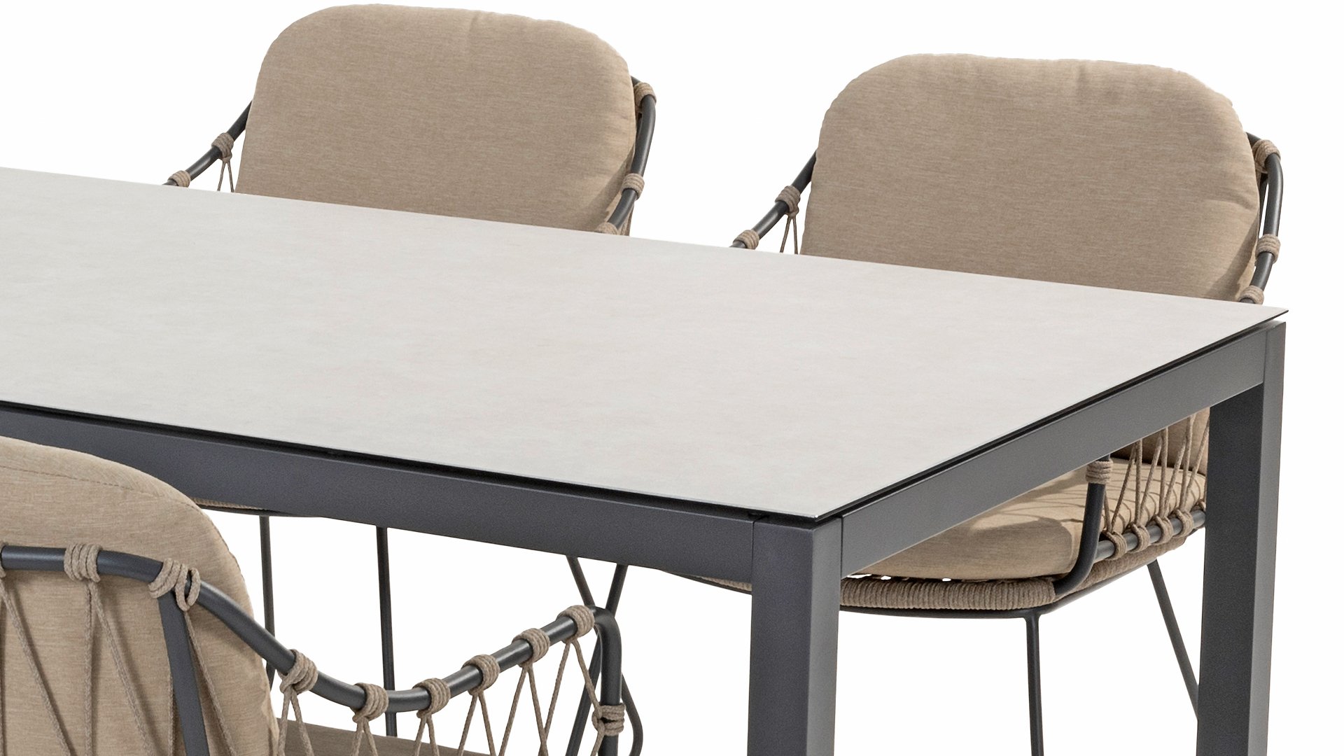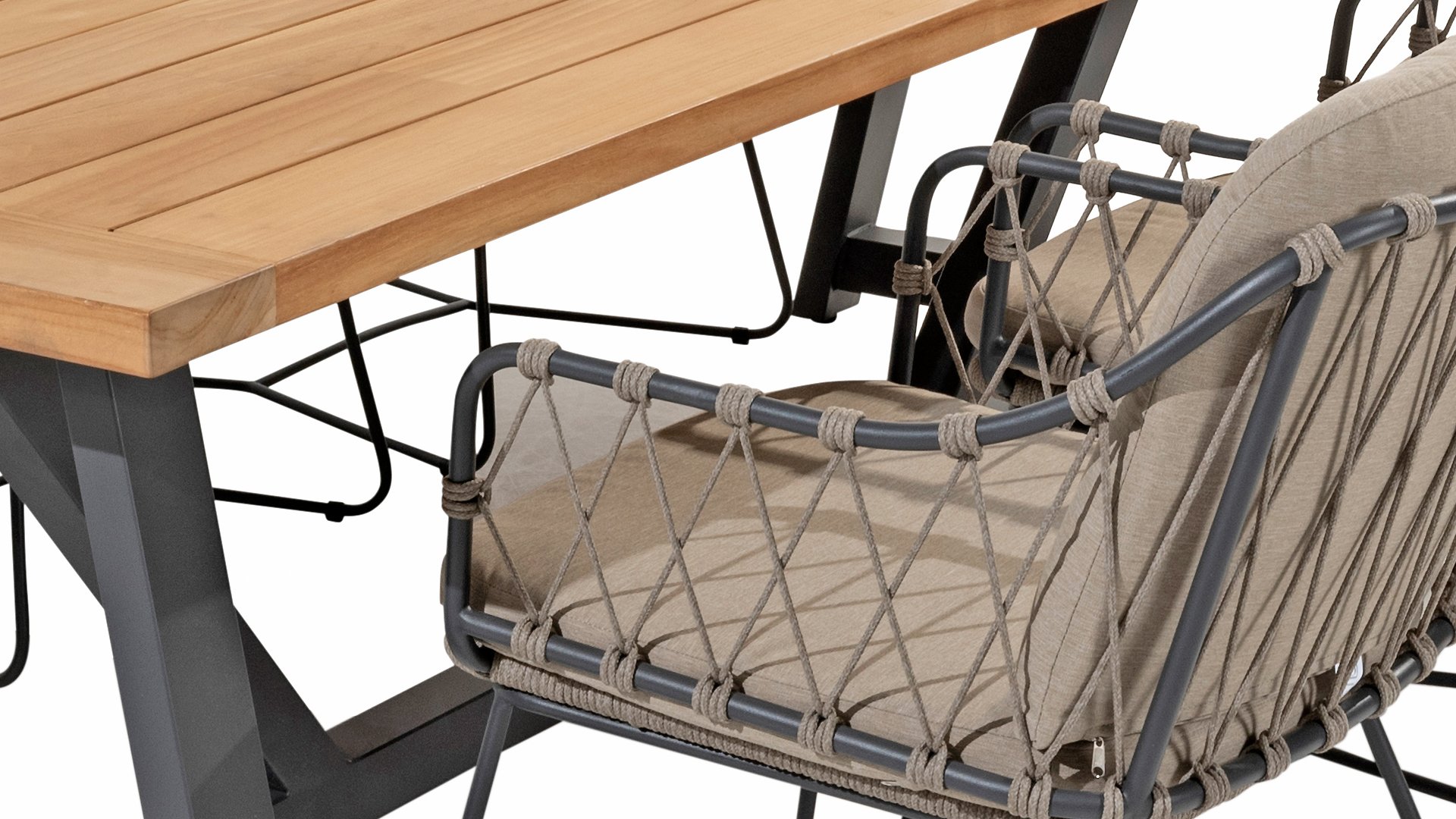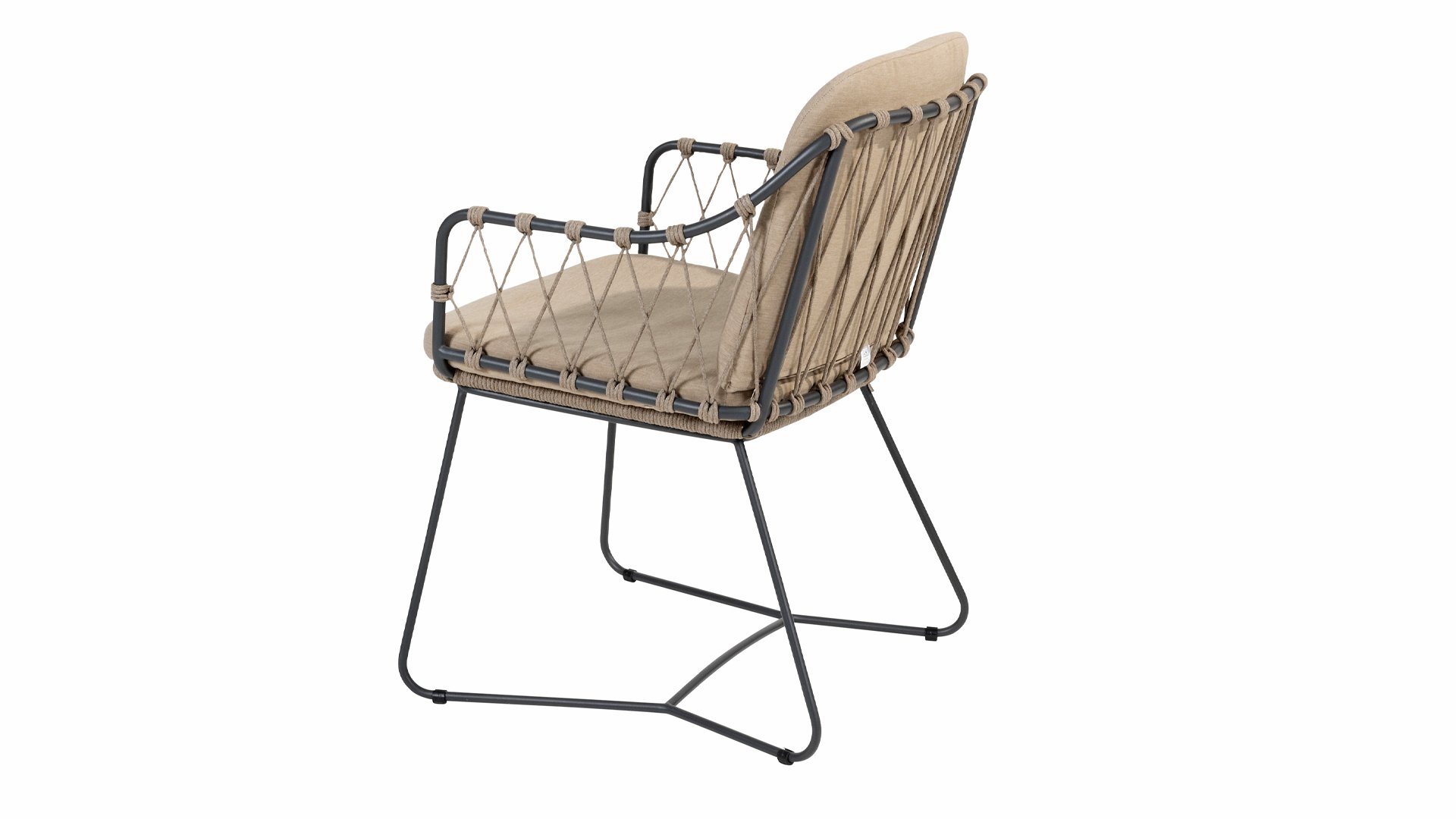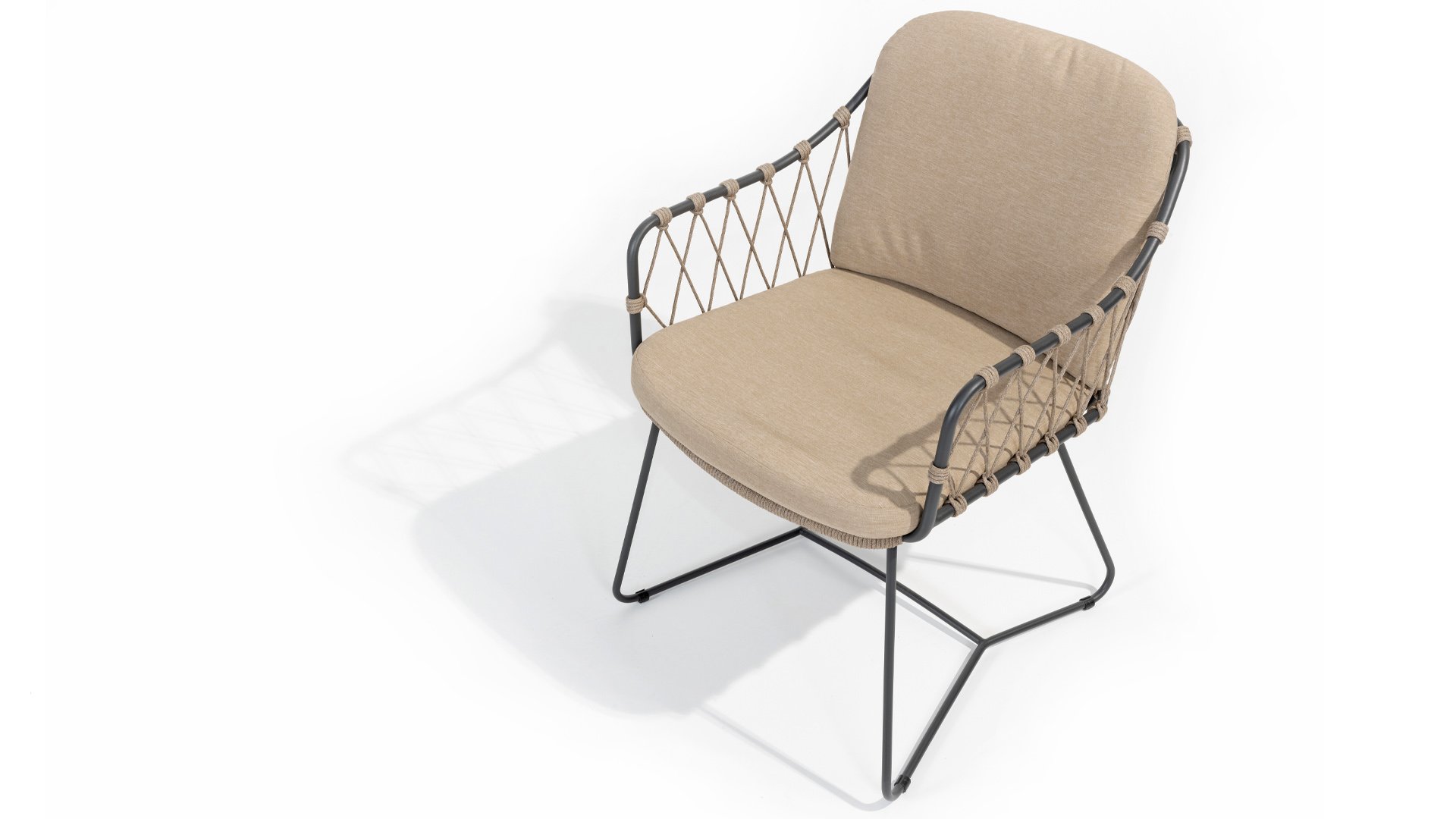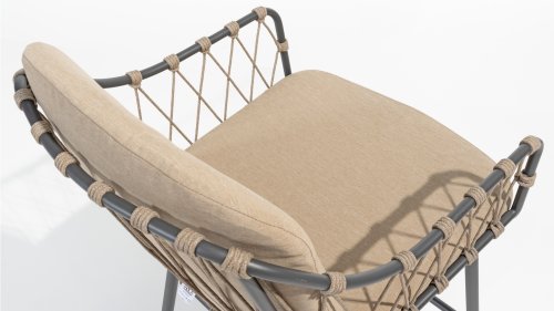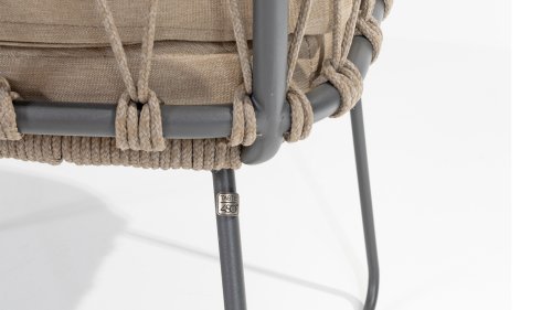 The Prego dining chair is made with high-quality taupe rope and has a sturdy frame made of anthracite stainless steel and aluminum, making it resistant to changing weather conditions. The included cushions provide extra comfort during long, relaxed dinners or cozy gatherings outdoors.